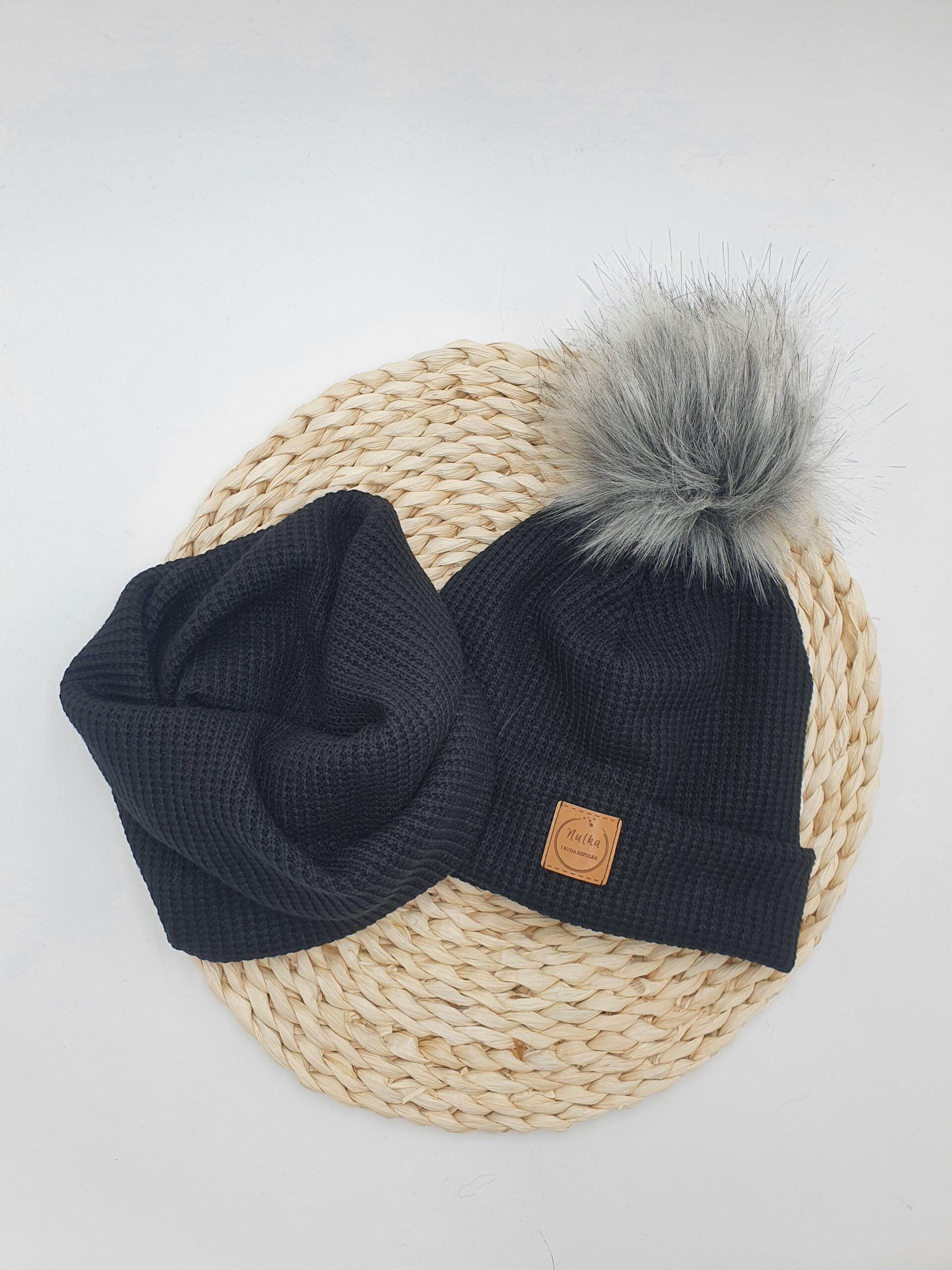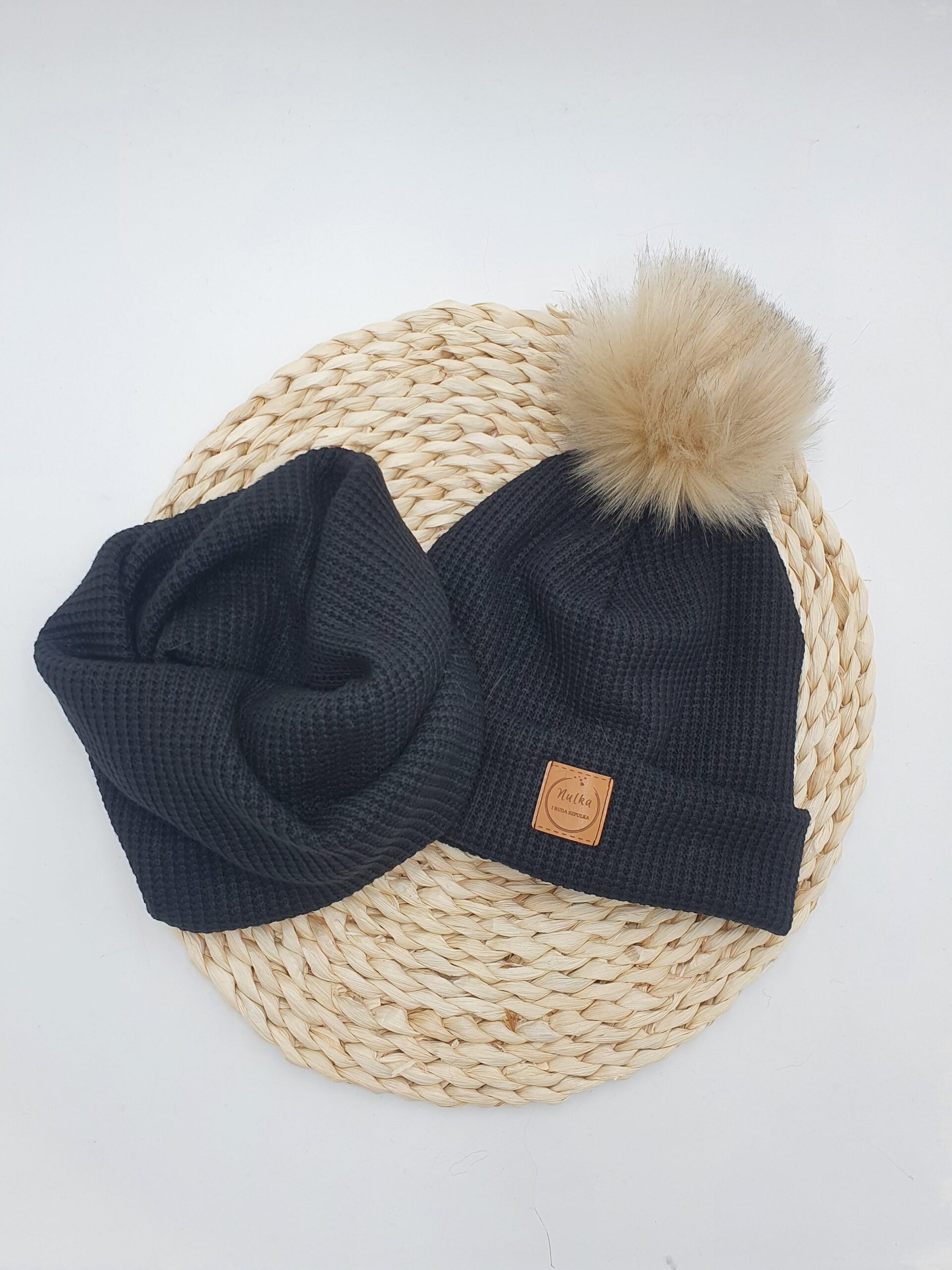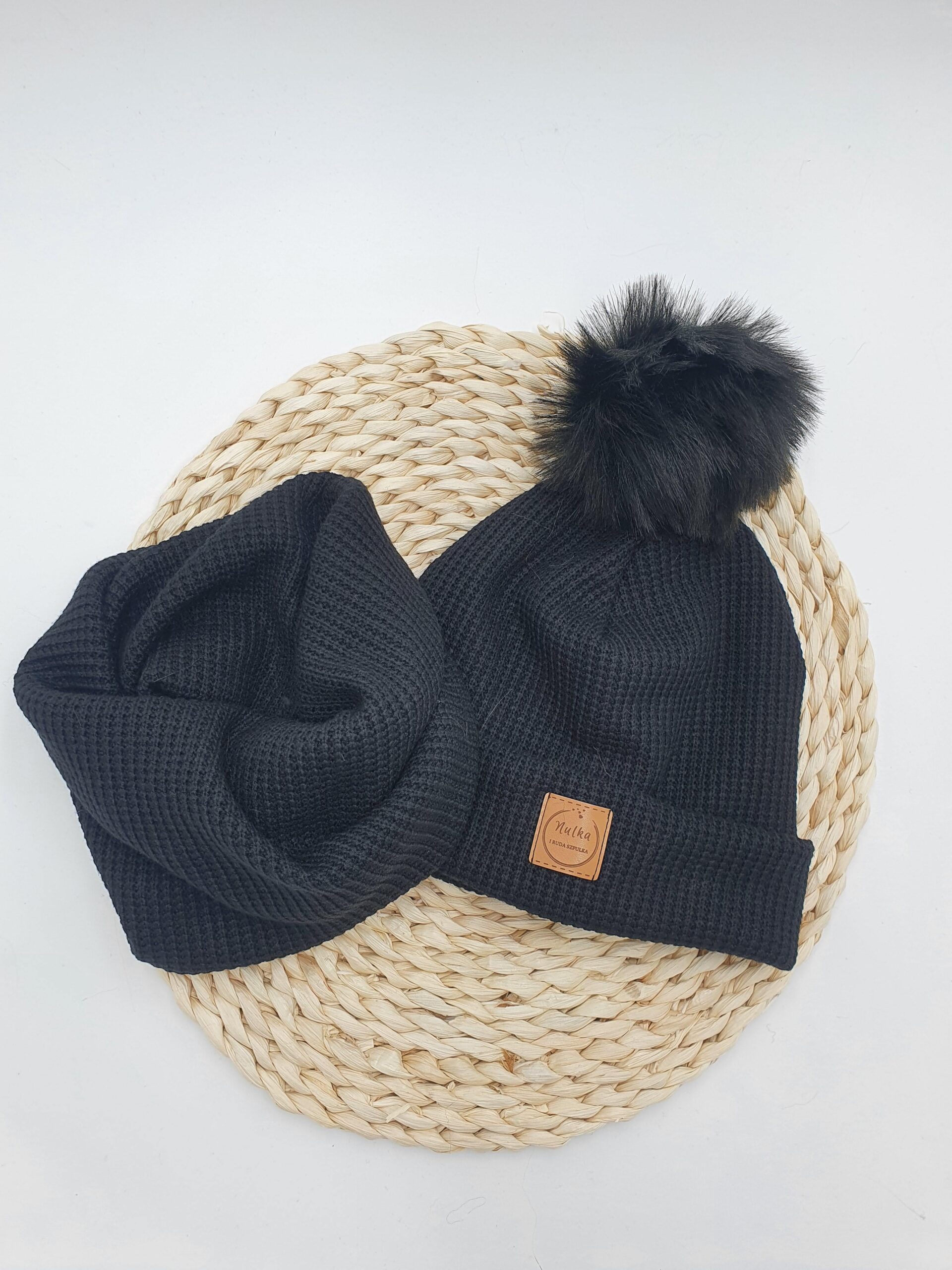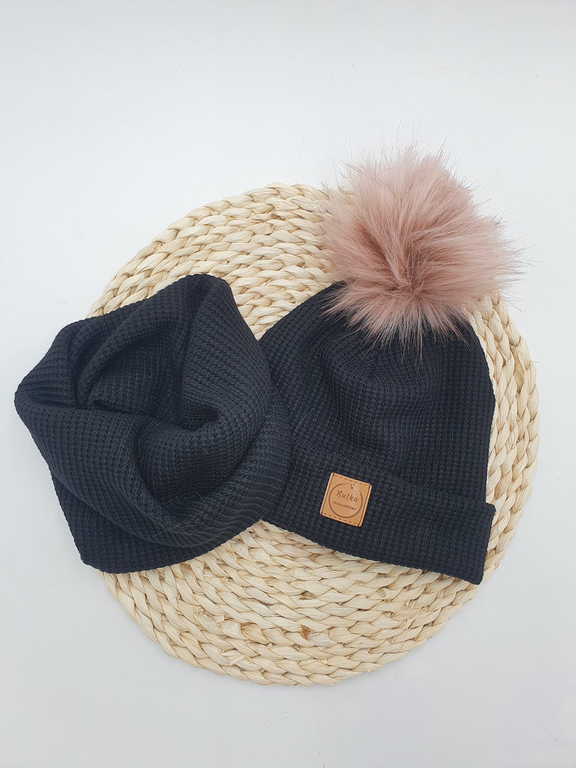Czapka z dzianiny sweterkowej w klasycznym czarnym kolorze, rozmiary 36-56. Pompony do wyboru w różnych kolorach.