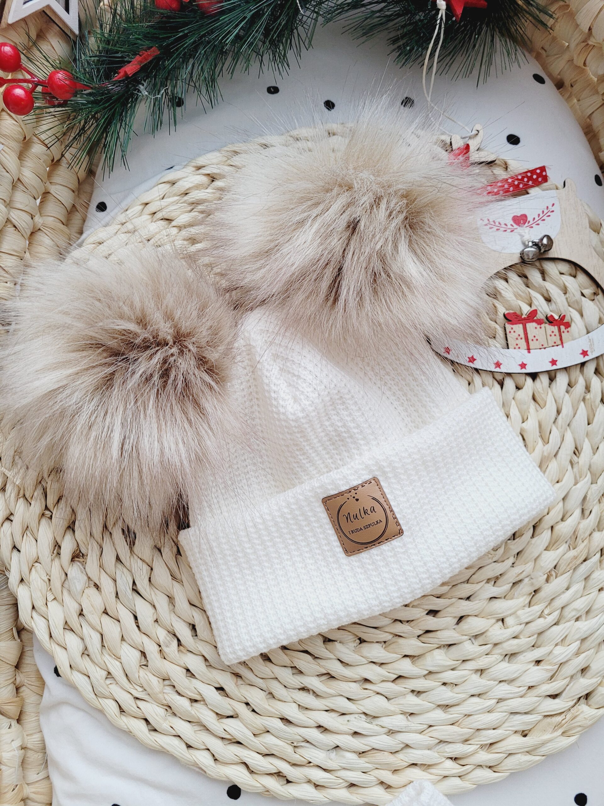 Czapka zimowa wiązana z pomponami dla chłopca lub dziewczynki w ponadczasowym kolorze ecru, rozmiary od 36 do 56.