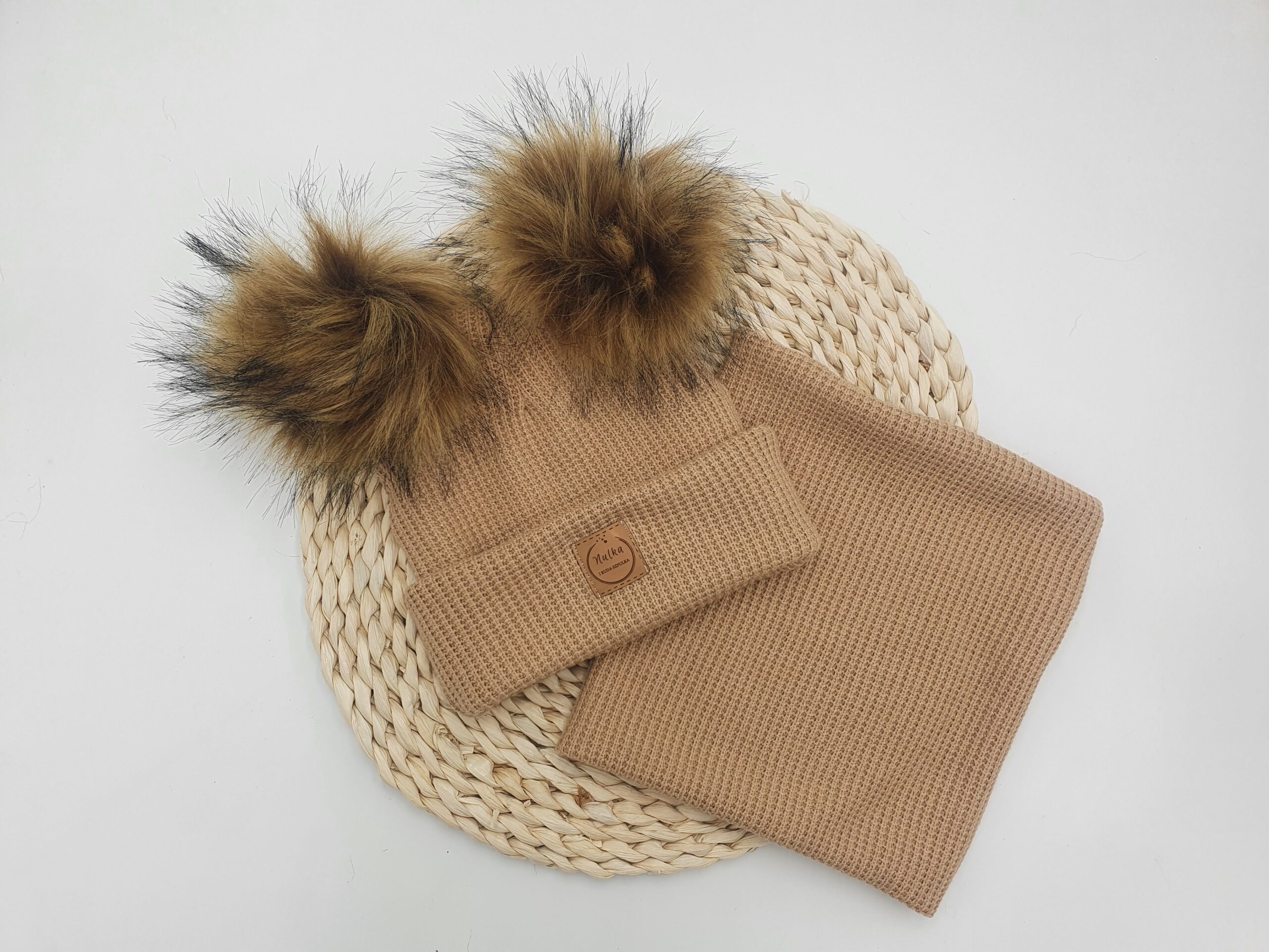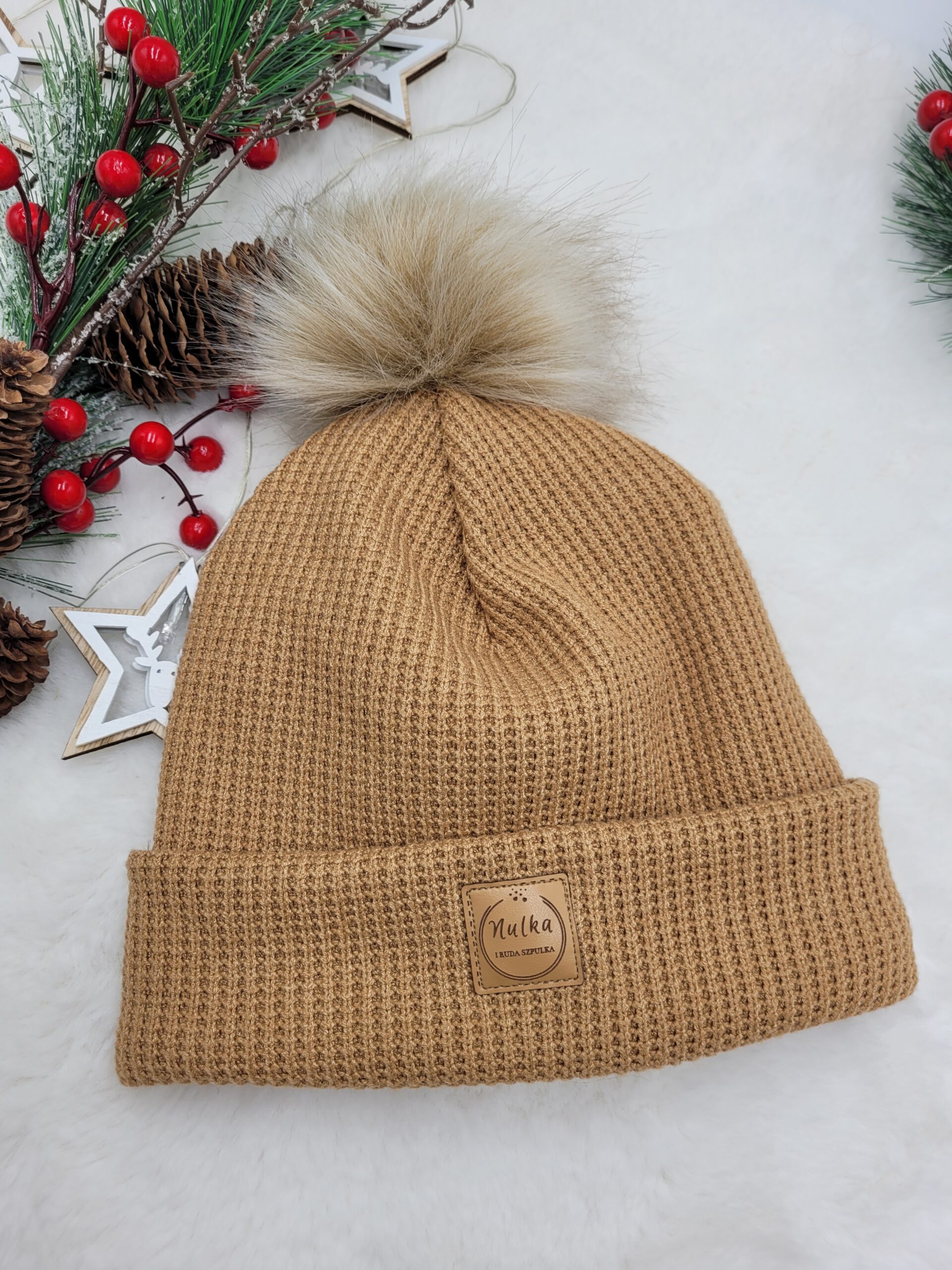 Czapka w kolorze karmel ozdobiona pomponami w dowolnym kolorze.