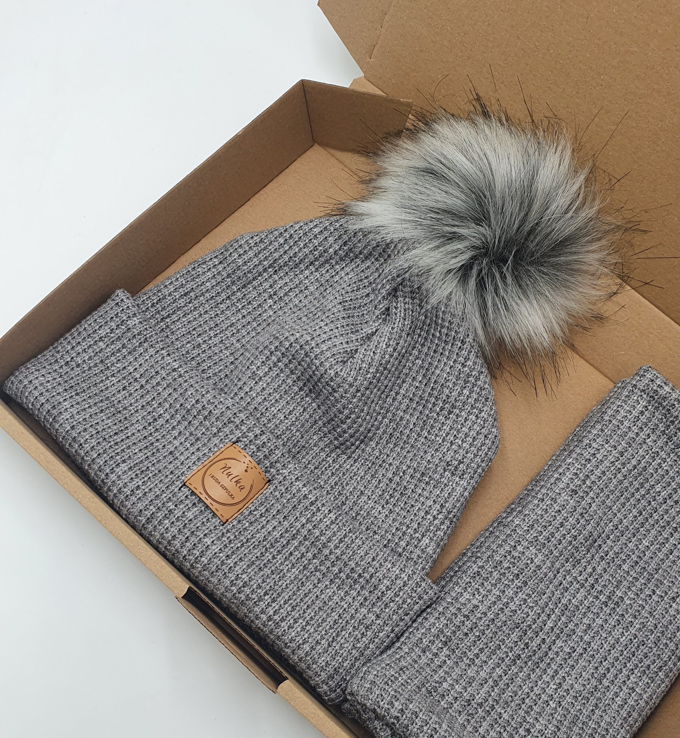 Rozmiary od 36 do 56. Czapka z dzianiny sweterkowej w kolorze szarym ozdobiony pomponami, możliwość podszycia polarem.