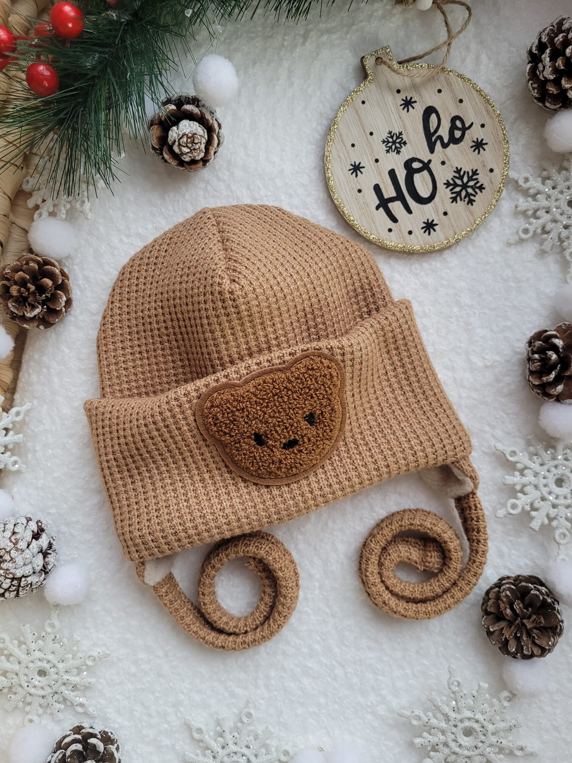 Zimowa czapka wiązana dla dziecka w wybranym kolorze ozdobiona naszywką misia.