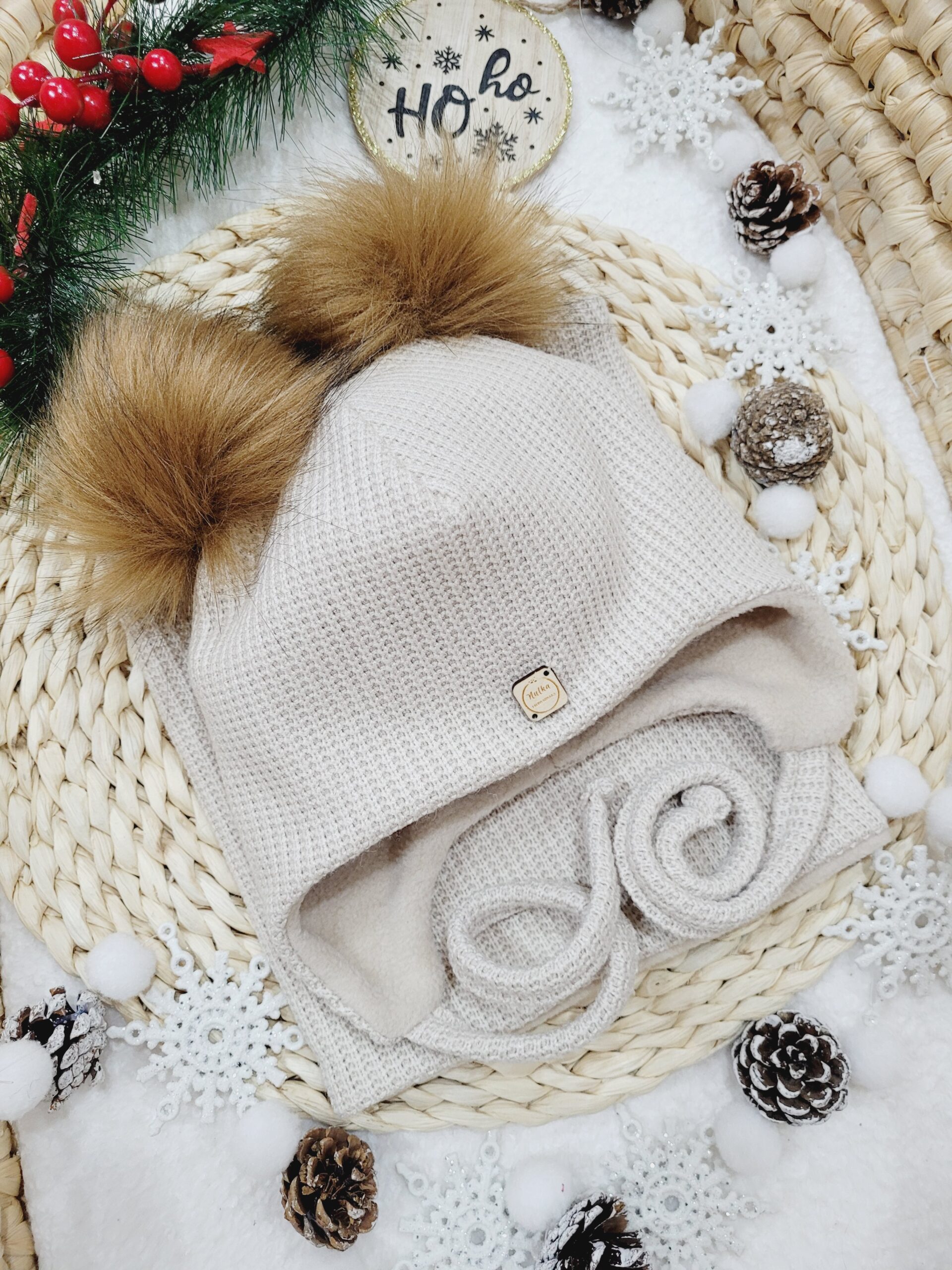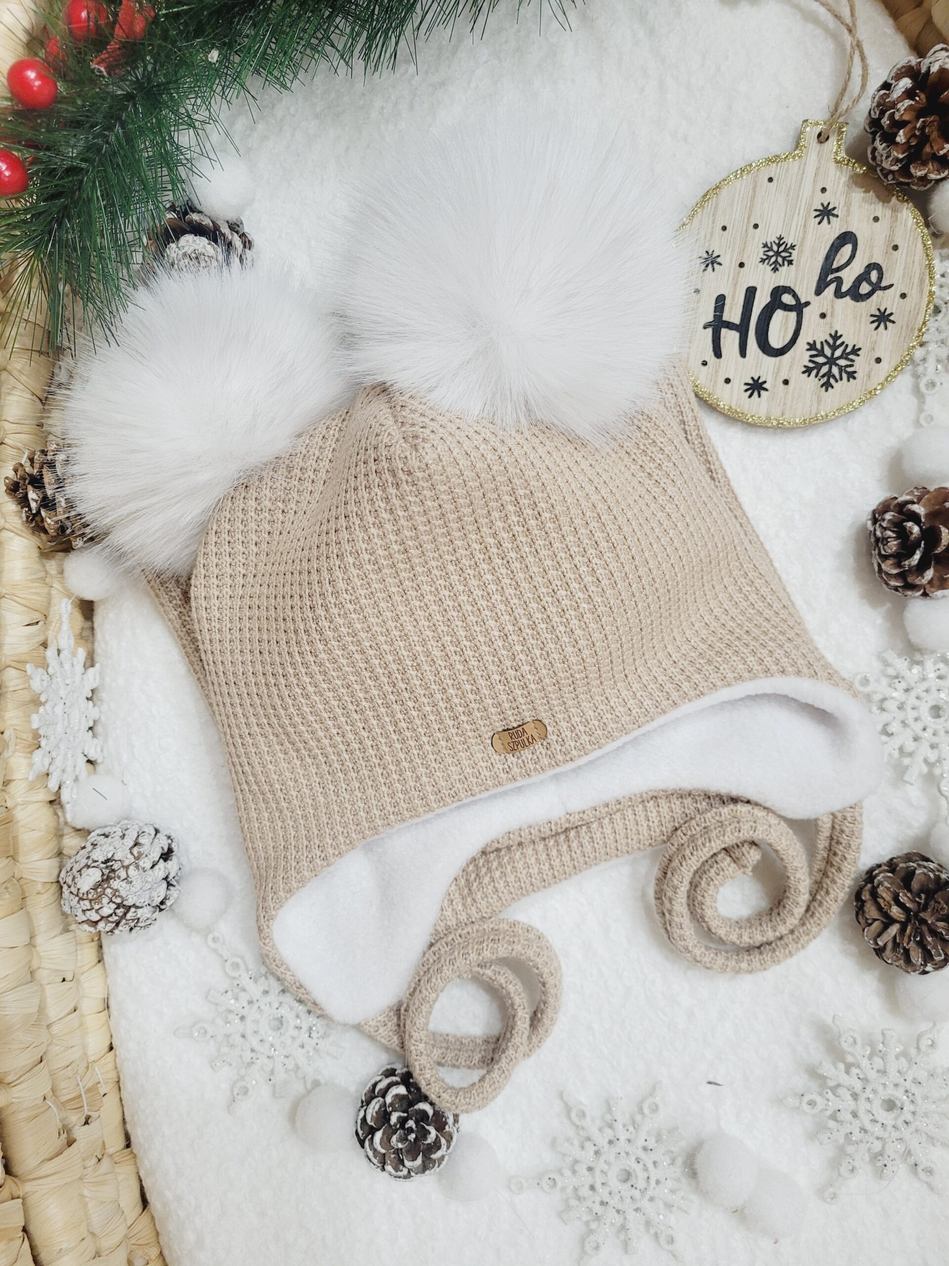 Zimowa czapka wiązana dla chłopca lub dziewczynki ozdobiona jednym lub dwoma pomponami, kolor beżowy lub jasny beż.