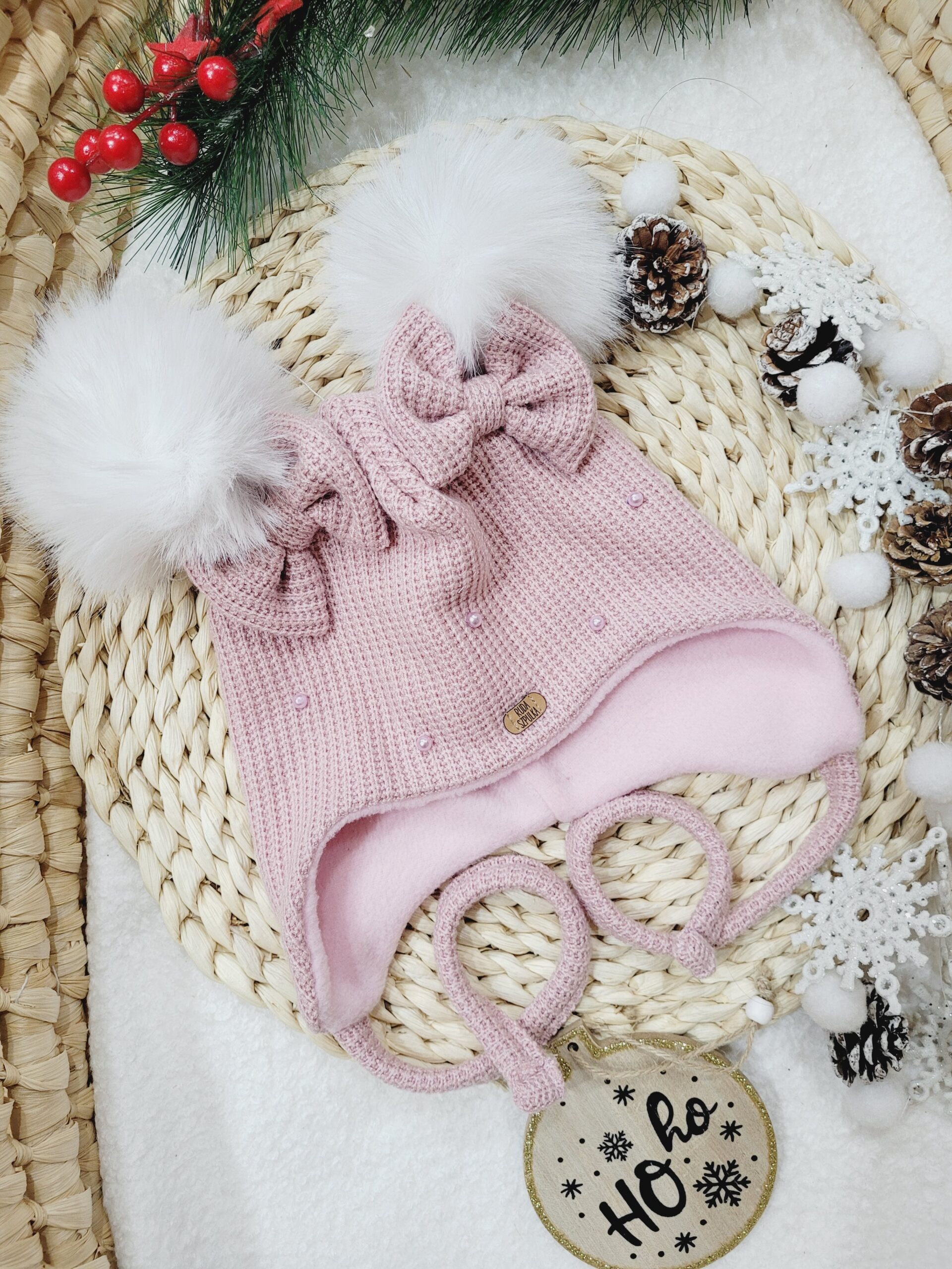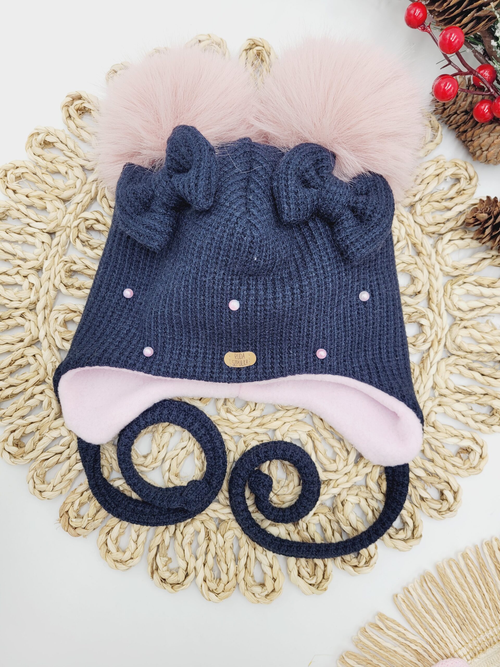 Zimowa czapka wiązana dla dziewczynki w wybranym kolorze ozdobiona pomponami, kokardkami i pięknymi perełkami.