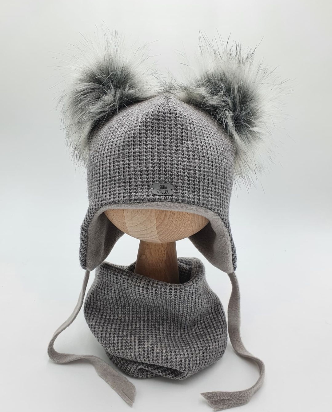 Zimowa czapka wiązana z pomponami w kolorze szary melanż. Podszyta ciepłym polarem termicznym.