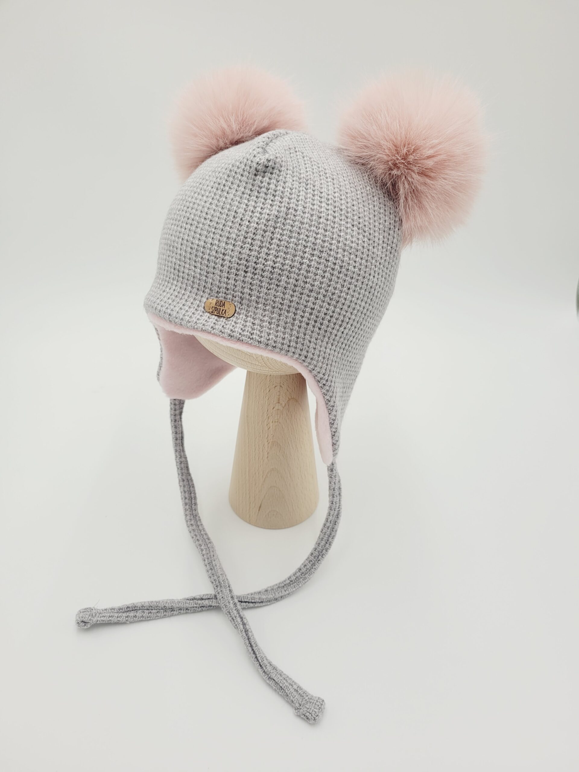 Zimowa czapka wiązana z pomponami w kolorze szary melanż jasny. Podszyta ciepłym polarem termicznym.