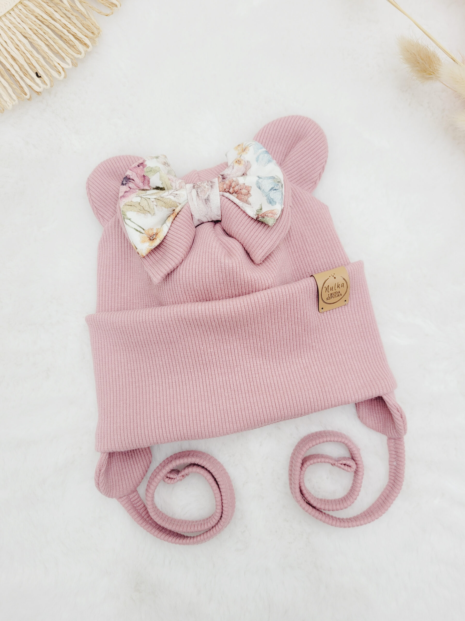 Czapka prążkowana dla dziewczynki ozdobiona misiowymi uszkami i kokardką wzór Purple Garden z różowym podszyciem. Czapka może być również wiązana i ozdobiona perełkami. W wersji zimowej podszycie ciepłym polarem.