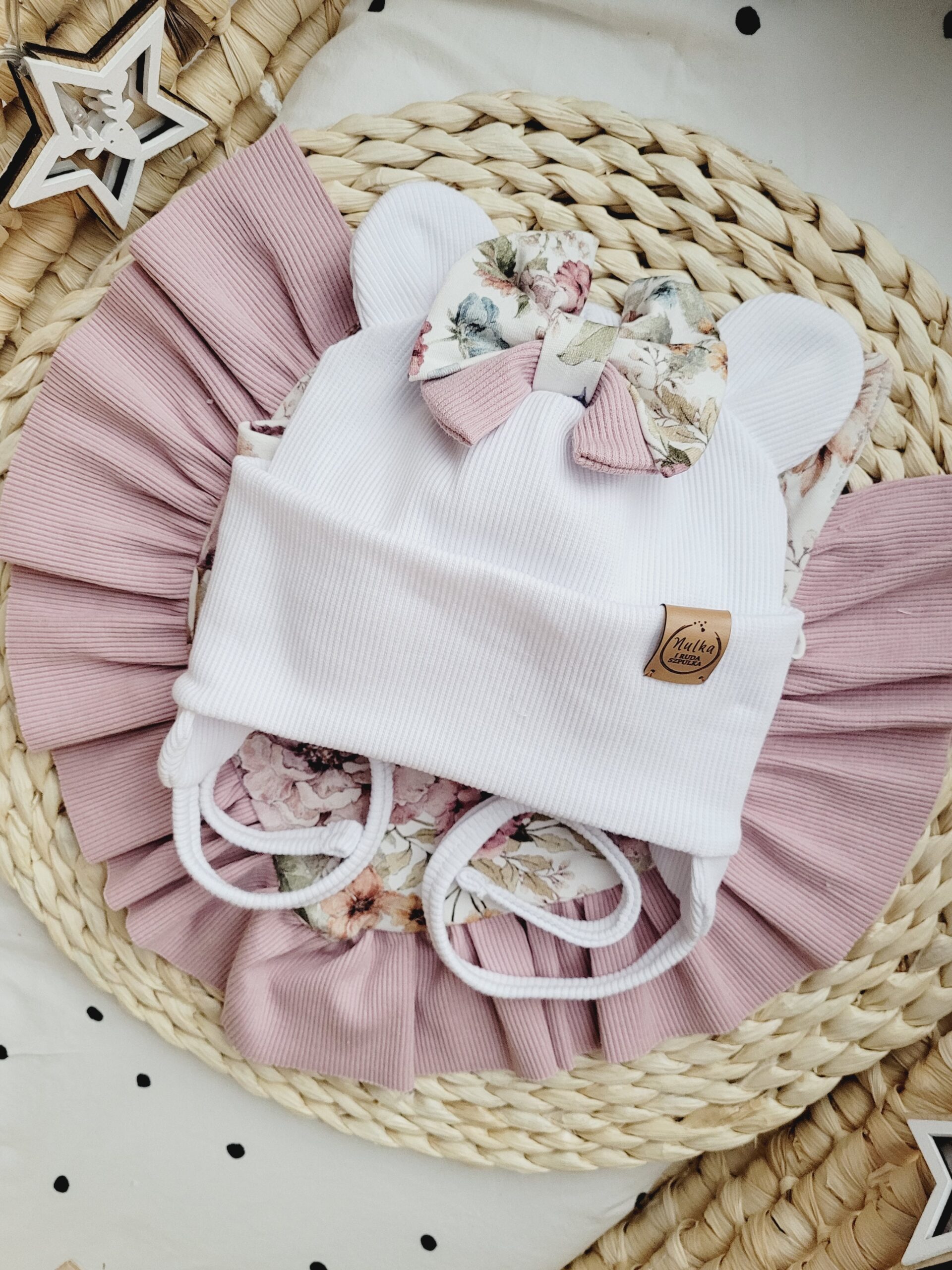 Poszukujesz wyjątkowej czapki beanie dla swojej małej księżniczki? Nasza czapka dla dziewczynki z pewnością spełni Twoje oczekiwania! Wykonana z wysokiej jakości dzianiny prążkowanej w wybranym kolorze, ozdobiona misiowymi uszkami i kokardką. Czapka w kolorze białym lub ecru ozdobiona kokardą – wzór Purple Garden w połączeniu z podszyciem pastelowy róż. Dla pozostałych opcji podszyciem jest wybrany kolor.