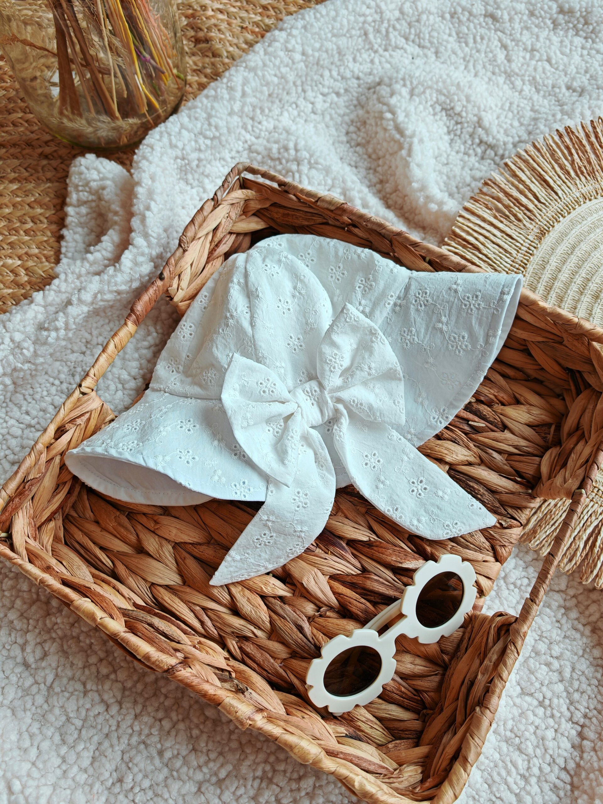 Uroczy kapelusz dla dziewczynki z kokardą, uszyty z przewiewnej bawełny haftowanej. Idealny na lato. Dostępny w rozmiarach 36–54 cm.