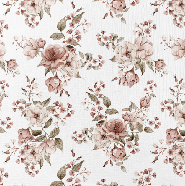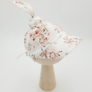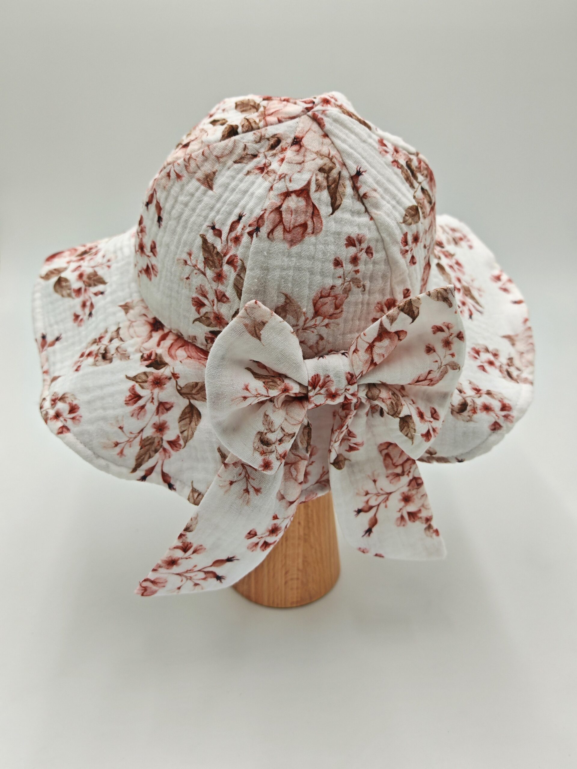 Letni kapelusz dla dziewczynki uszyty z wysokiej jakości muślinu bawełnianego double gauze premium w kolorze biełym lub różowym, ozdobiony pięknym wzorem Rosie. Materiał jest lekki, przewiewny i idealnie sprawdza się w ciepłe dni. Tkanina posiada certyfikat Oeko-Tex Standard 100, dzięki czemu jest w pełni bezpieczna dla niemowląt i dzieci.