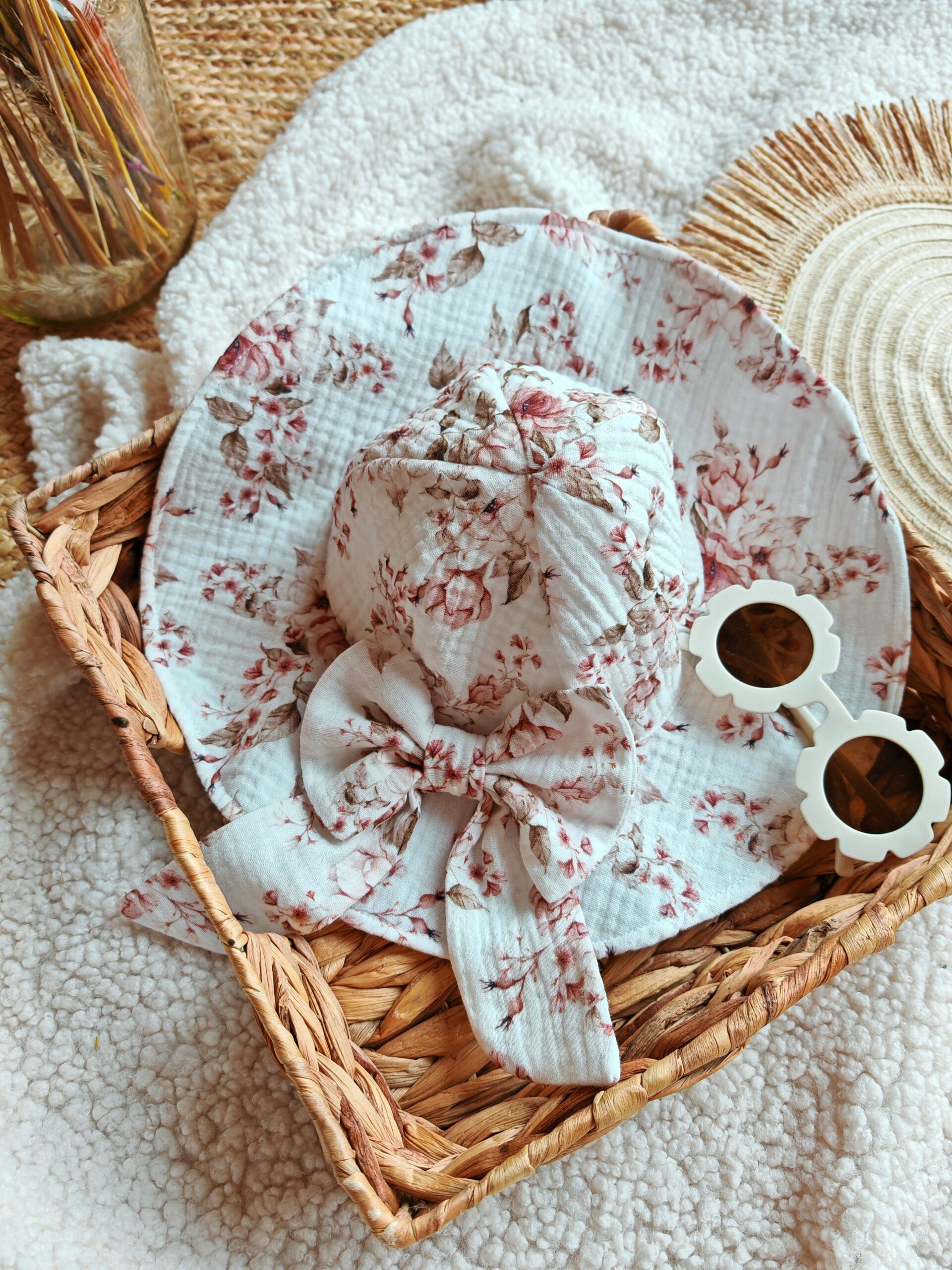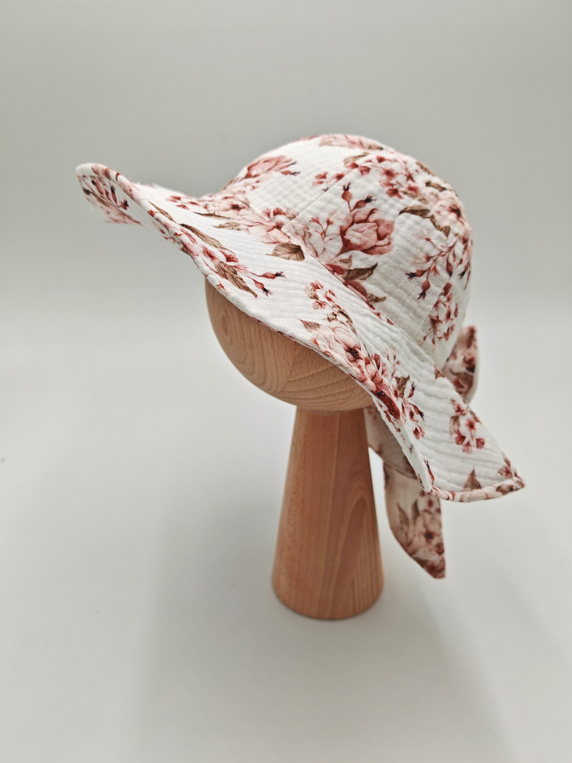 Uroczy kapelusz dla dziewczynki z kokardą, uszyty z przewiewnego muślinu bawełnianego wzór Rosie. Idealny na lato. Dostępny w rozmiarach 36–54 cm.