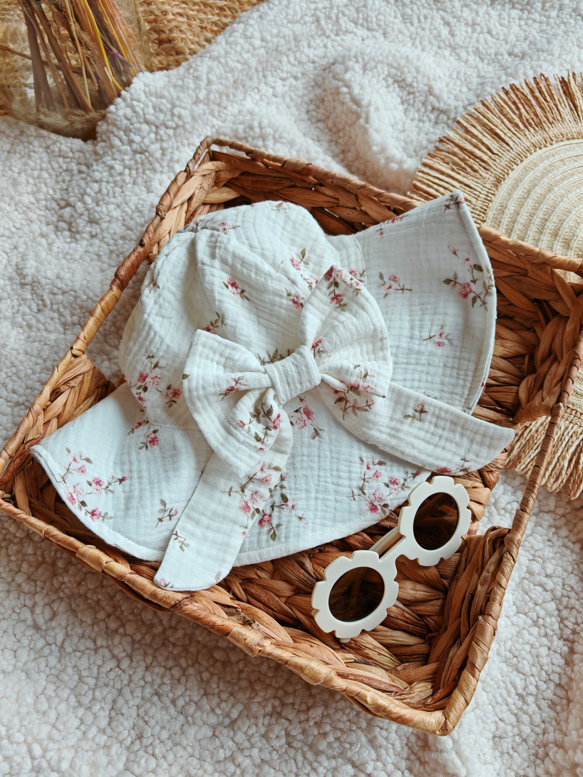 Letni kapelusz dla dziewczynki uszyty z wysokiej jakości muślinu bawełnianego double gauze premium w kolorze ecru lub różowym, ozdobiony wzorem drobnych różyczek. Materiał jest lekki, przewiewny i idealnie sprawdza się w ciepłe dni. Tkanina posiada certyfikat Oeko-Tex Standard 100, dzięki czemu jest w pełni bezpieczna dla niemowląt i dzieci.