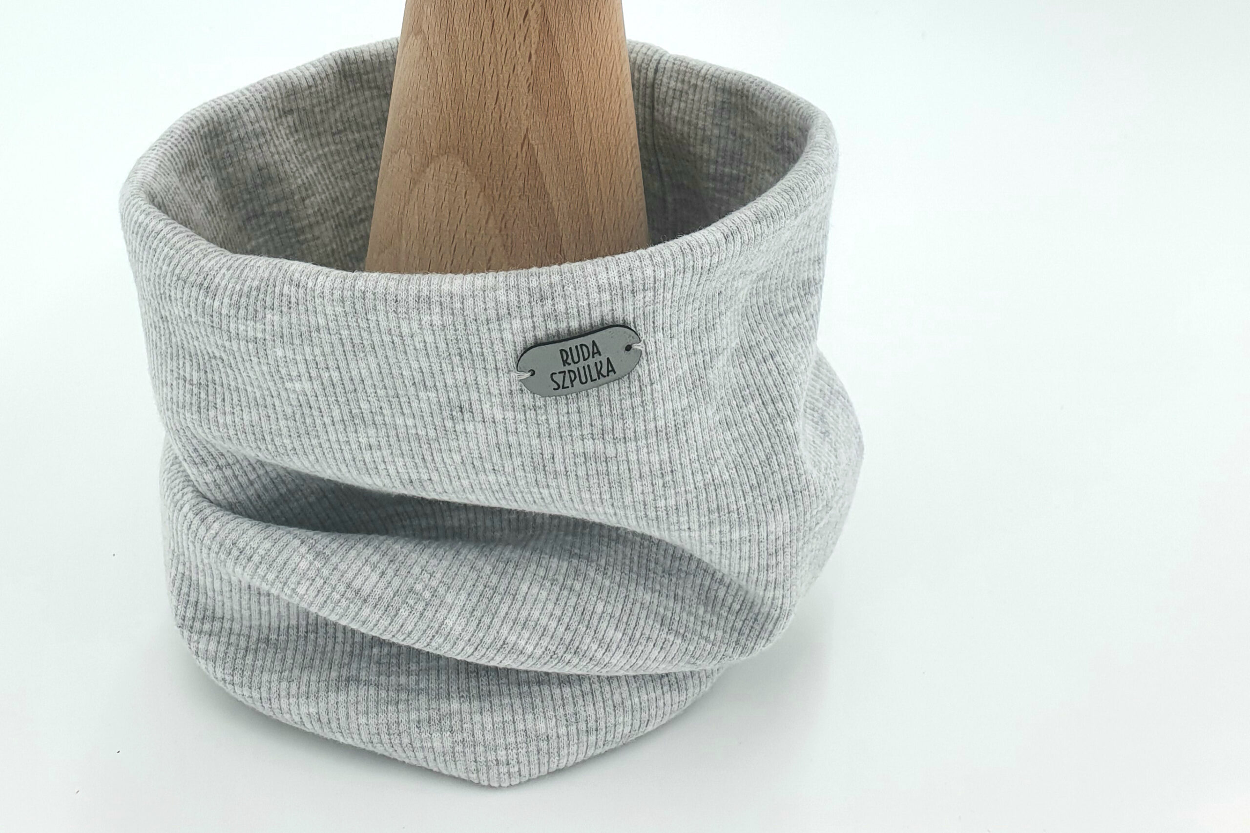 Komin pod szyję w czterech rozmiarach do wyboru w kolorze jasnego szarego melanżu.