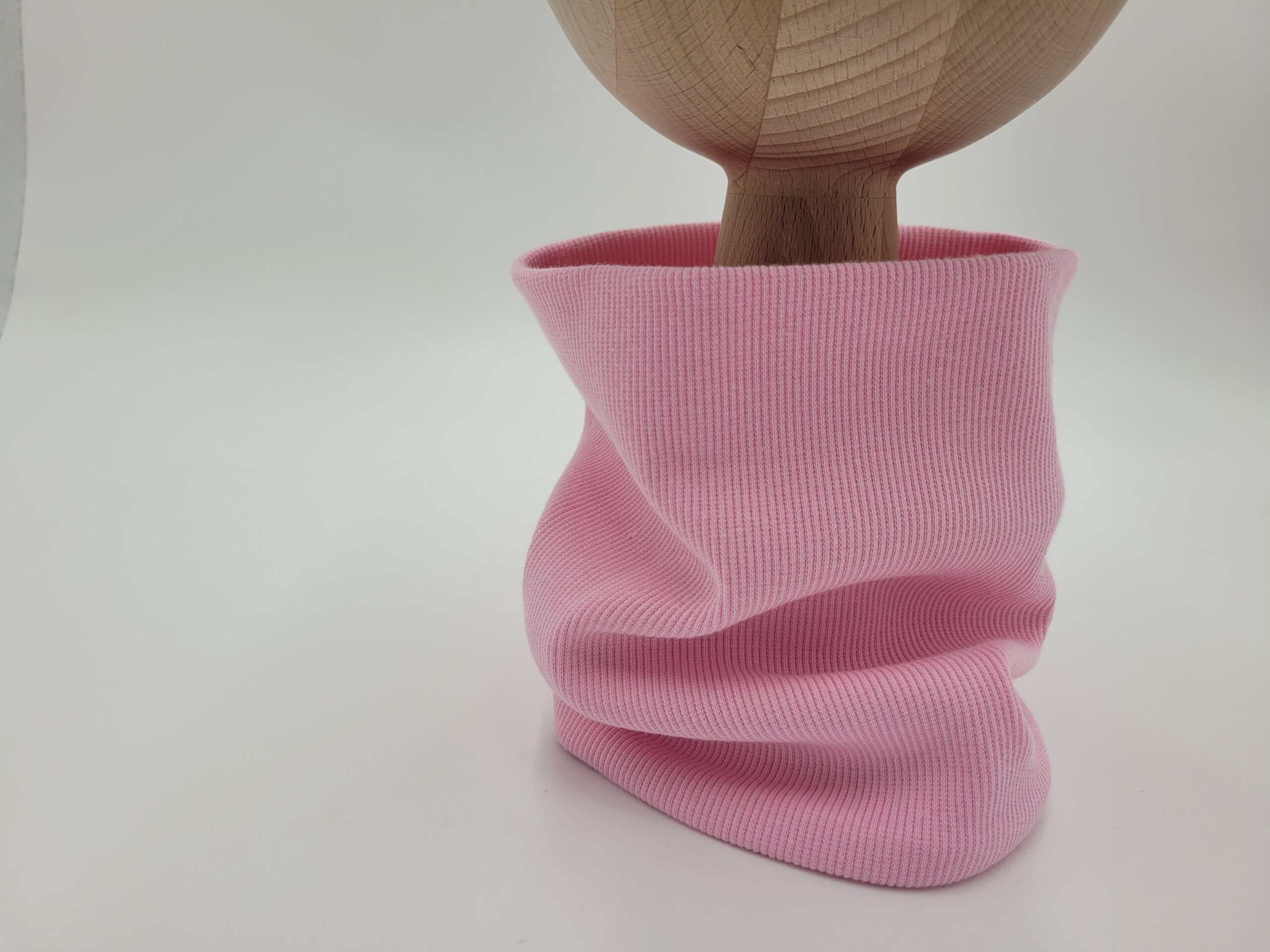 Komin z dzianiny prążkowanej w kolorze różowym.
