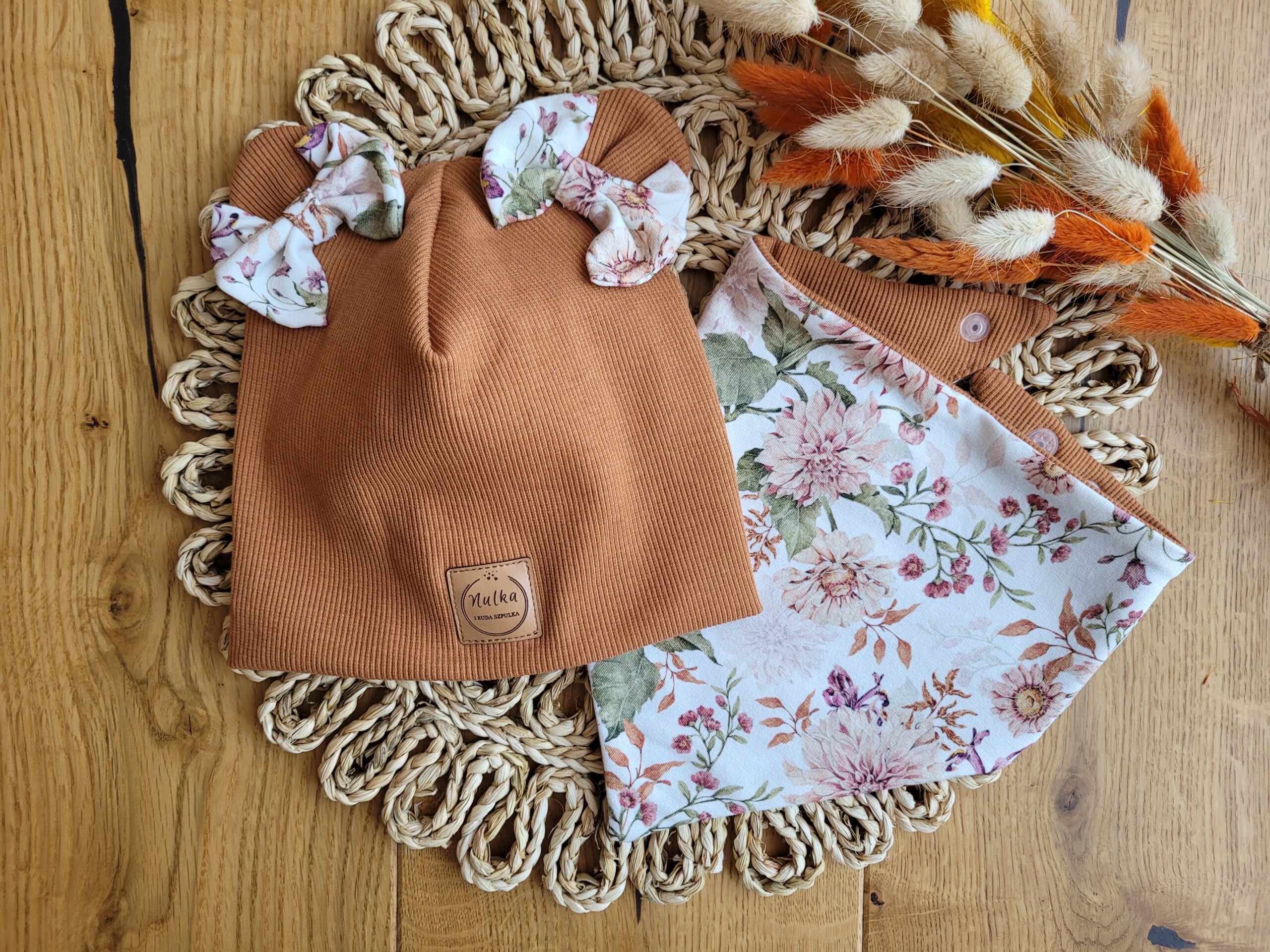 Czapka z uszkami i kokardkami w połączeniu z klasycznym kominem lub chustą. Piękny wzór dalii połączony z wybranym kolorem dzianiny prążkowanej – idealny zestaw dla dziewczynki.