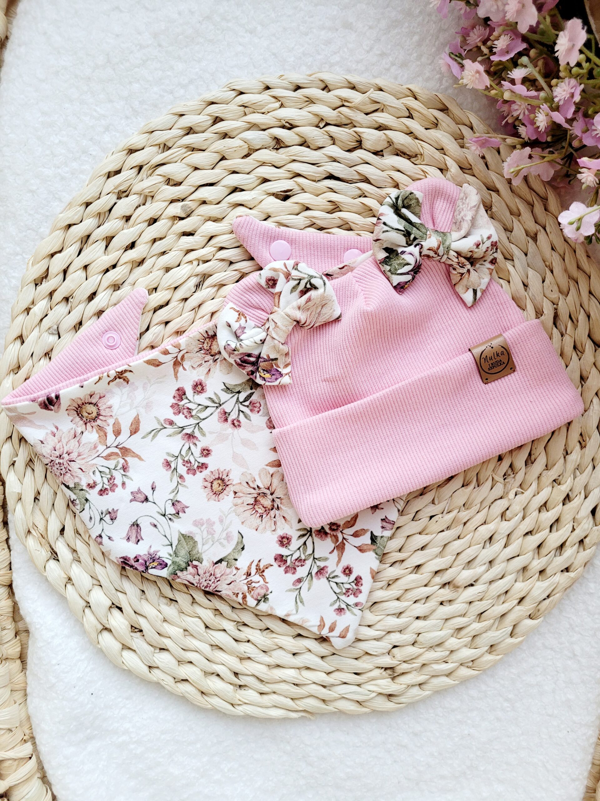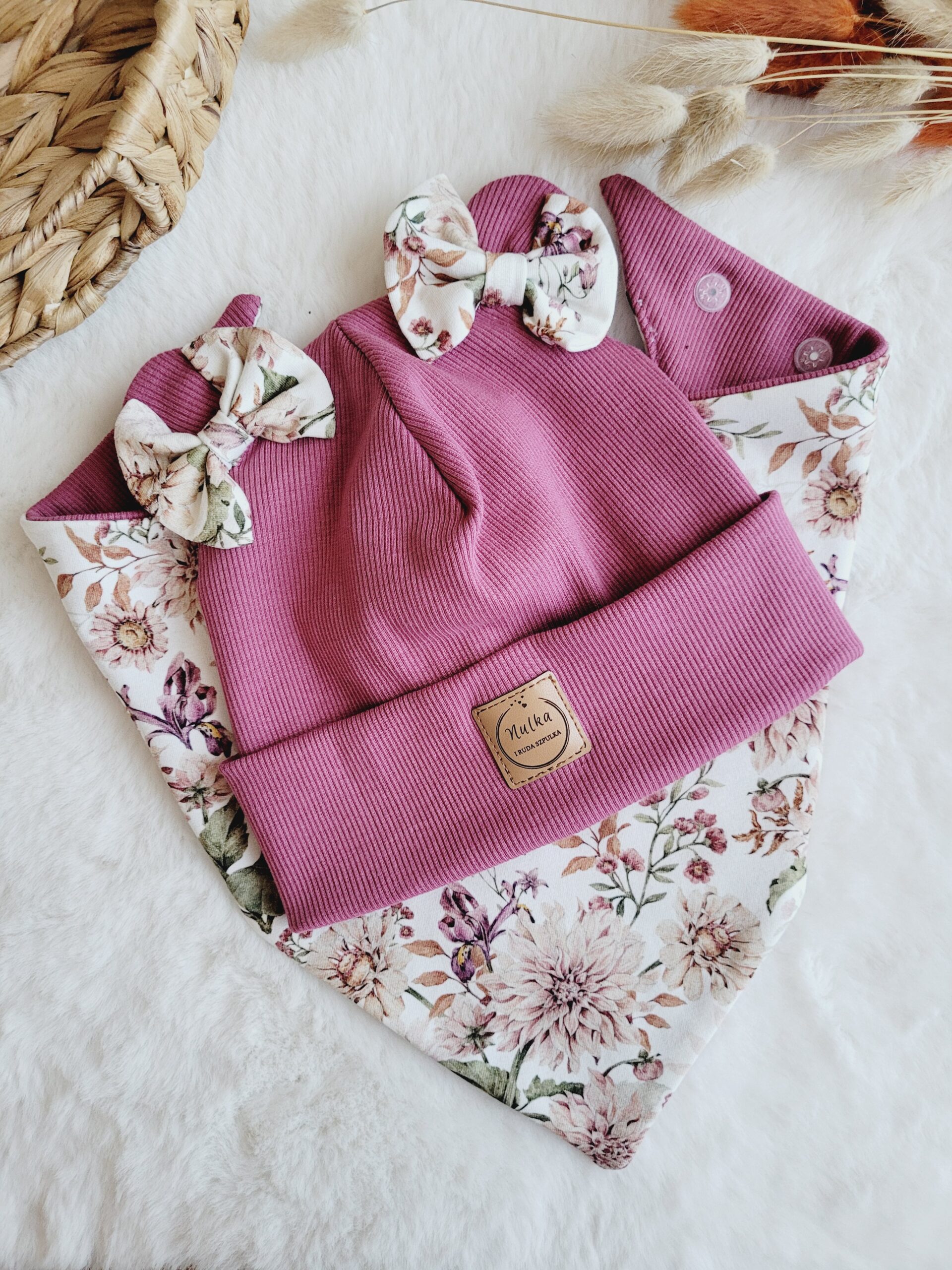 Komplet dla dziewczynki Dalie w różnych kolorach do wyboru. Misiowe uszka ozdobiona dwoma kokardkami. Możliwość podszycia polarem.