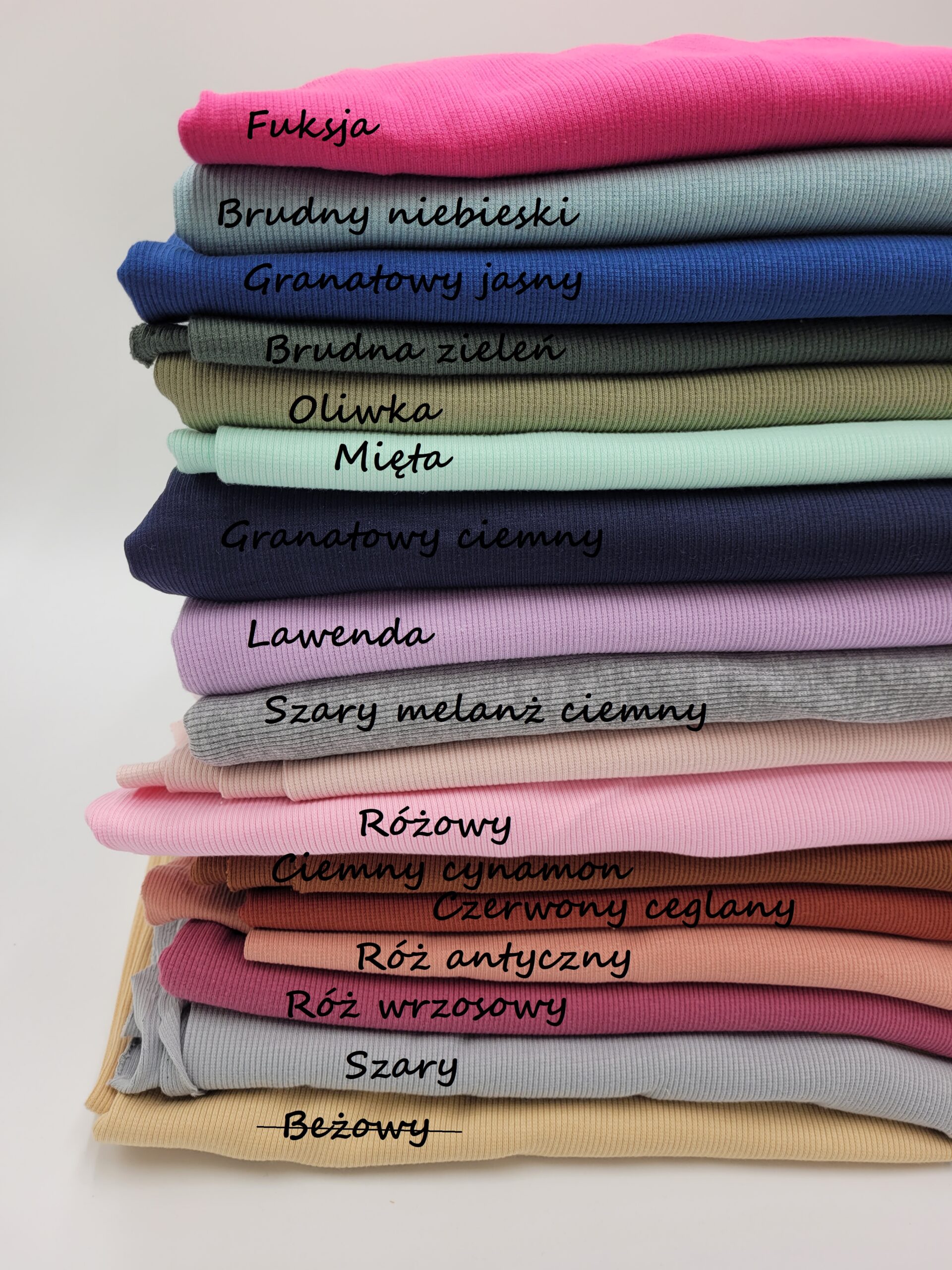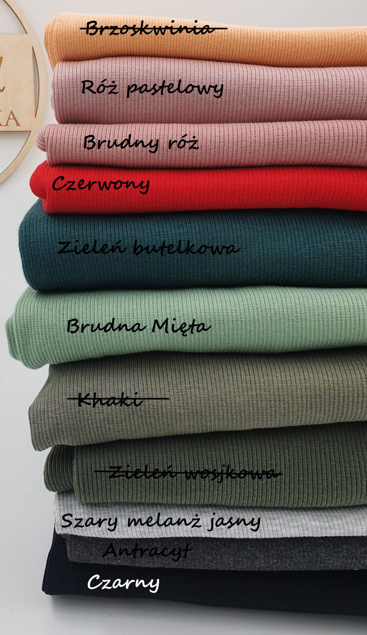 Do zestawu mamy chustę Mini zapinaną na napki/rzep lub Maxi wiązaną. Każdą z nich możesz zamówić z falbanką z dzianiny prążkowanej. Chusty są dwustronne. Możesz również wybrać klasyczny dwuwarstwowy komin.