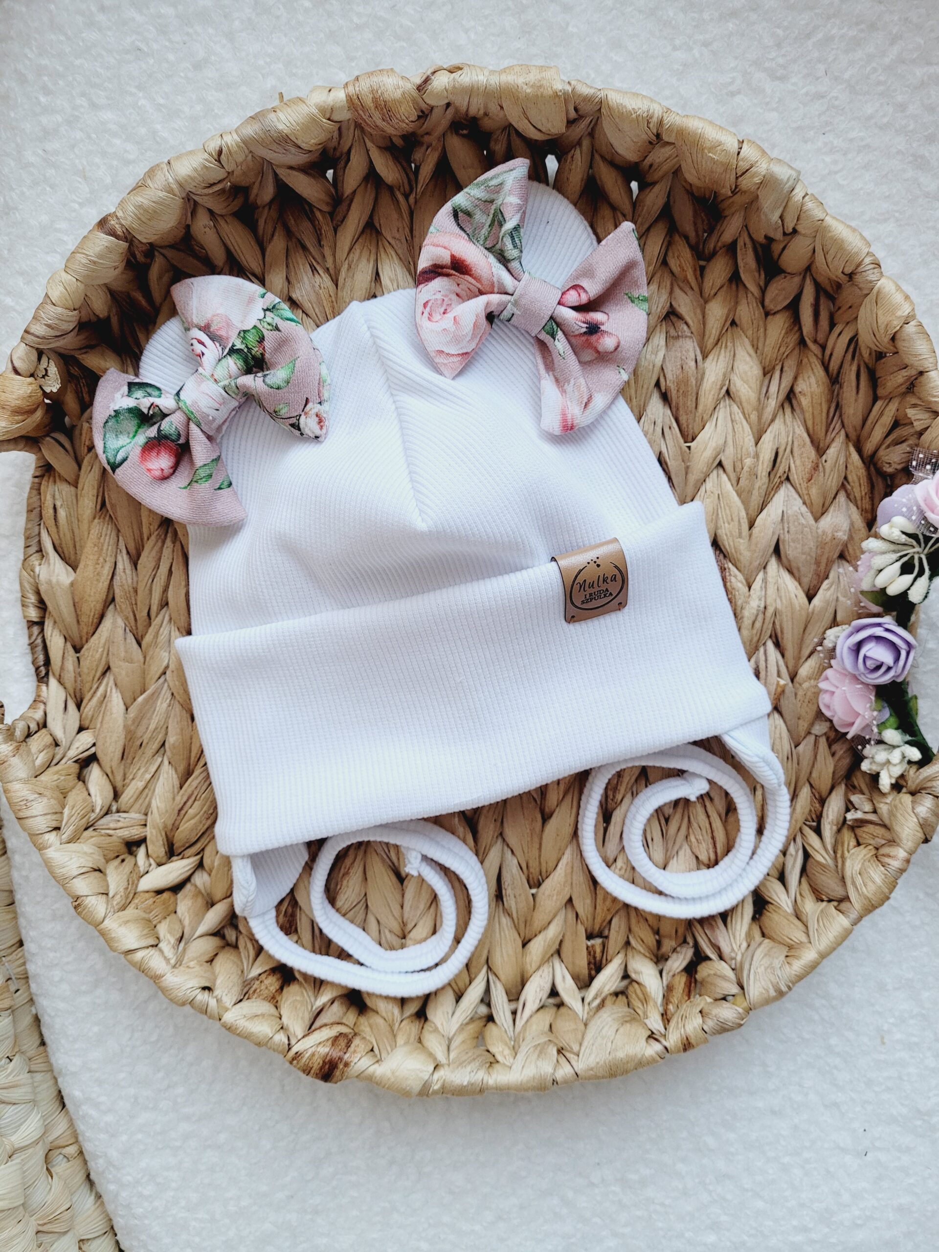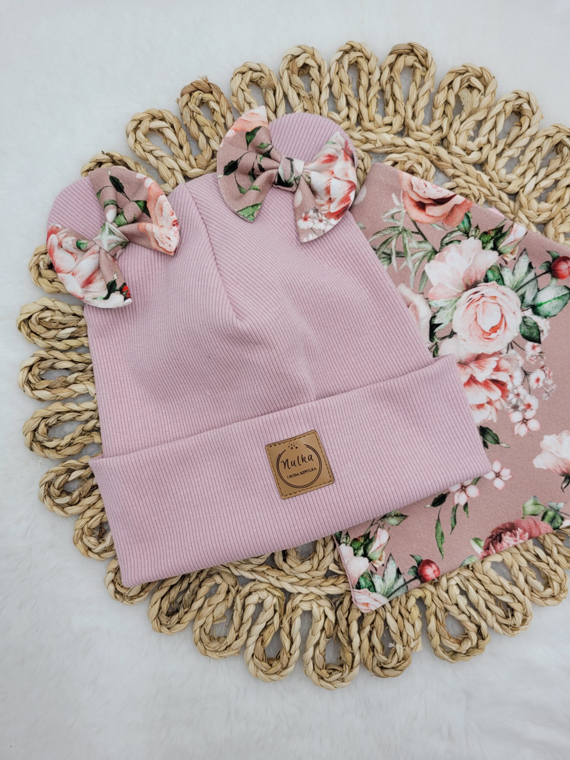 Czapka z uszkami i kokardkami w połączeniu z klasycznym kominem lub chustą. Piękny wzór kwiatowy połączony z wybranym kolorem dzianiny prążkowanej – idealny zestaw dla dziewczynki.