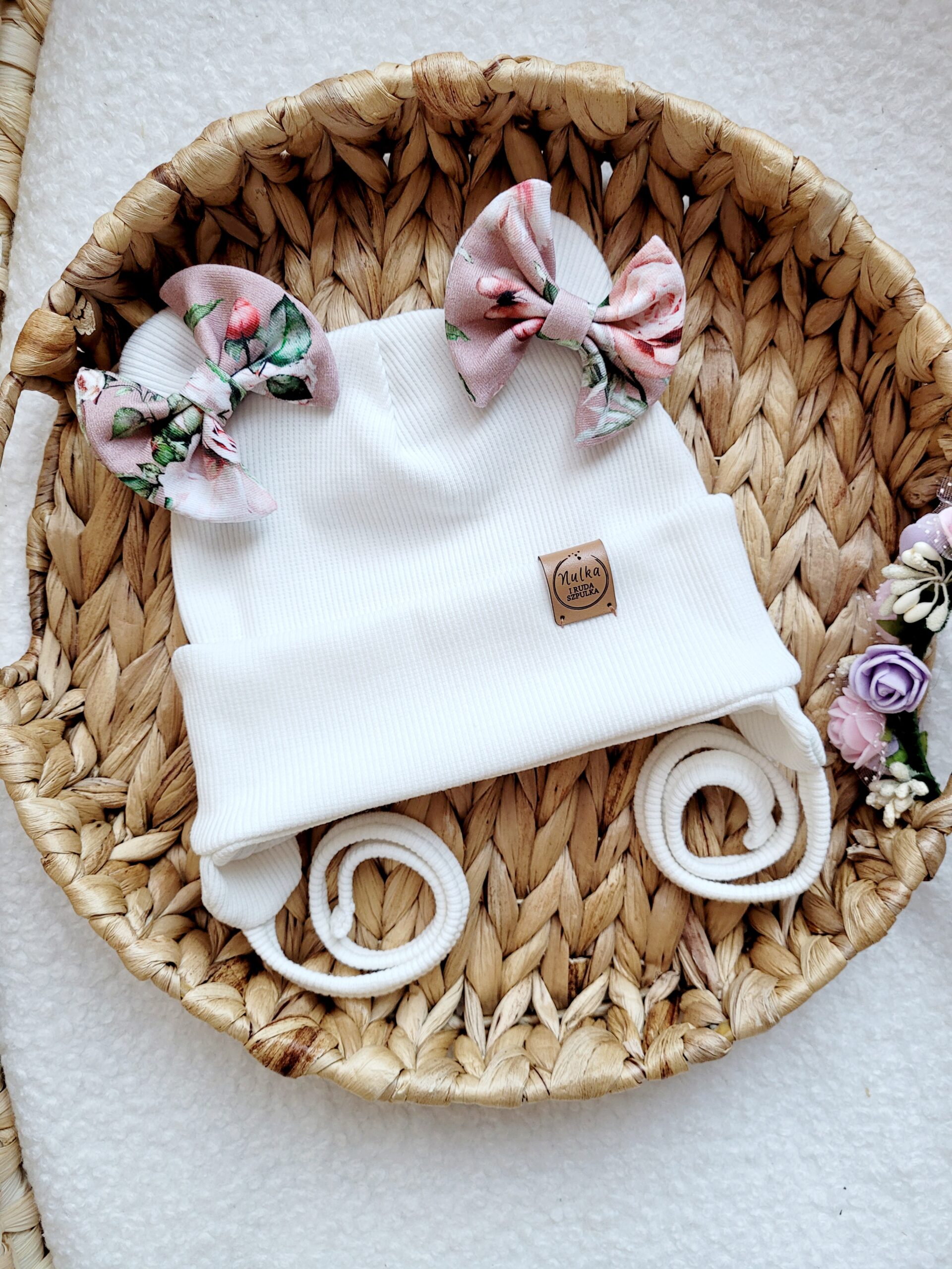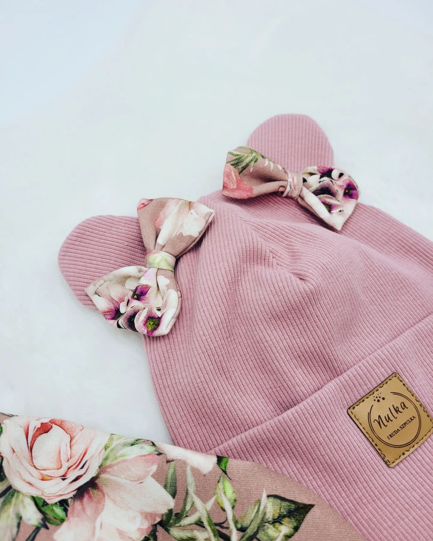 Czapka ozdobiona misiowymi uszkami z dwoma małymi kokardkami wzór Malowane róże, które dodają uroku i sprawiają, że czapka wygląda mega dziewczęco. Czapka może być klasyczna lub z wiązana z nausznikami.