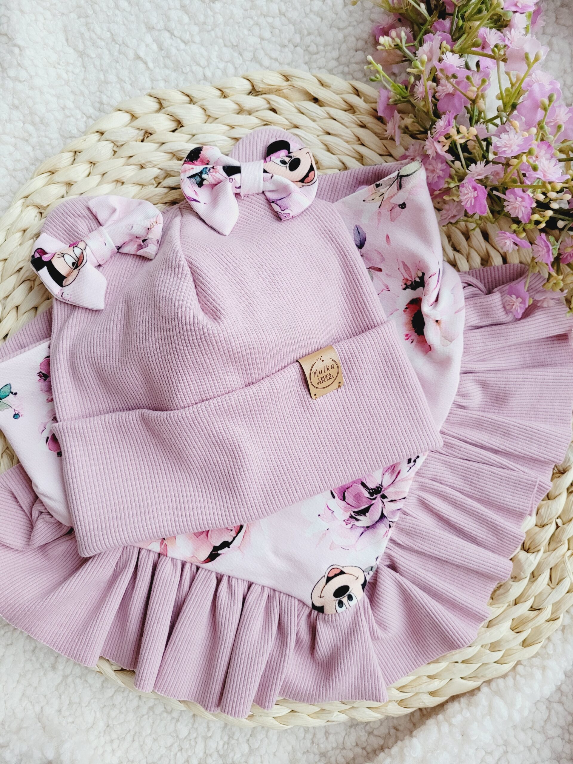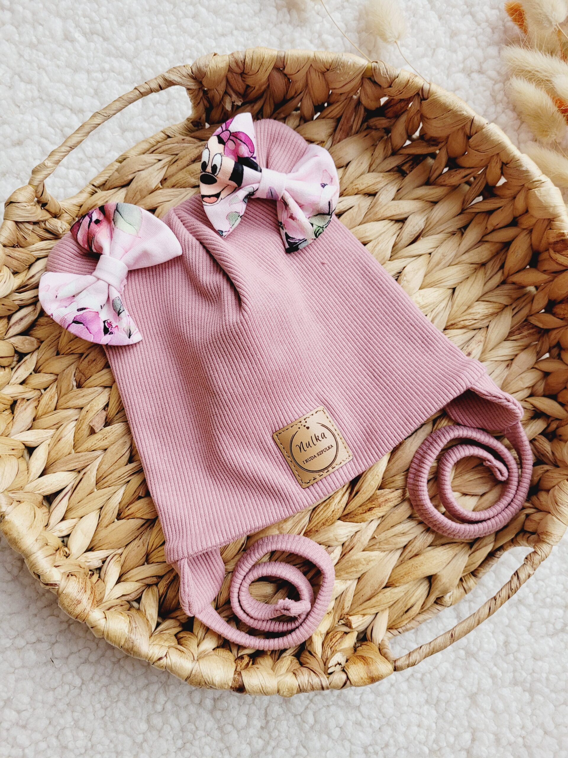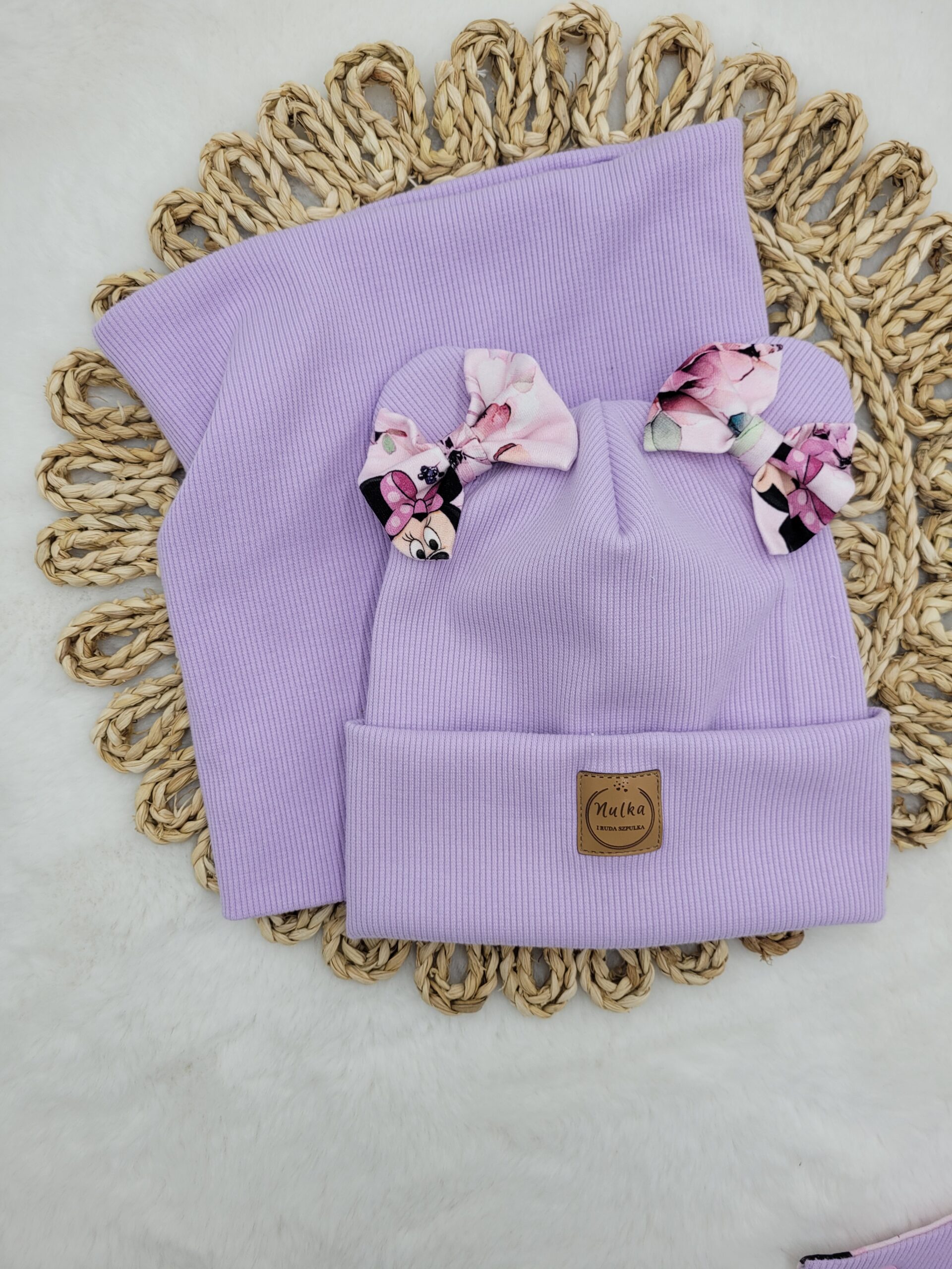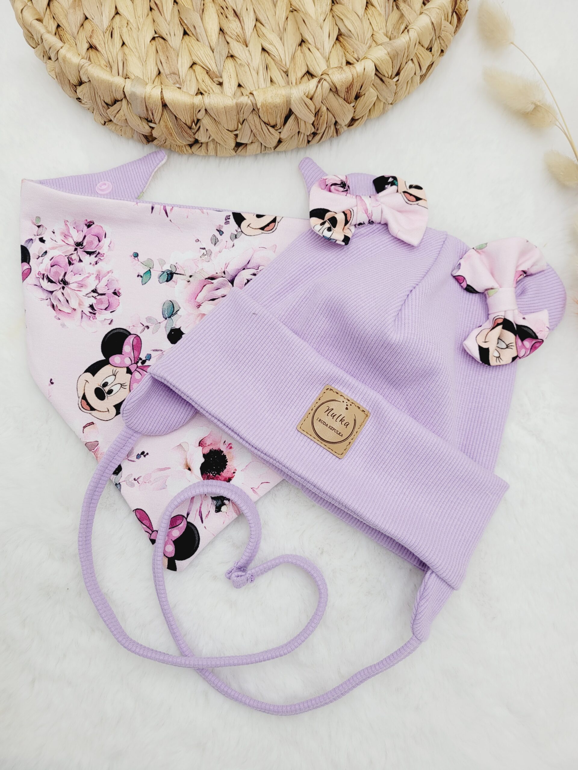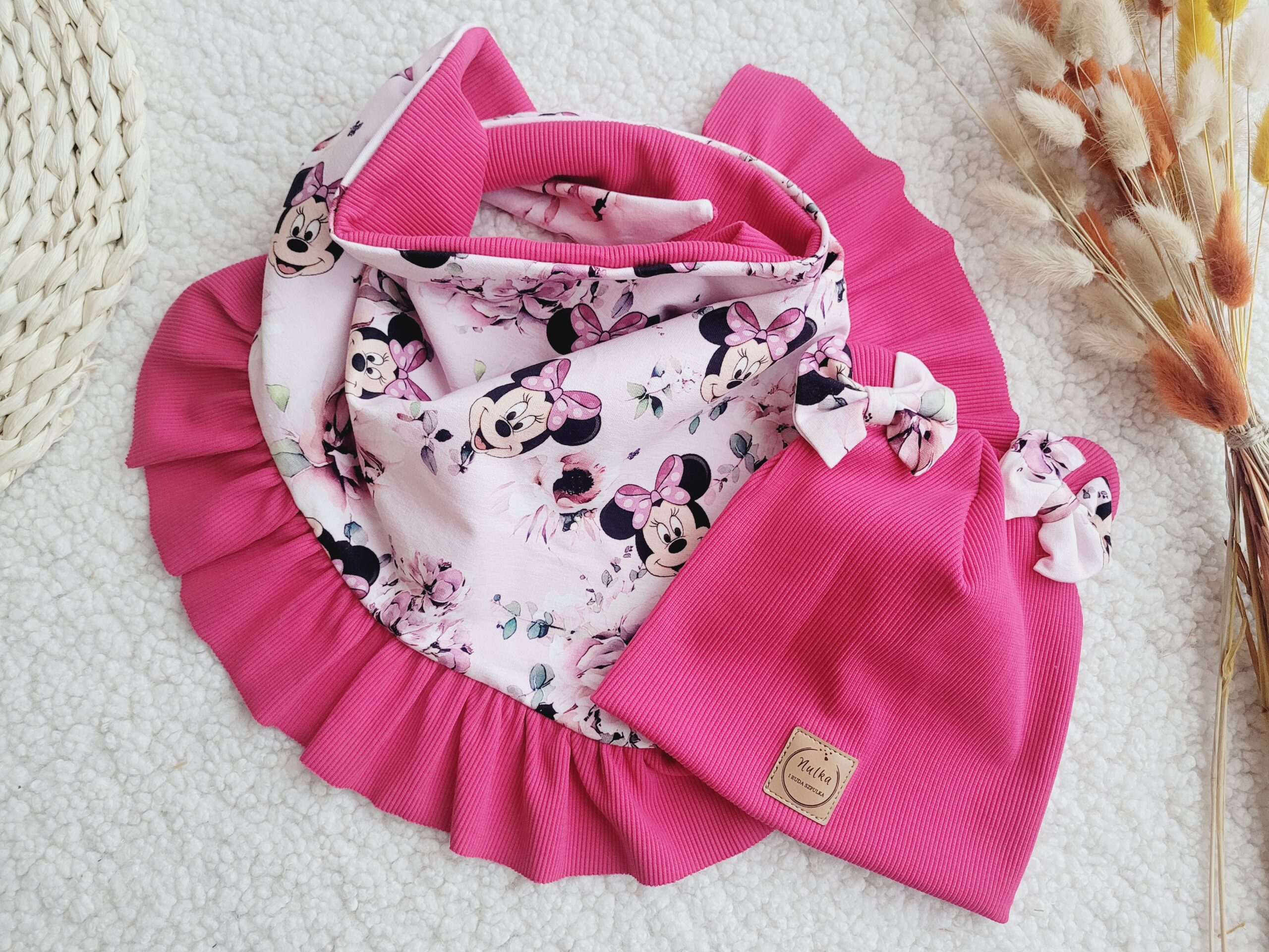 Czapka z uszkami i kokardkami w połączeniu z klasycznym kominem lub chustą. Piękny wzór myszki Minnie i kwiatów połączony z wybranym kolorem dzianiny prążkowanej – idealny zestaw dla dziewczynki.
