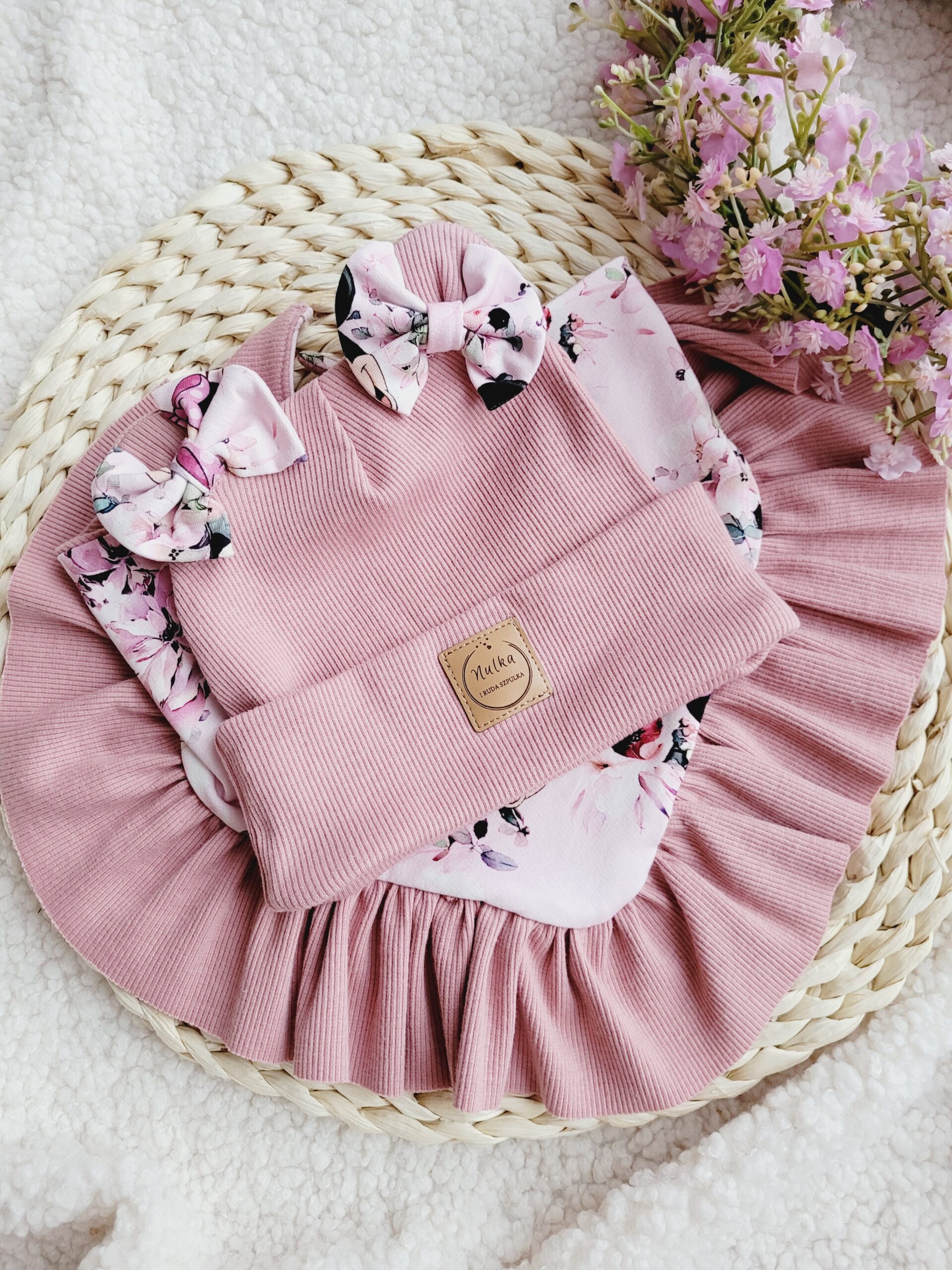 Do zestawu możesz wybrać klasyczny w całości prążkowany komin, chustę mini zapinaną na napki/rzep lub chustę maxi wiązaną. Jeśli zdecydujesz się na chustę dodatkowo możesz ozdobić ją falbanką wykonaną z dzianiny prążkowanej. Chusty są dwustronne!