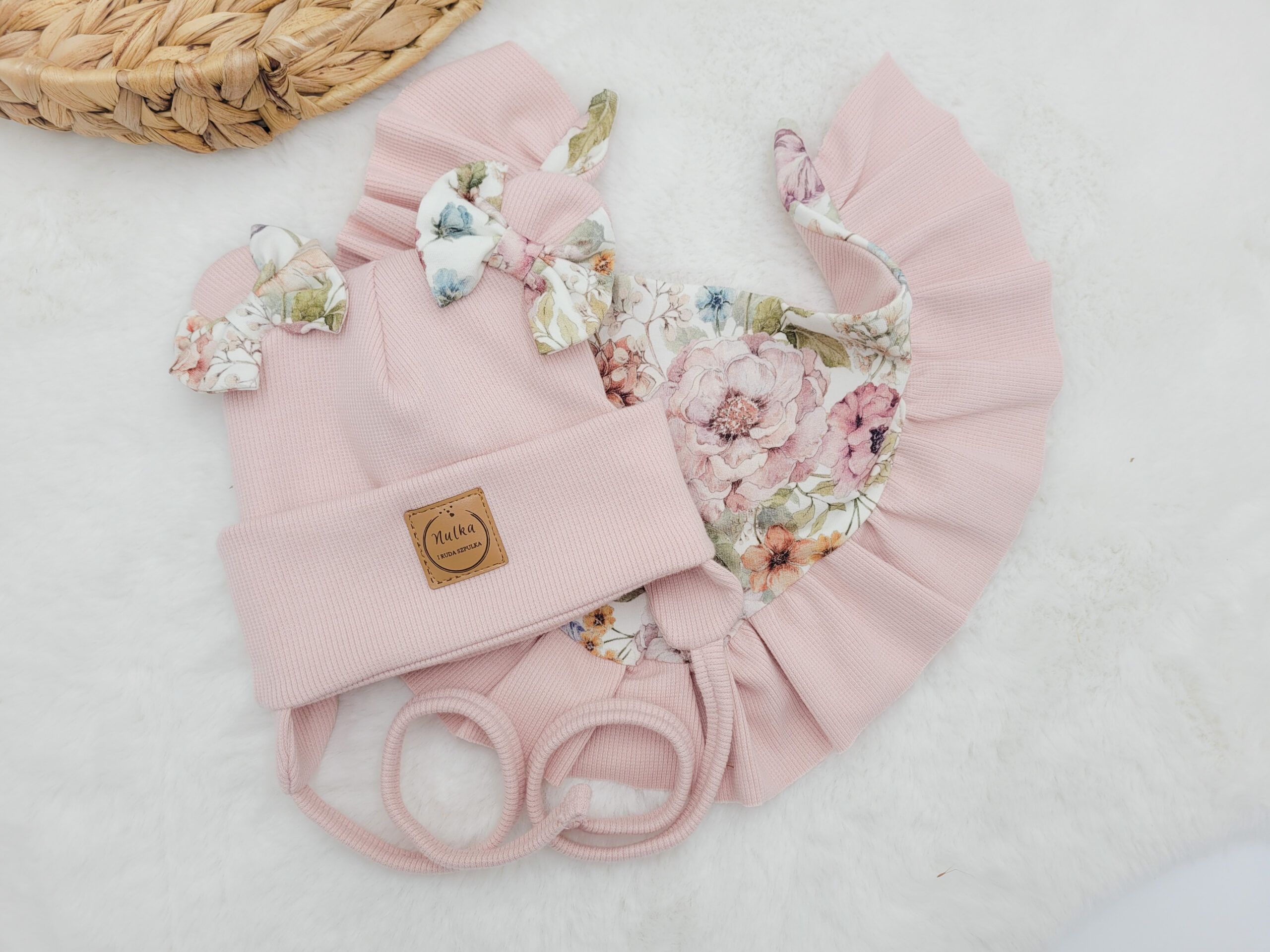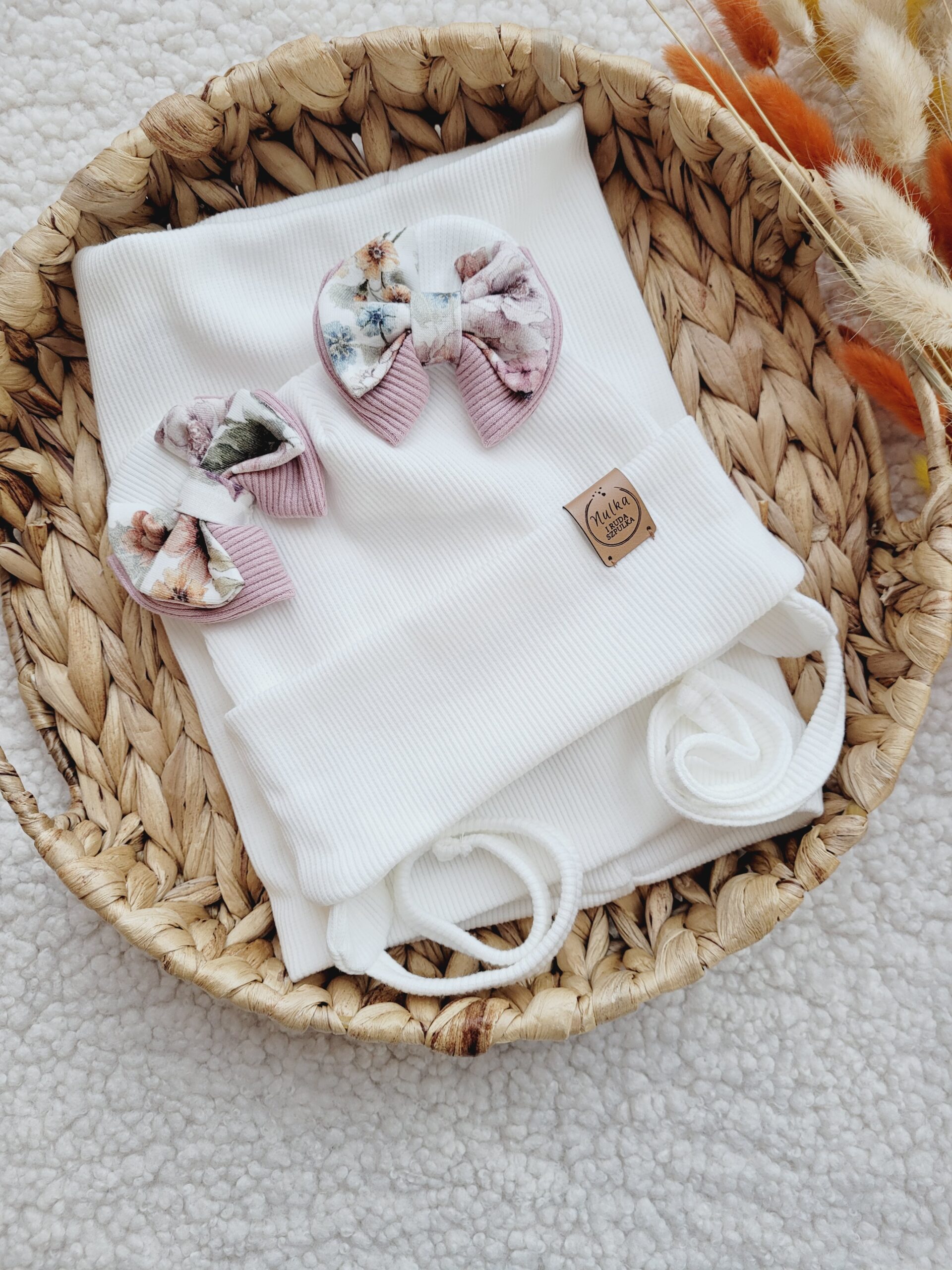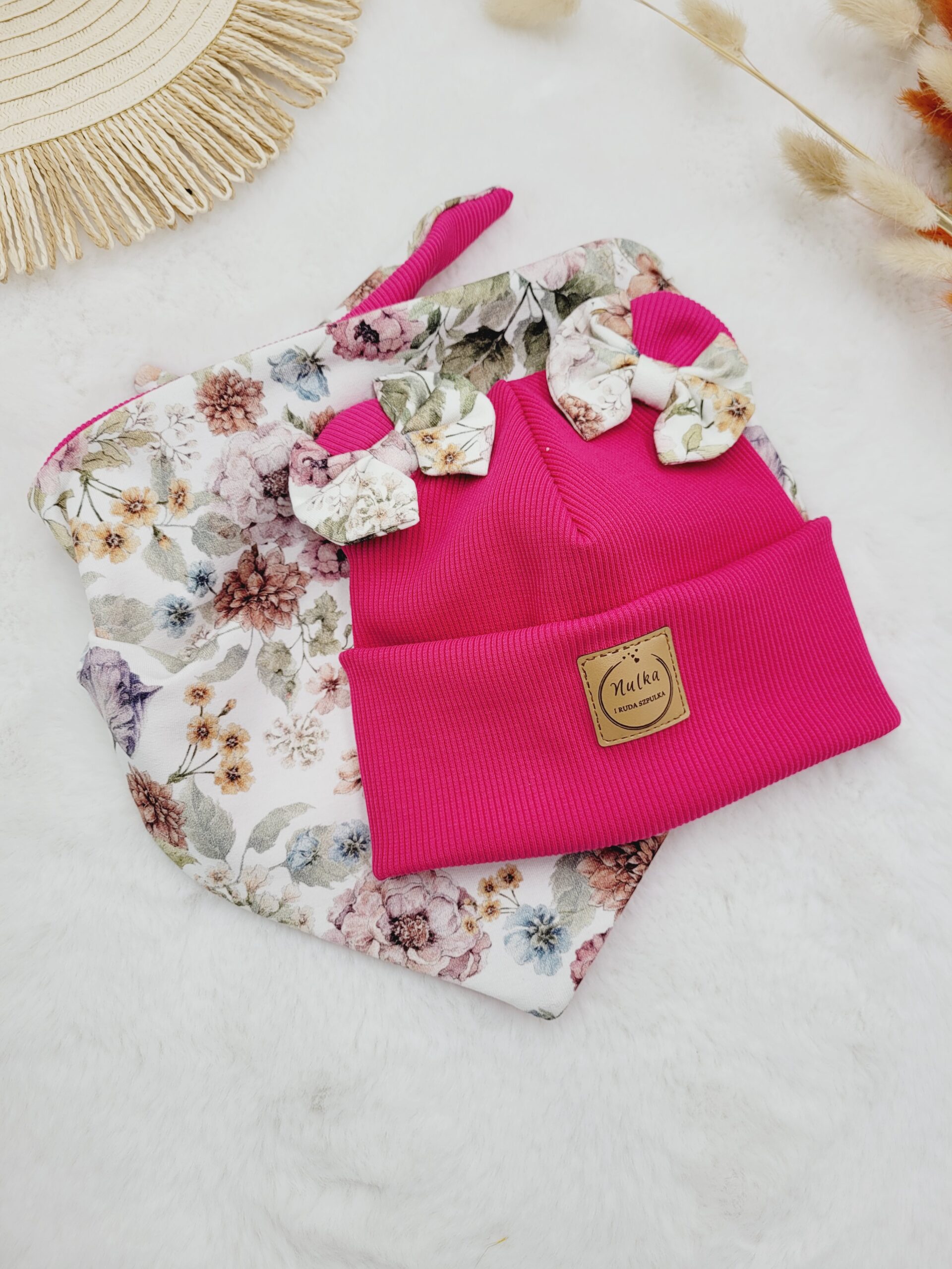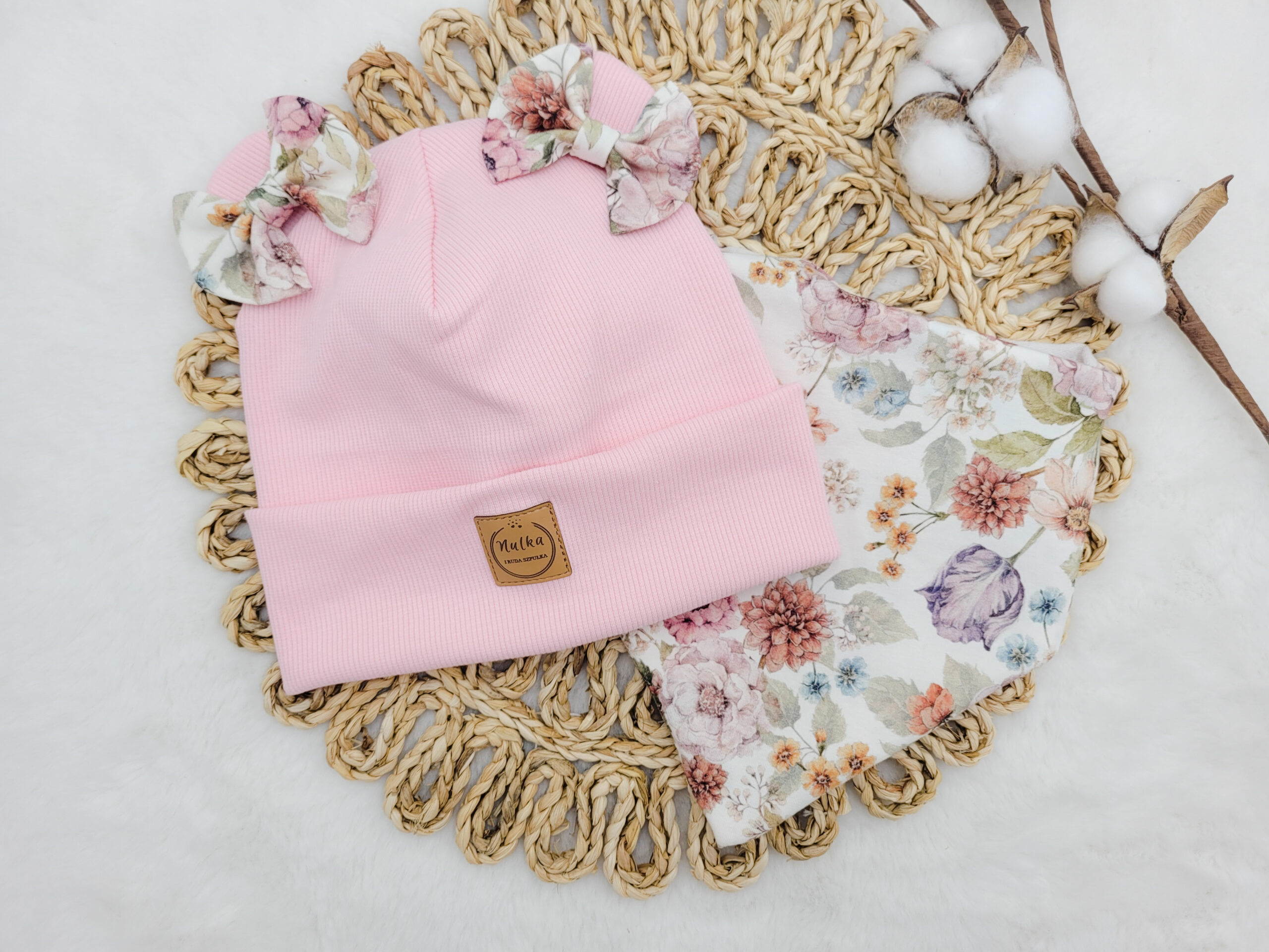 Czapka z uszkami i kokardkami w połączeniu z klasycznym kominem lub chustą. Piękny wzór kwiatowy połączony z wybranym kolorem dzianiny prążkowanej – idealny zestaw dla dziewczynki.
