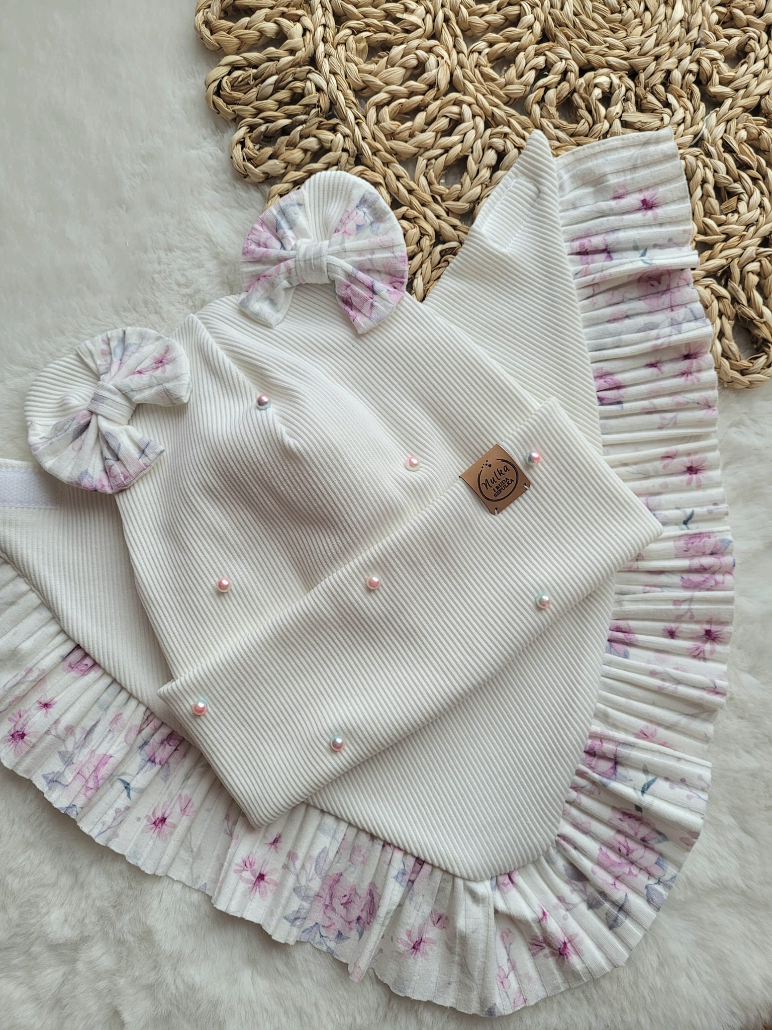 Komplet dla dziewczynki, czapka ozdobiona perełkami w zestawie z chustą.