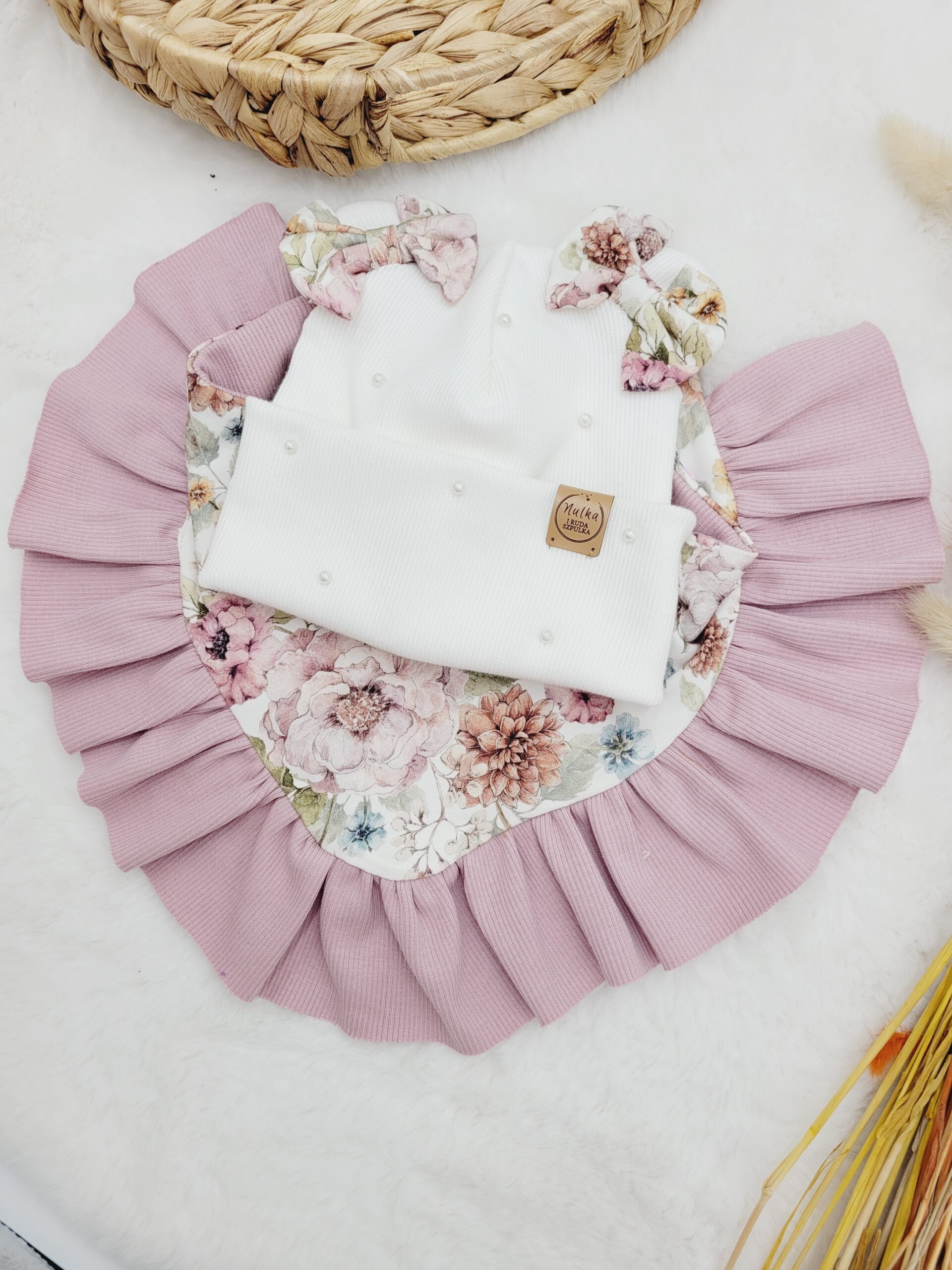 Czapka uszyta z dzianiny prążkowanej z misiowymi uszkami i perełkami ozdobiona kokardkami w wybranym wzorze. Chusta w zestawie szyta z wybranego printu z falbanką pod kolor czapki – jeśli chcesz może być w innym kolorze, zostaw wiadomość w uwagach na końcu zamówienia.