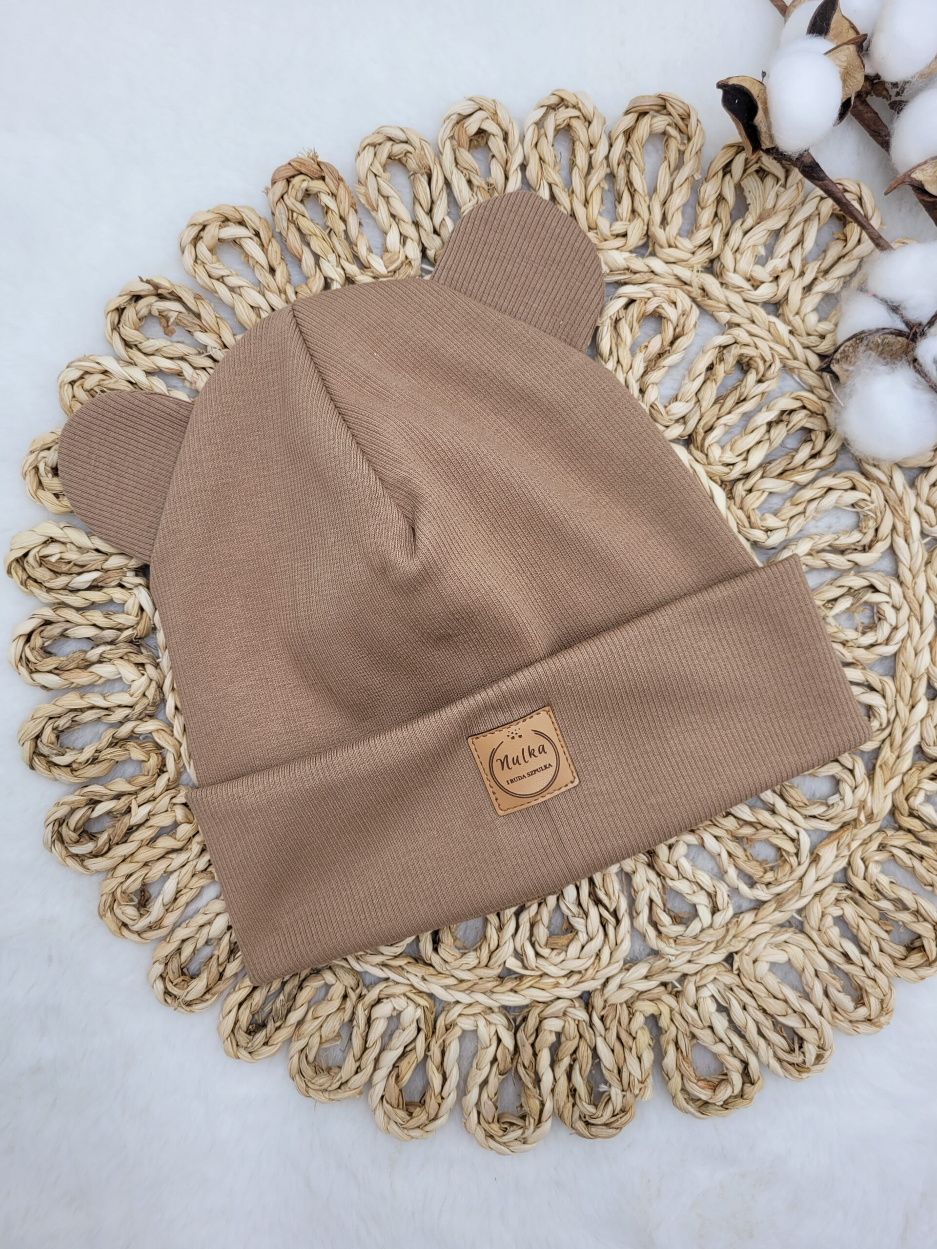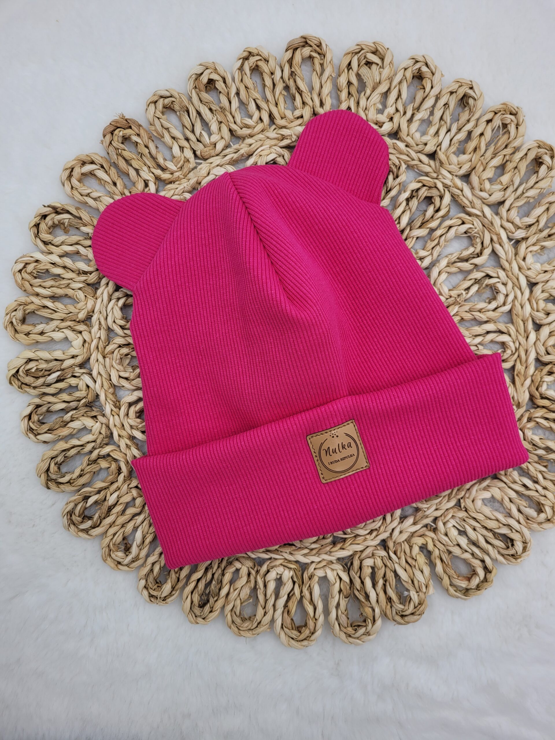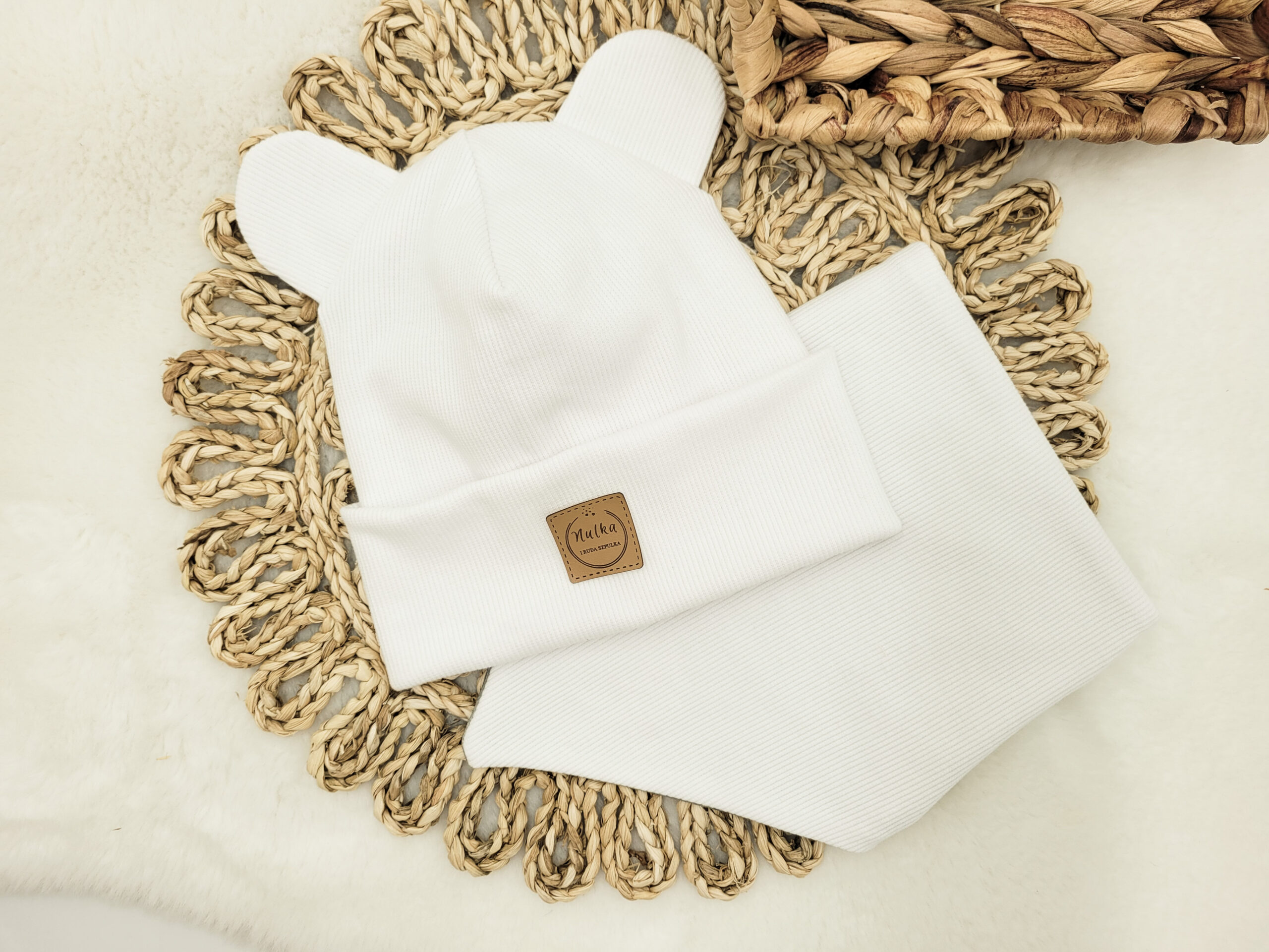 Komplet z misiowymi uszkami dla dziewczynki z kominem lub chustą do wyboru, prążkowany.