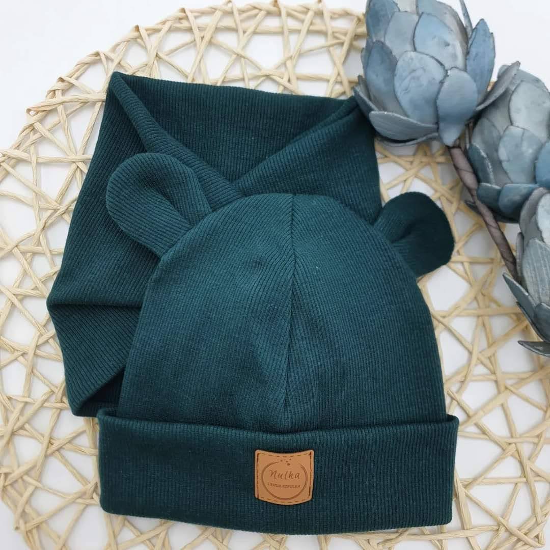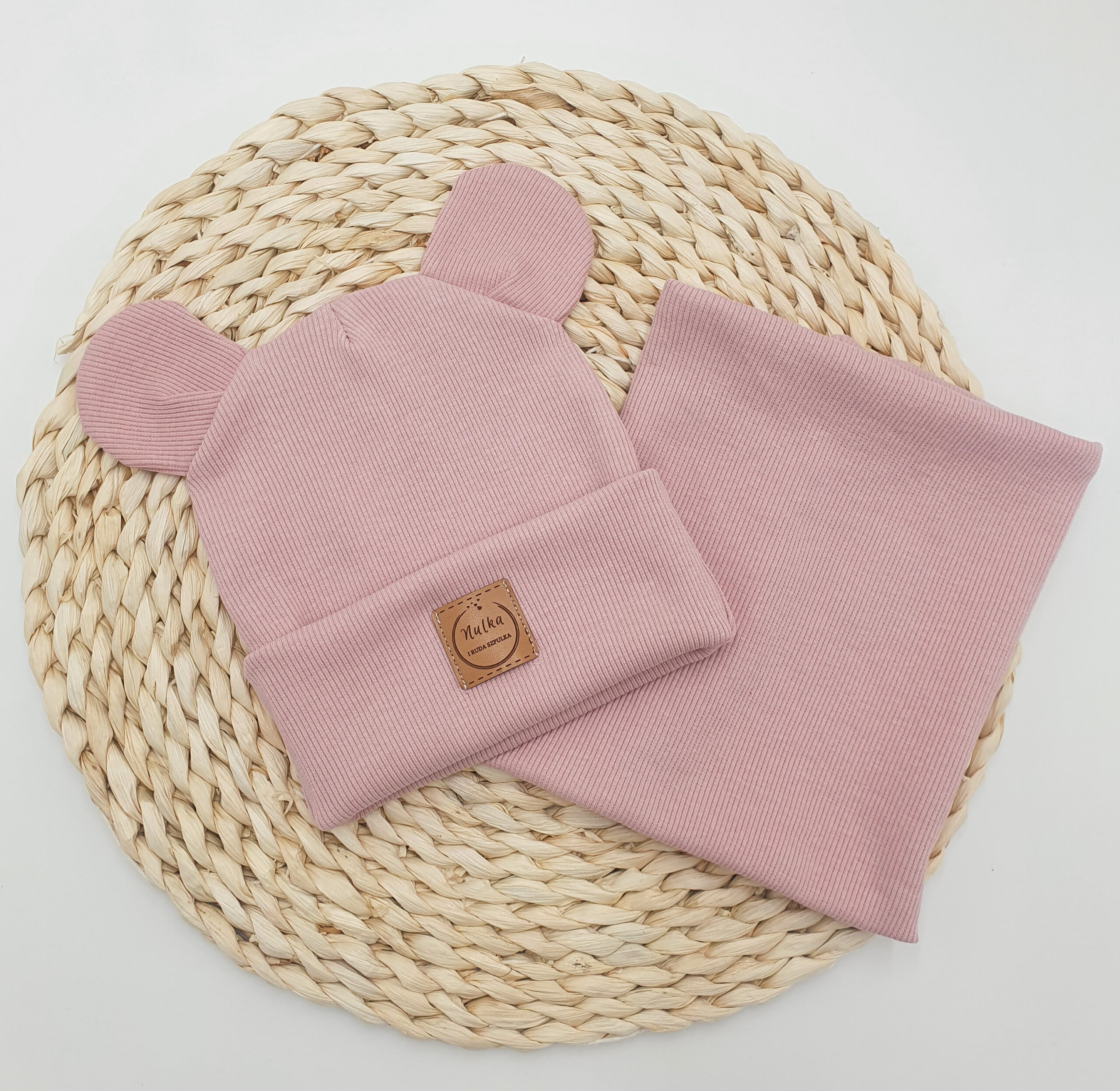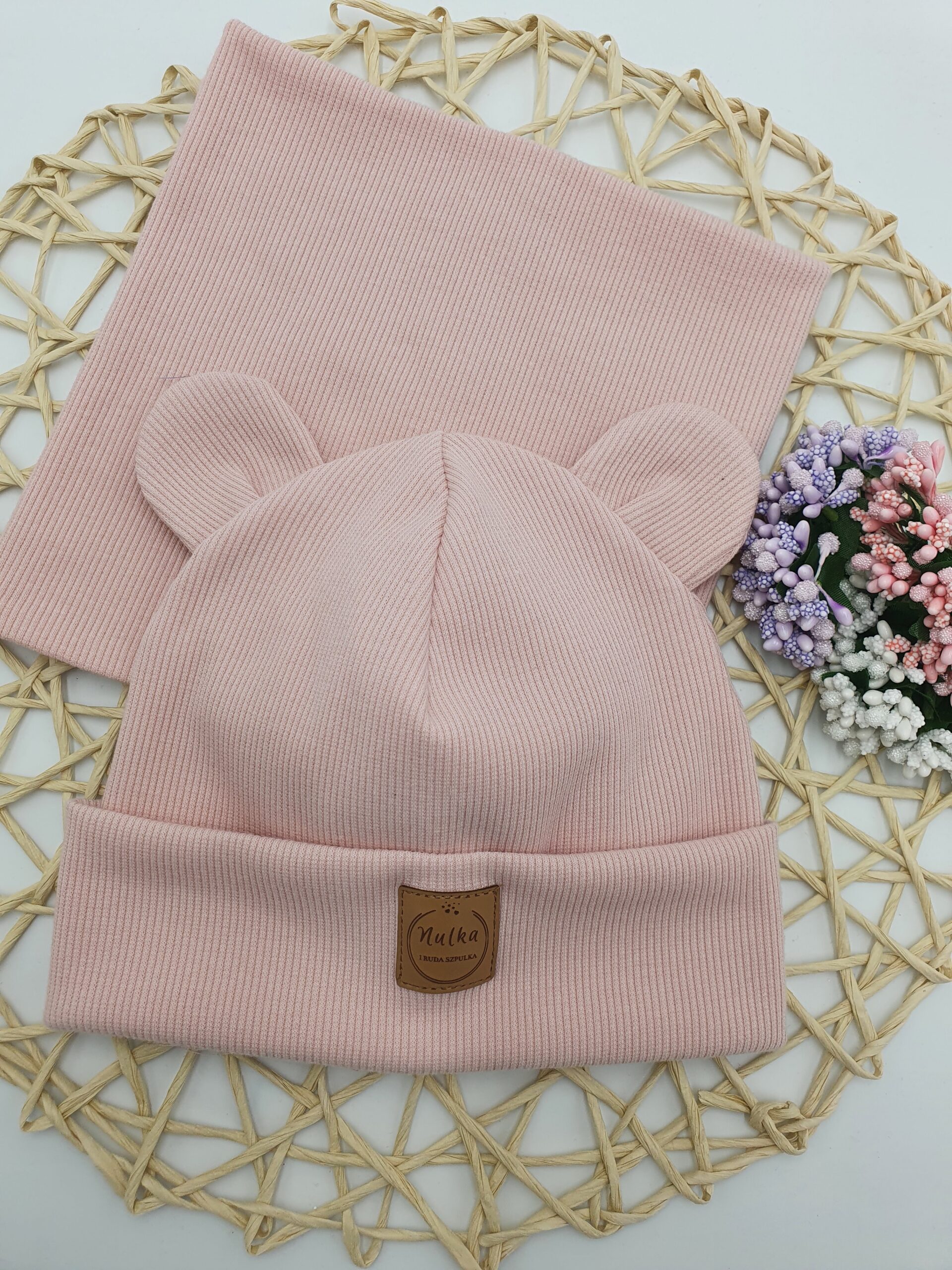 Komplet z misiowymi uszkami dla dziewczynki z kominem lub chustą do wyboru, prążkowany.