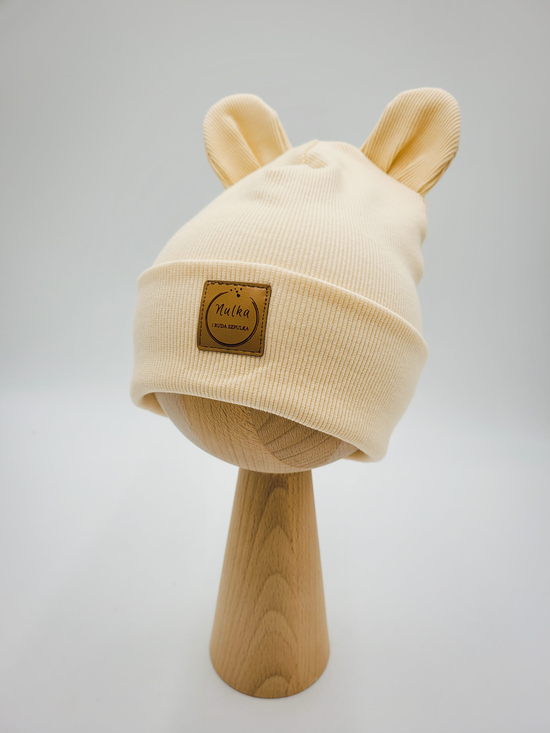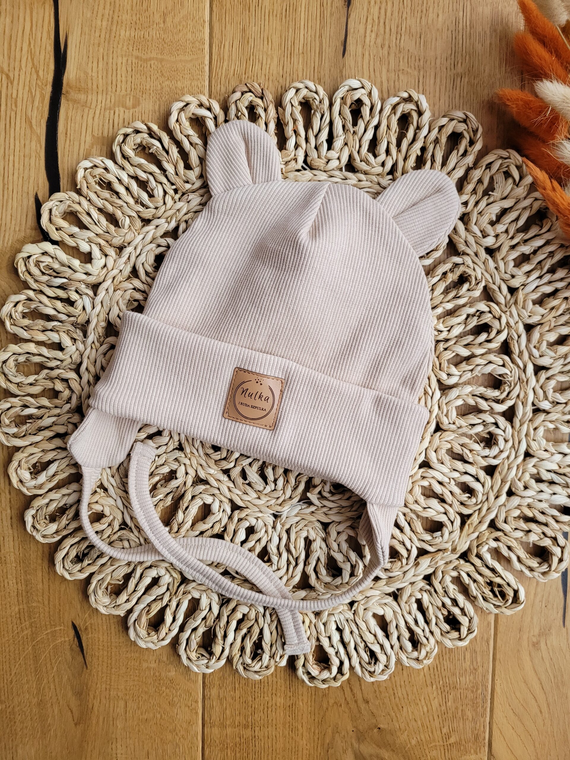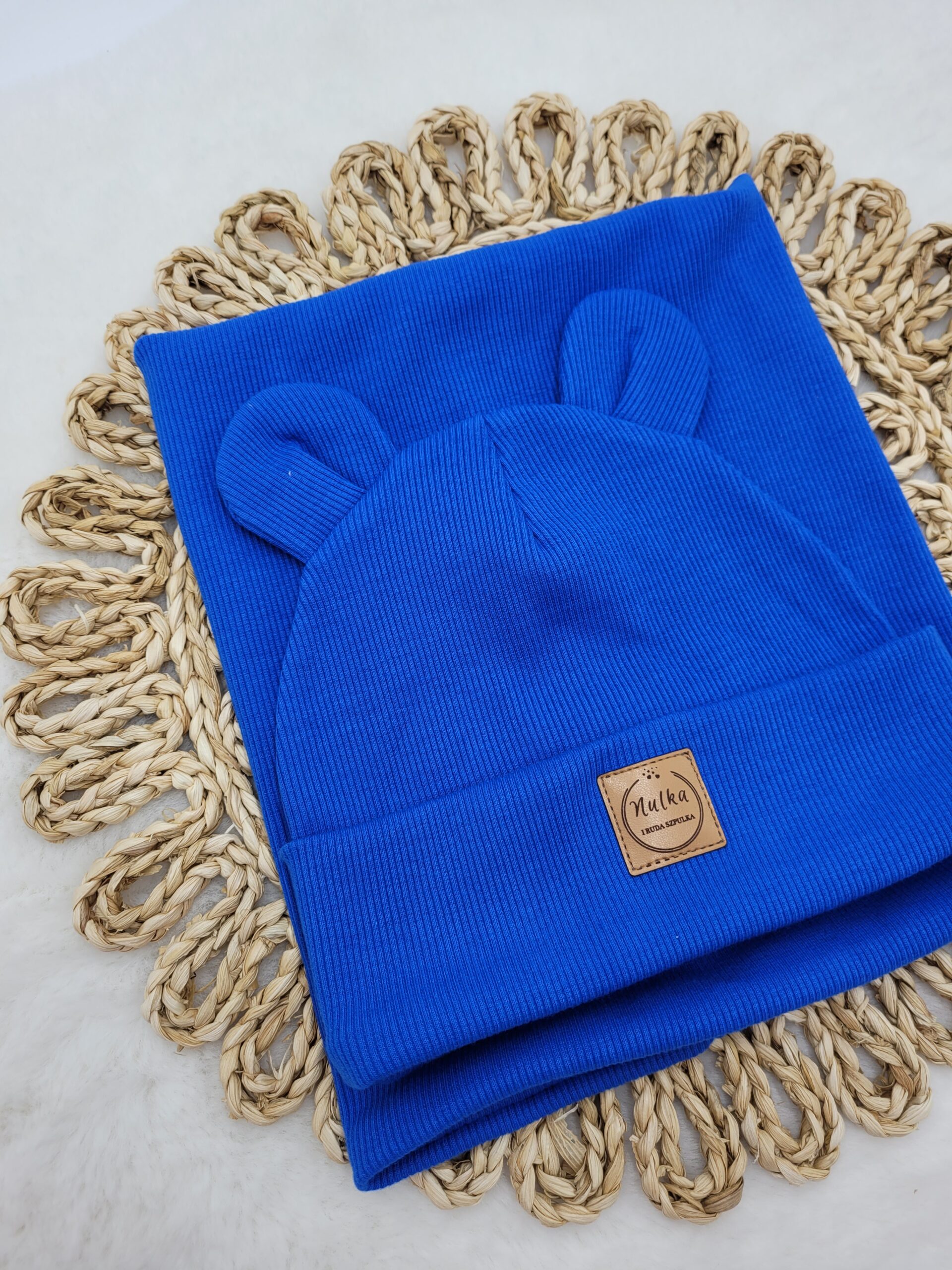 Komplet z misiowymi uszkami dla dziewczynki z kominem lub chustą do wyboru, prążkowany.