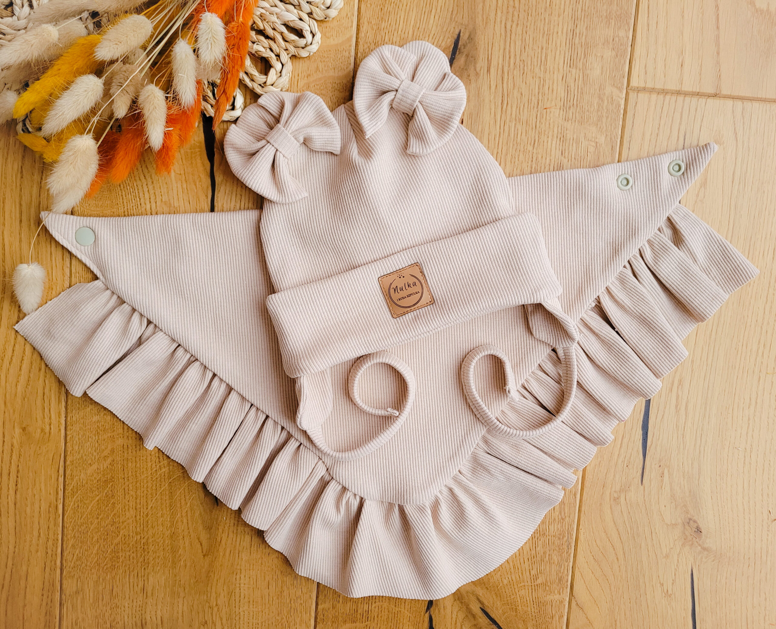Komplet z dzianiny prążkowanej dla mniejszych i większych dziewczynek. Czapka ozdobiona misiowymi uszkami z dwoma małymi kokardkami, które dodają uroku i sprawiają, że czapka wygląda mega dziewczęco. Czapka może być klasyczna lub z wiązana z nausznikami.