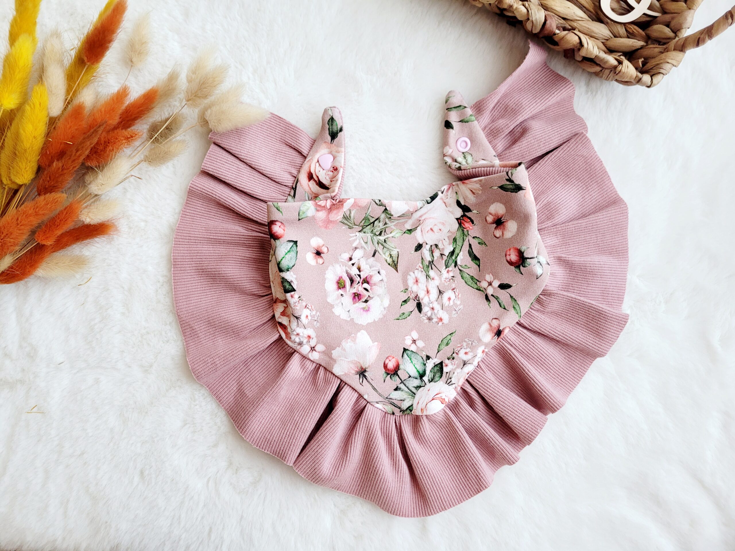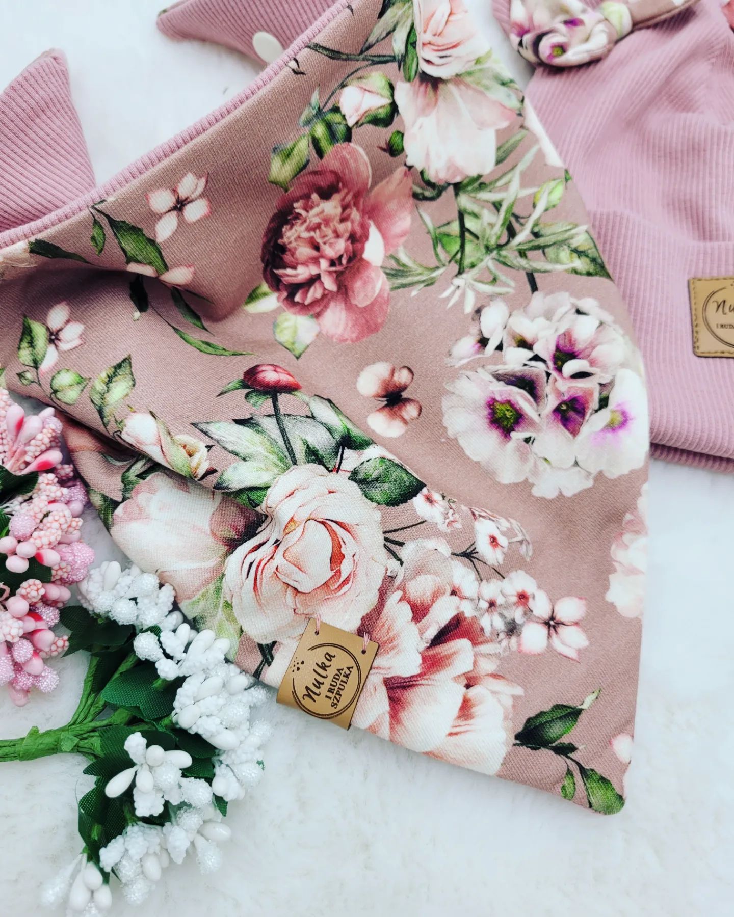 Komplet dla dziewczynki uszyty z dzianiny prążkowanej w wybranym kolorze z połączeniu z dresówką wzór Malowane róże. Czapka to klasyczna pilotka ozdobiona misiowymi uszkami i wzorzystymi kokardkami. Wiązanie wykonane z dzianiny prążkowanej.