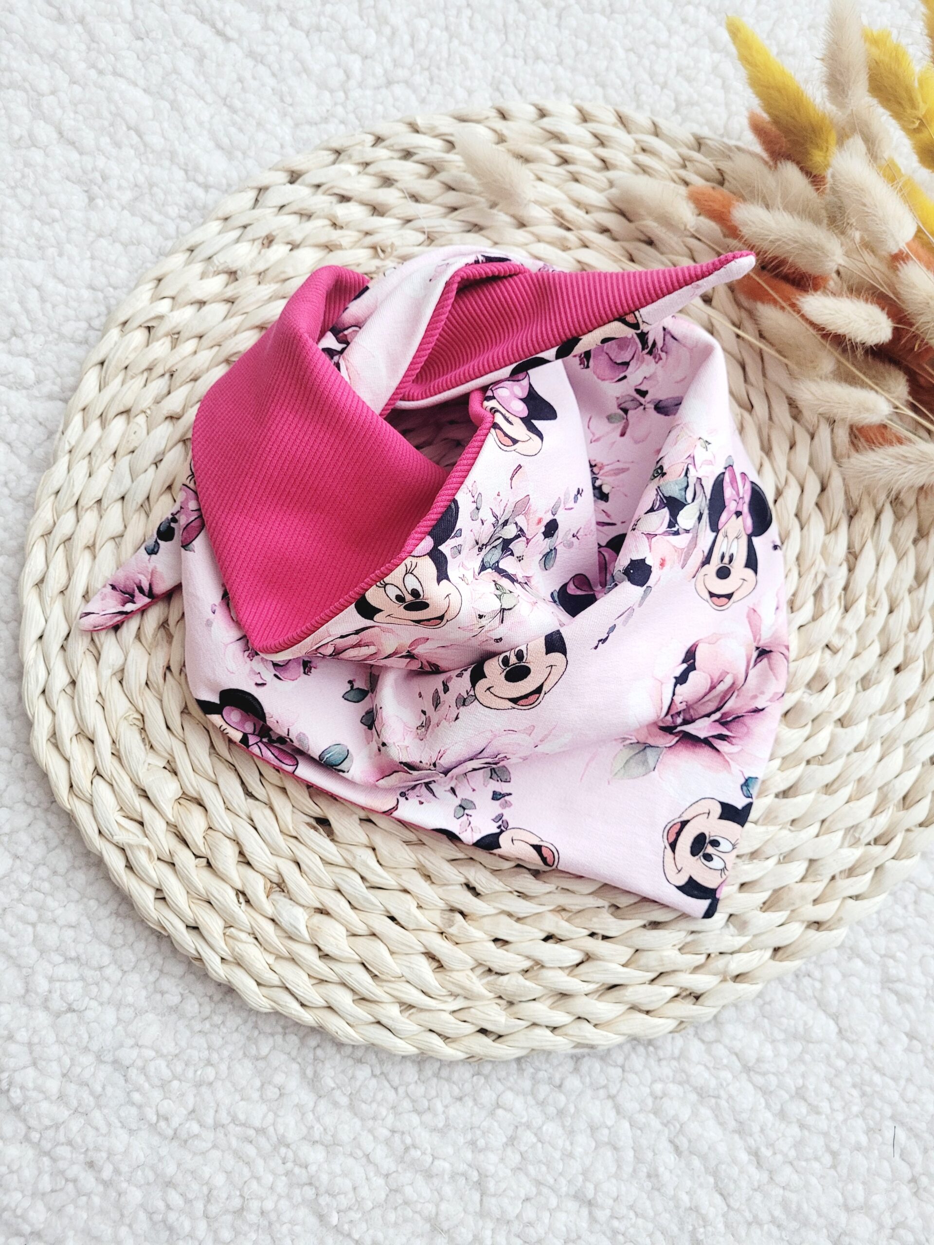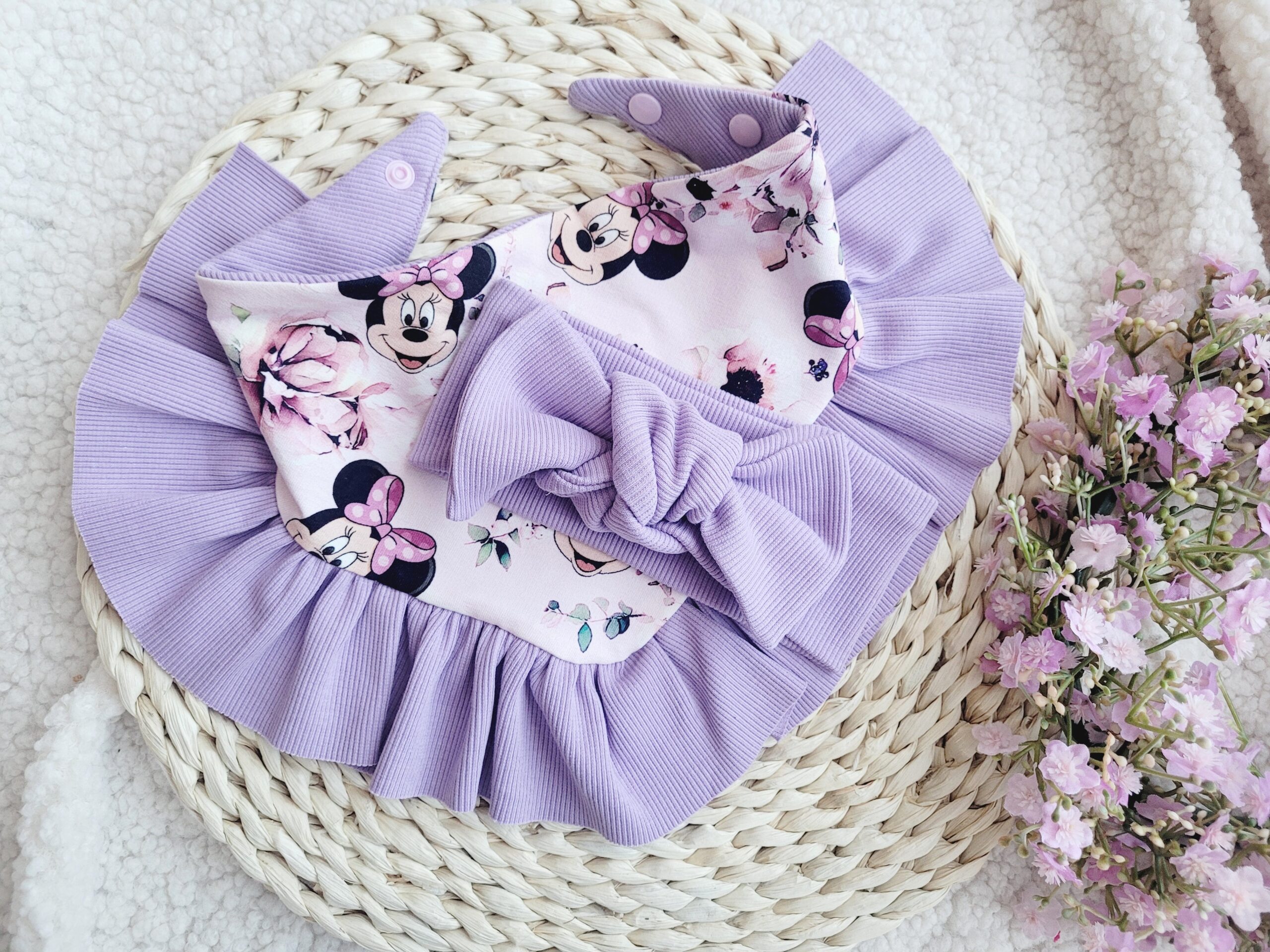 Komplet dla dziewczynki uszyty z dzianiny prążkowanej w wybranym kolorze z połączeniu z dresówką wzór  Minnie. Czapka to klasyczna pilotka ozdobiona misiowymi uszkami i wzorzystymi kokardkami. Wiązanie wykonane z dzianiny prążkowanej.