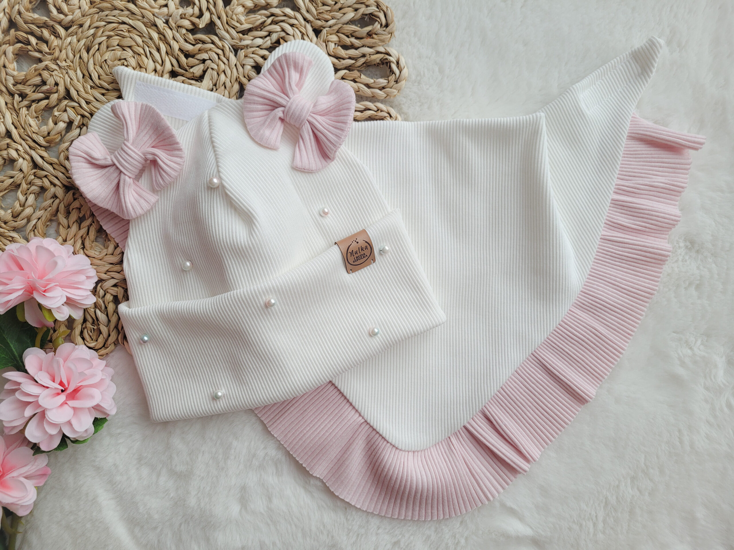 Czapka została ozdobiona misiowymi uszkami i kokardkami pod kolor falbanki w chuście a także ma piękne, delikatne perełki na przodzie.