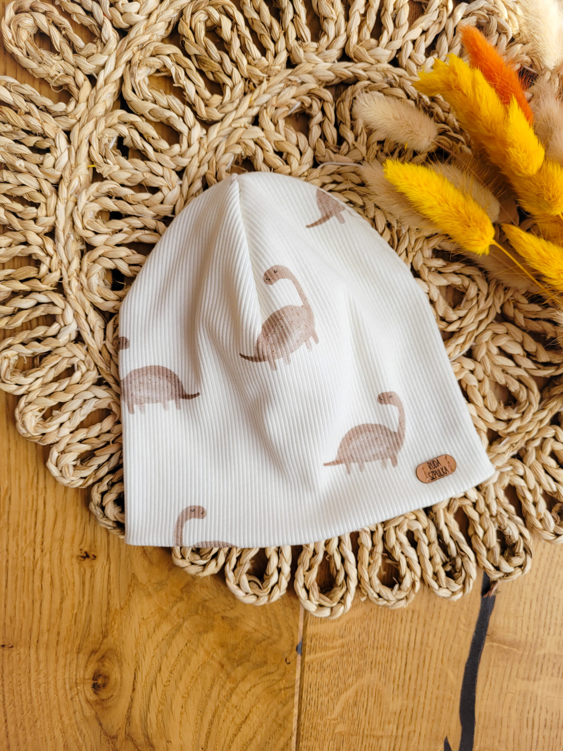 Czapka i komin lub chusta z dzianiny prążkowanej premium w dinozaury. Czapka klasyczna lub ozdobiona misiowymi uszkami.