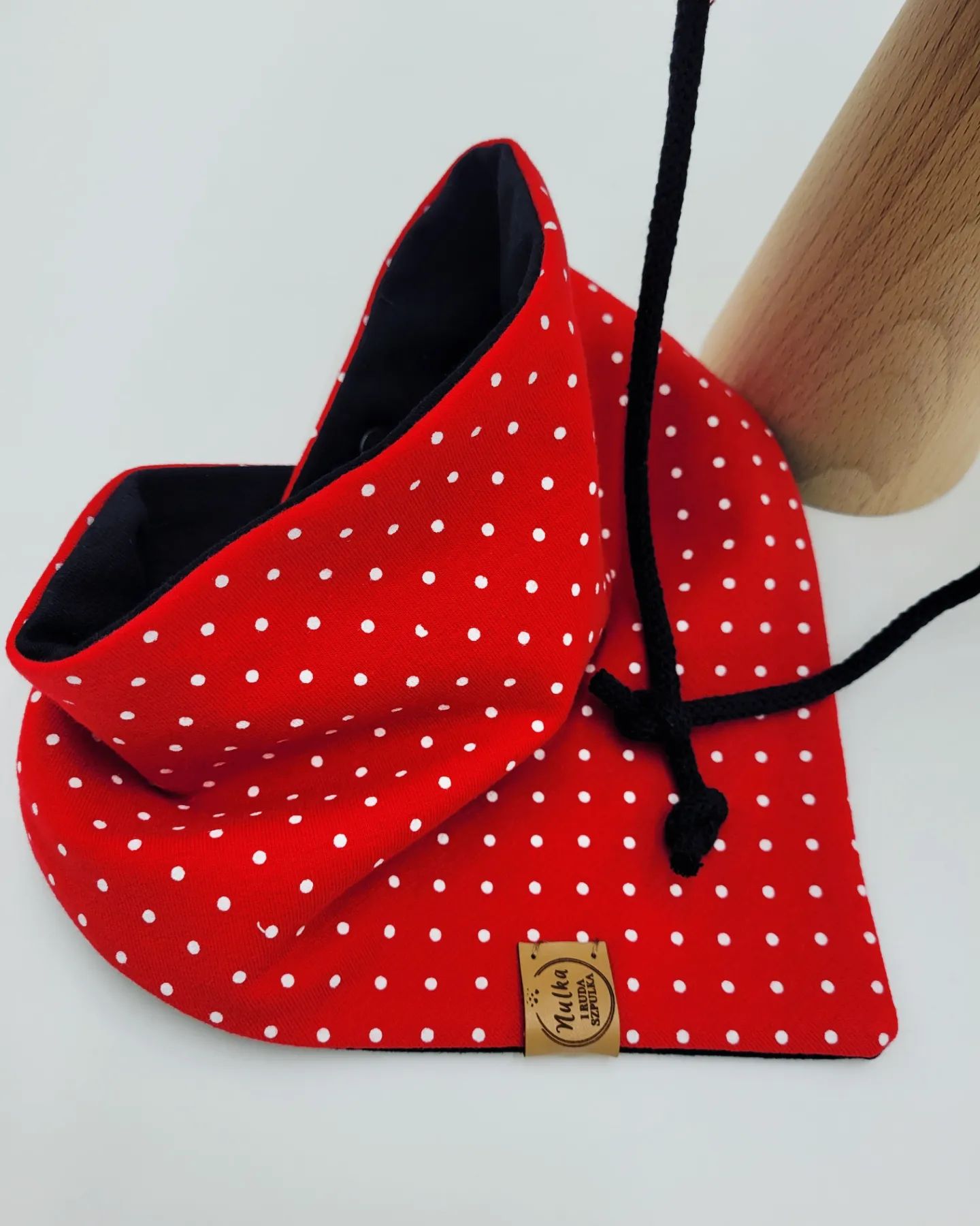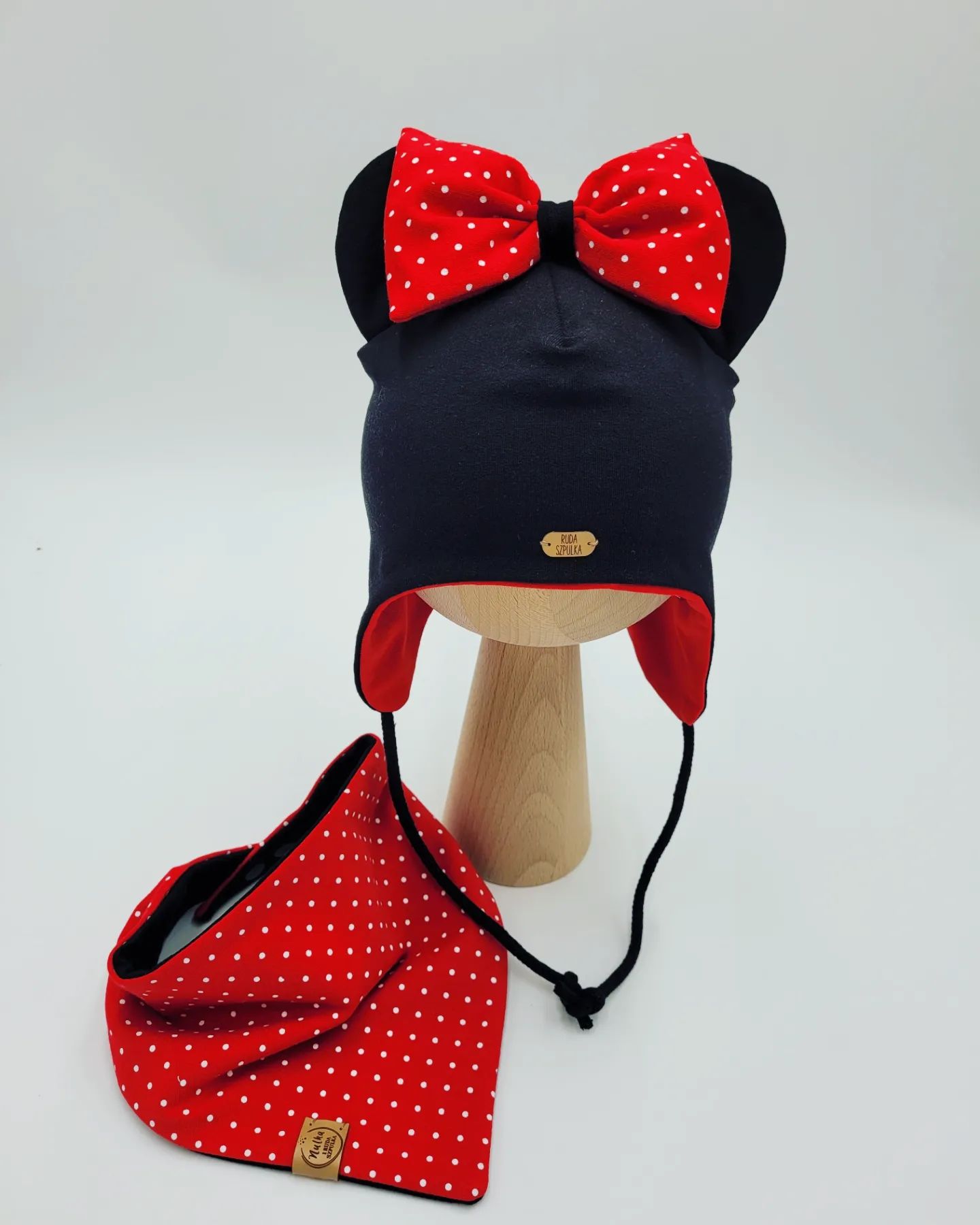 Przepiękny jesienno/wiosenny komplet uszyty z podwójnej dzianiny dresowej ozdobiony myszkowymi uszami i czerwoną pulchniutką kokardą. Czapka jest wiązana dzięki czemu nie odsłania uszek i chroni je przed wiatrem. Do kompletu uszyta została dwustronna chusta pod szyję zapinana na wygodne, regulowane napki. Możesz wybrać chustę pod szyję klasyczny trójkącik lub komin.