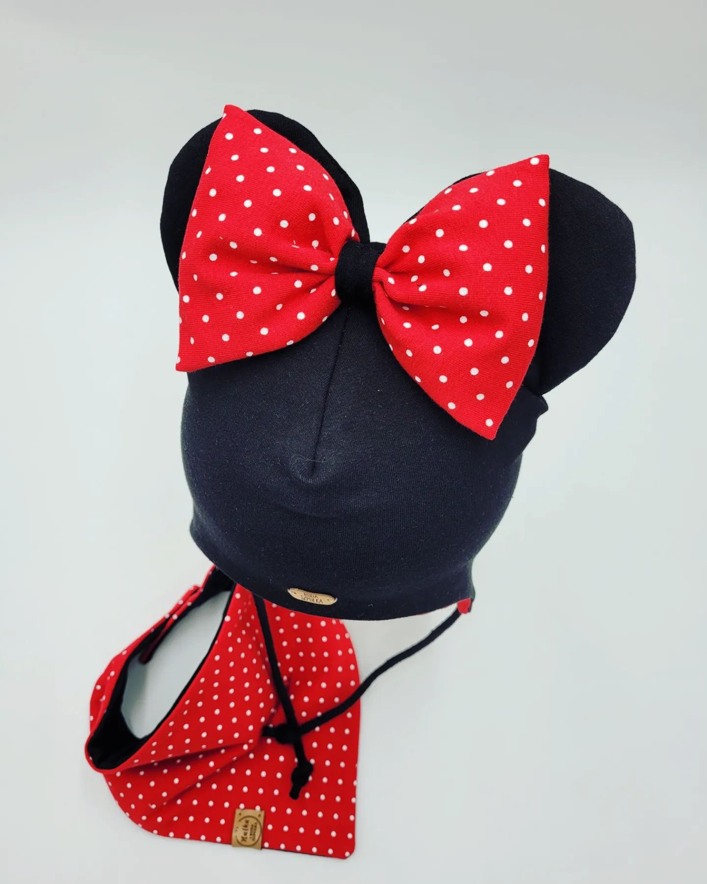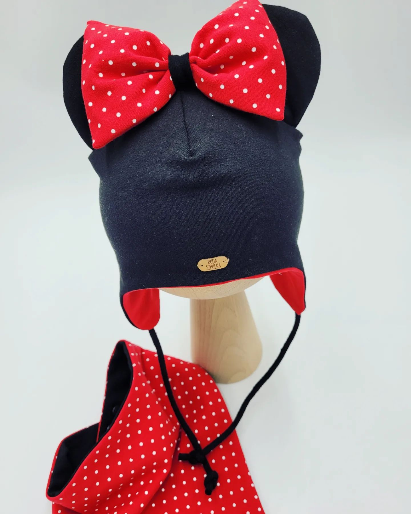 Przepiękny jesienno/wiosenny komplet uszyty z podwójnej dzianiny dresowej ozdobiony myszkowymi uszami i czerwoną pulchniutką kokardą. Czapka jest wiązana dzięki czemu nie odsłania uszek i chroni je przed wiatrem. Do kompletu uszyta została dwustronna chusta pod szyję zapinana na wygodne, regulowane napki. Możesz wybrać chustę pod szyję klasyczny trójkącik lub komin.