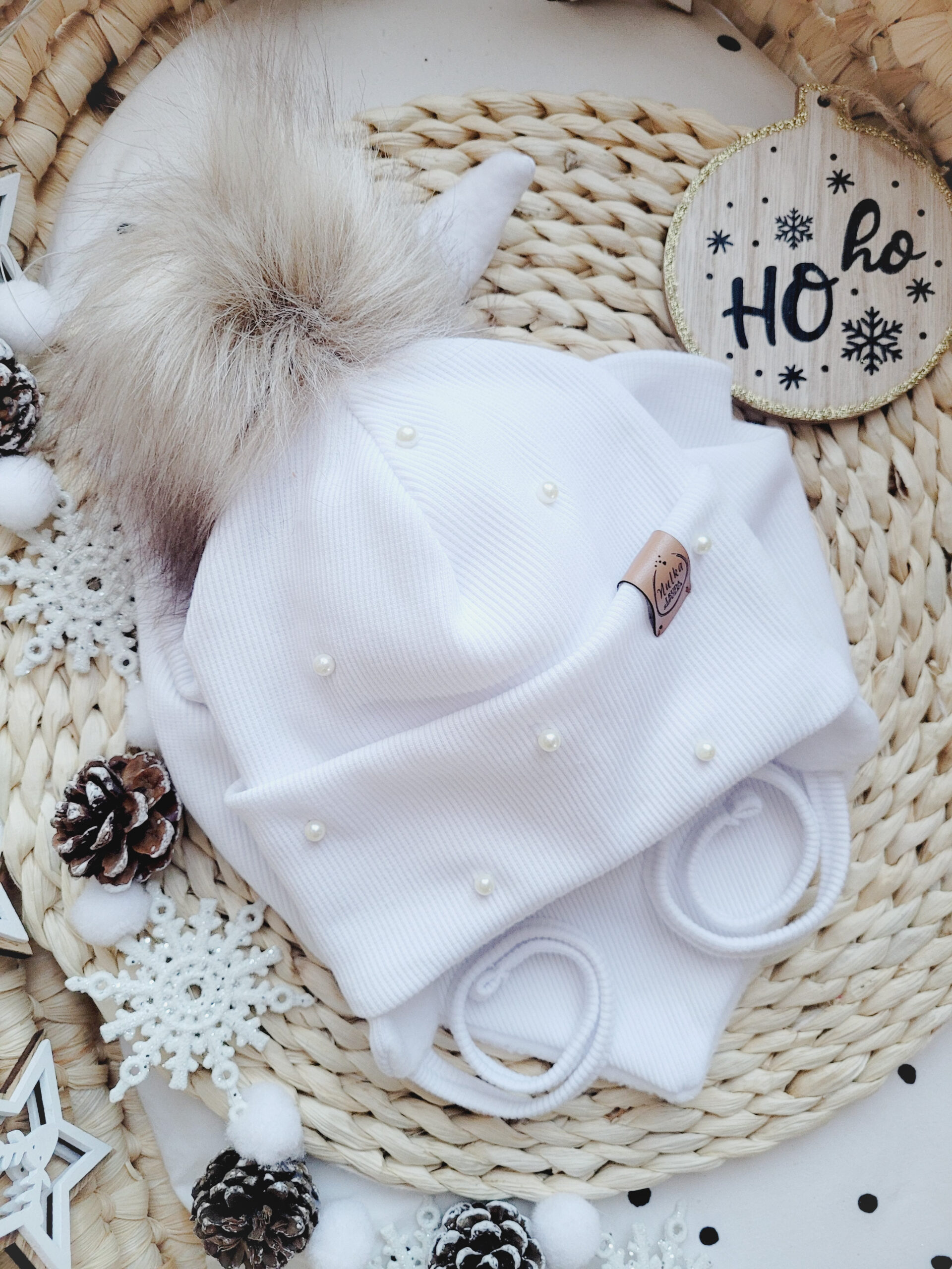 Komplet zawiera czapkę w dwóch stylach: prostą lub cieplejszą z wywinięciem na uszy. Możesz wybrać wersję z wiązaniem lub bez, a także dodać jeden lub dwa ręcznie robione pompony w dowolnym kolorze. Czapka ozdobiona jest również perełkami – dopasowanymi kolorystycznie, lub w wybranym odcieniu, na życzenie.