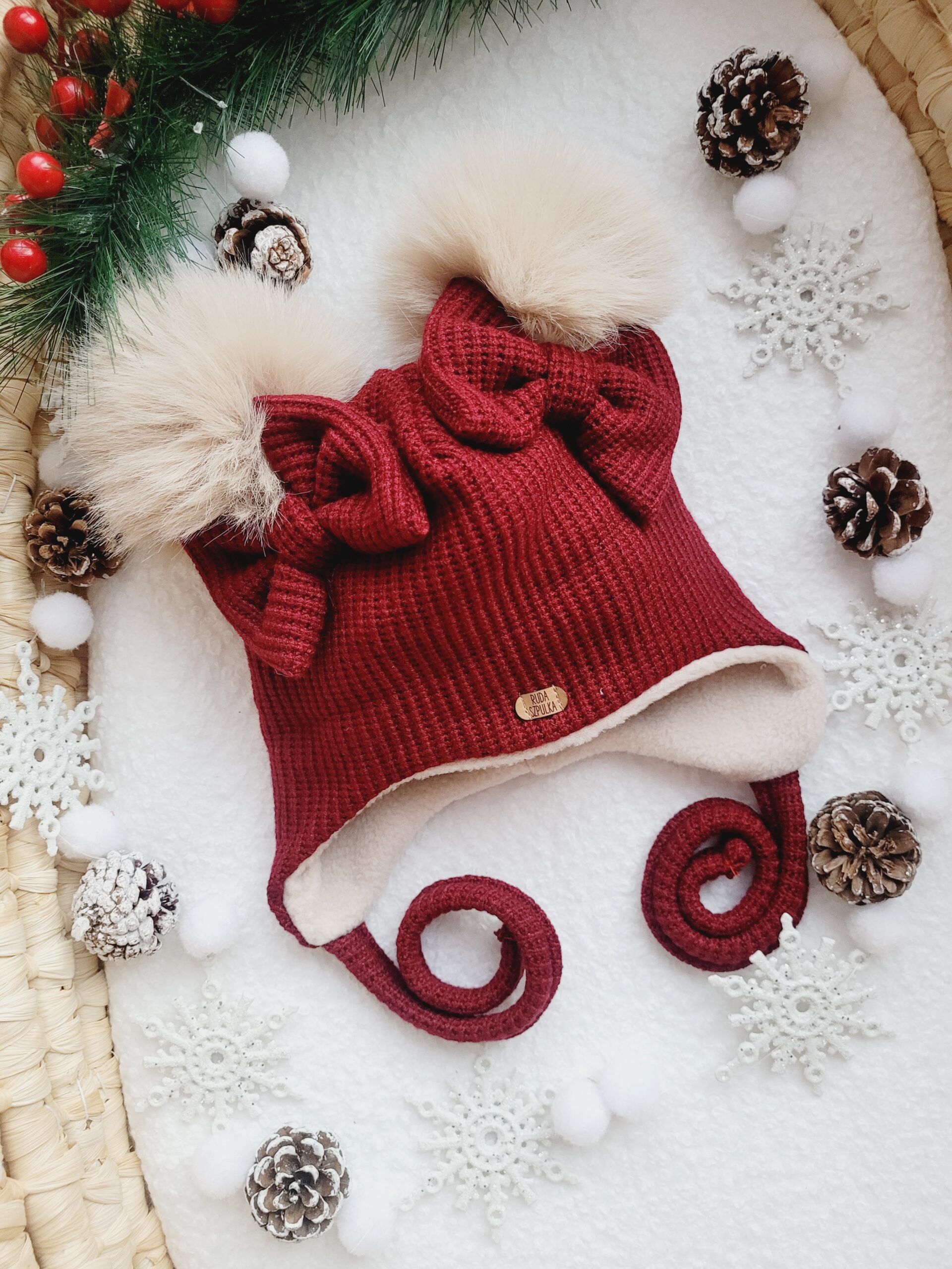 Komplet zawiera wiązaną czapkę pilotkę, ozdobioną ręcznie robionymi pomponami i kokardkami w kolorze dzianiny. Możesz wybrać inny kolor pomponów – wystarczy, że dodasz notatkę do zamówienia.
