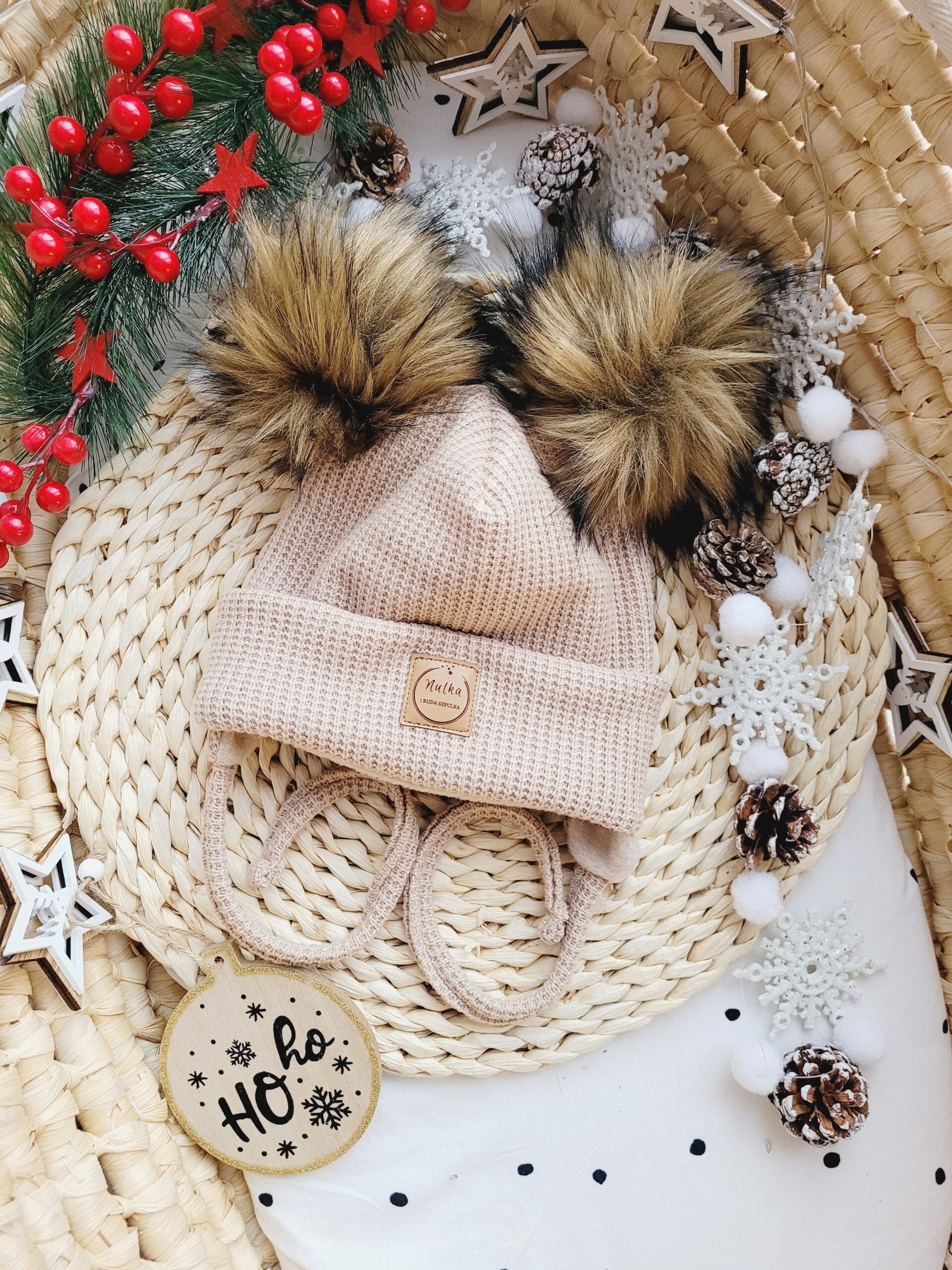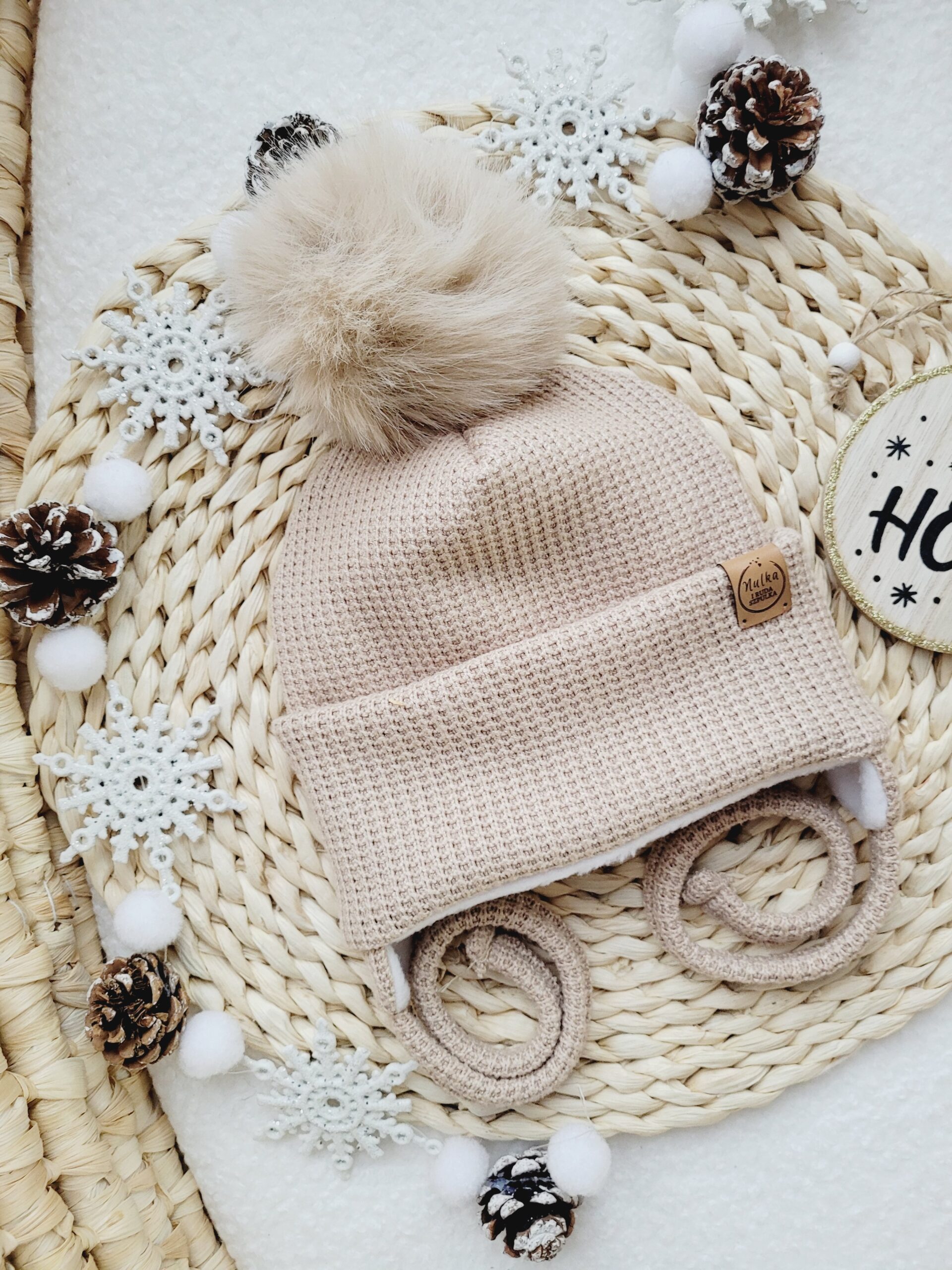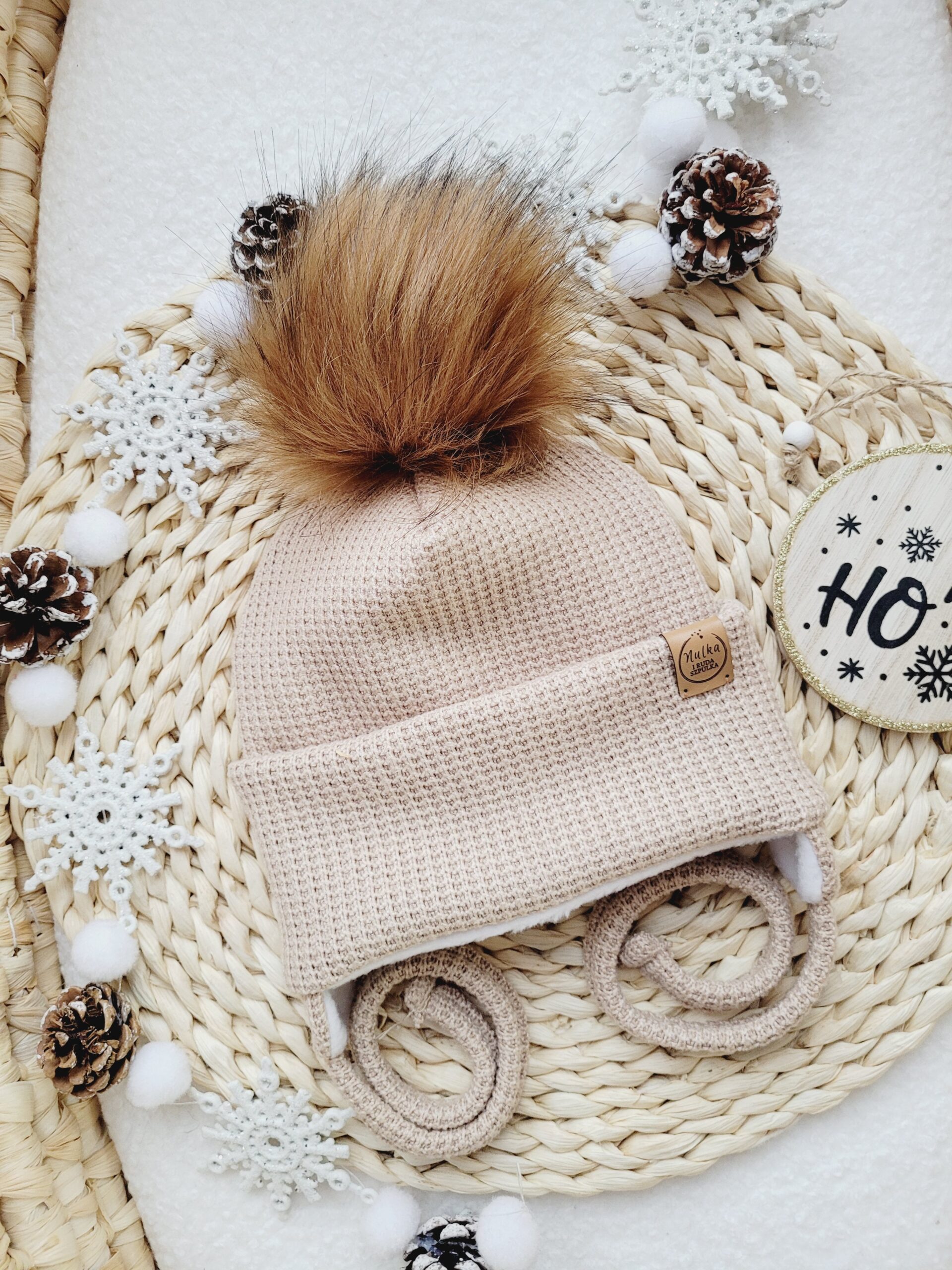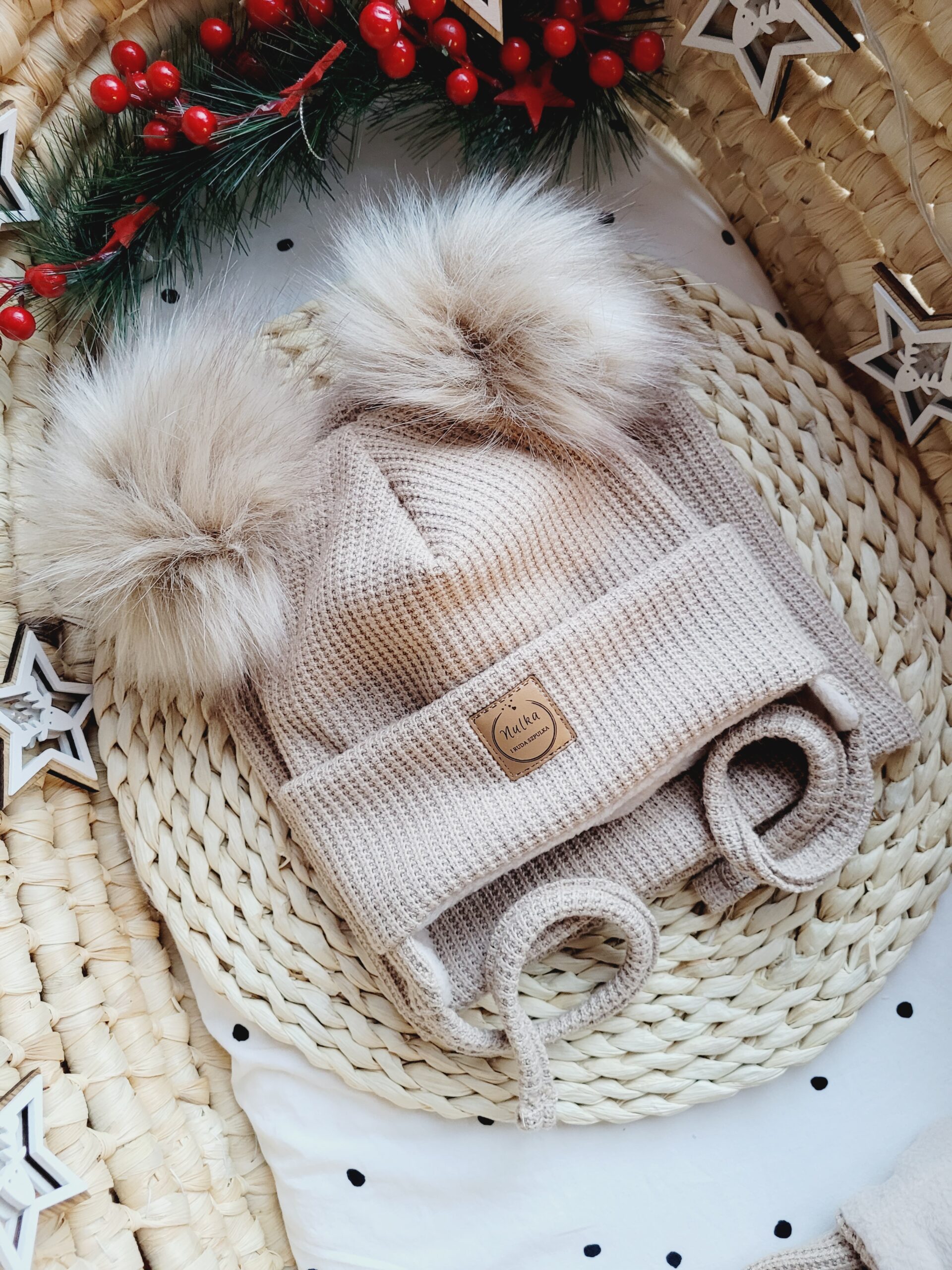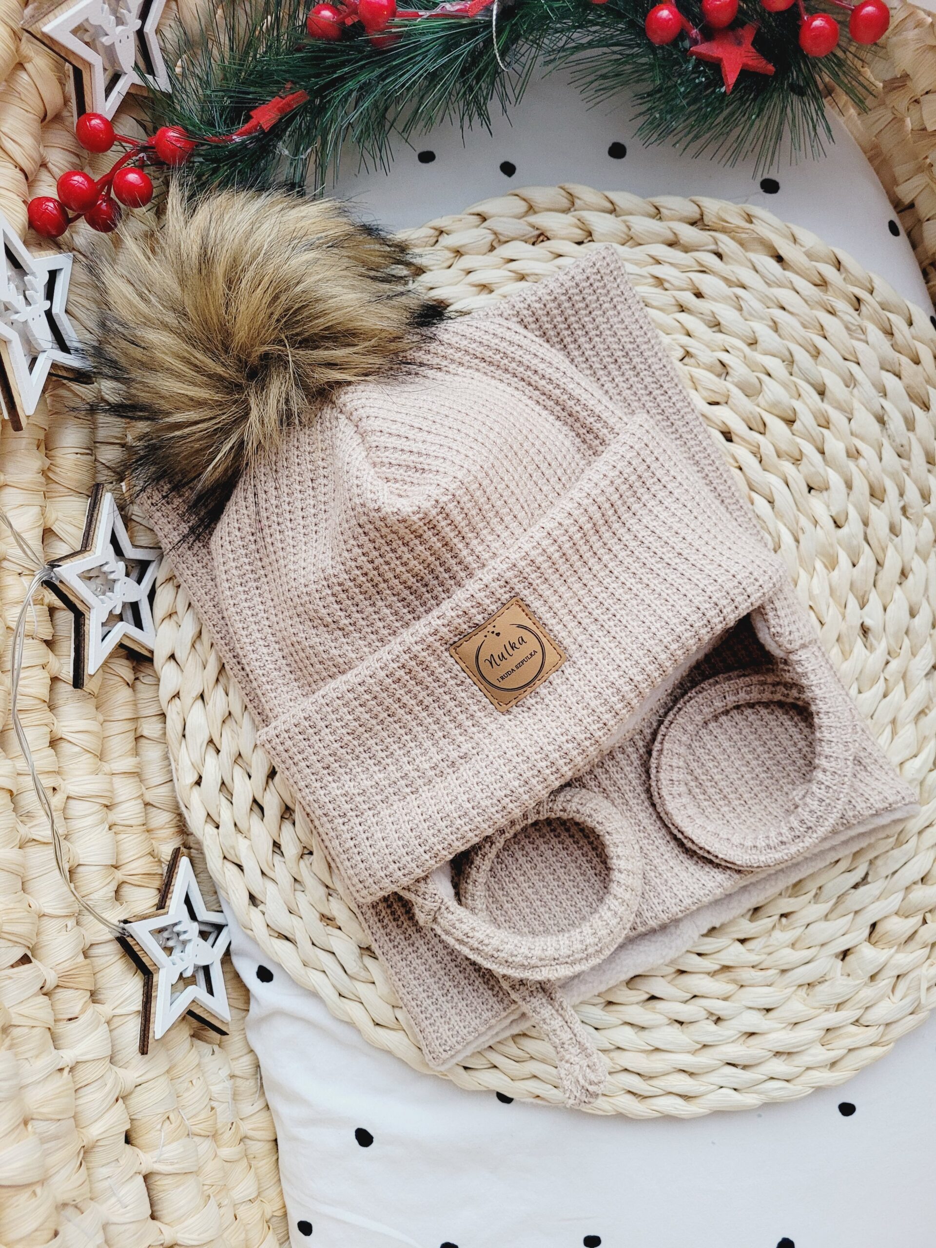 Odkryj nasz uroczy komplet zimowy, stworzony z miękkiej i przyjemnej w dotyku dzianiny sweterkowej w eleganckim beżowym odcieniu. Ten wyjątkowy zestaw doskonale sprawdzi się zarówno dla chłopców, jak i dziewczynek. Czapka w stylu beanie dostępna jest w wersji prostej lub z wywinięciem, a jej ozdobą są ręcznie robione pompony w wybranym przez Ciebie kolorze.