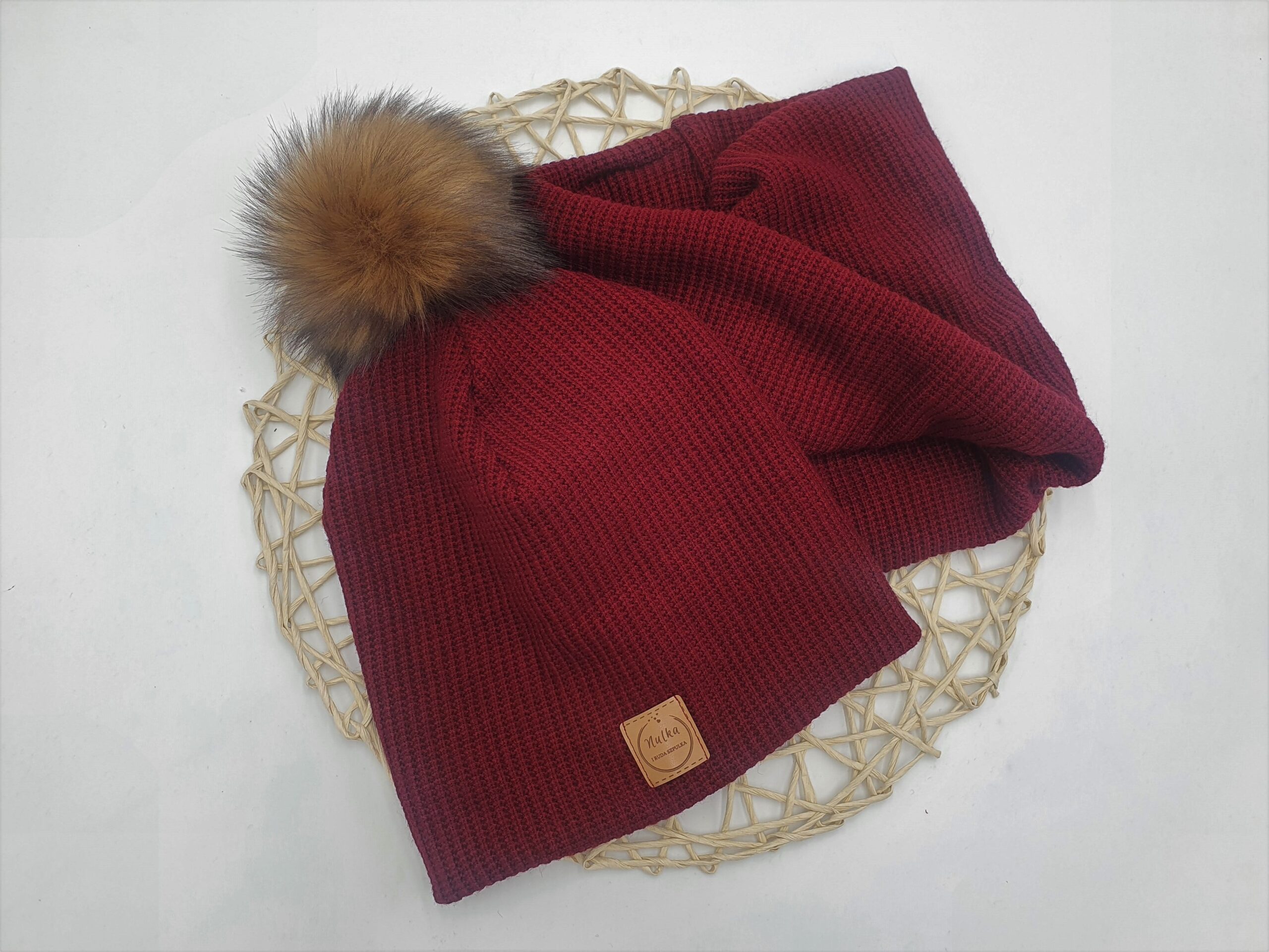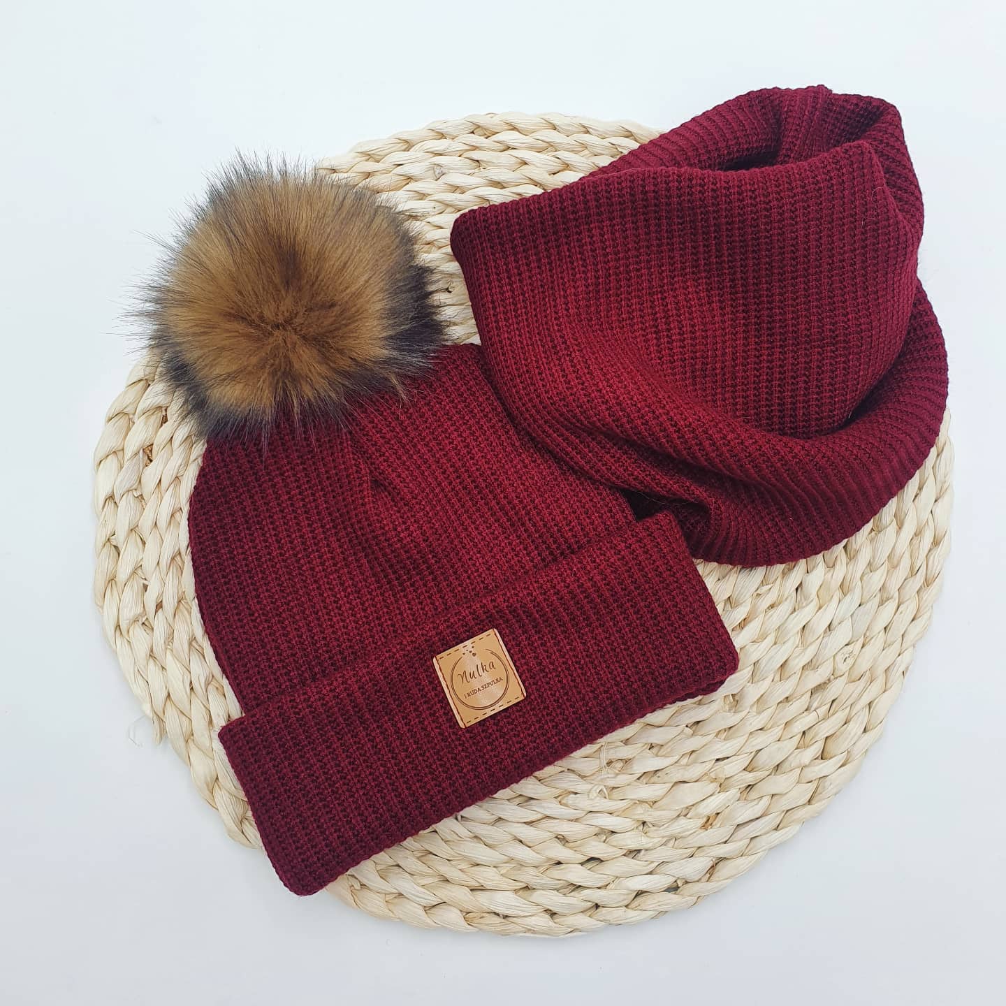 Zimowy komplet z pomponami lub bez w kolorze bordowym w rozmiarach 36-56. Czapka prosta lub wywinięta w zestawie z szalikiem, chustą lub kominem.