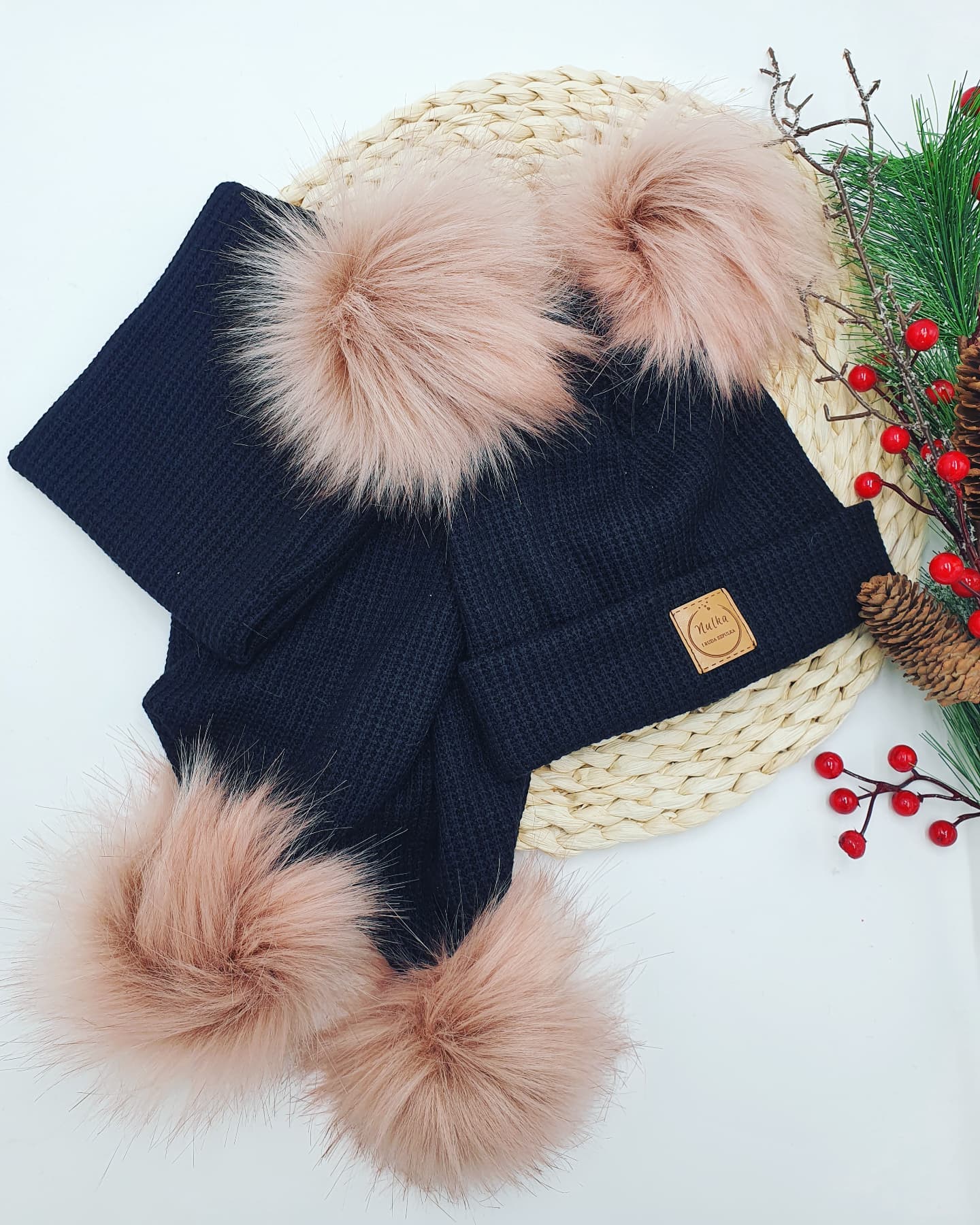 Komplet w czarnym kolorze ozdobiony ręcznie robionymi pomponami w rozmiarach 36-56. Czapka w dwóch wariantach do wyboru w zestawie z szalikiem, chustą wiązaną lub kominem.