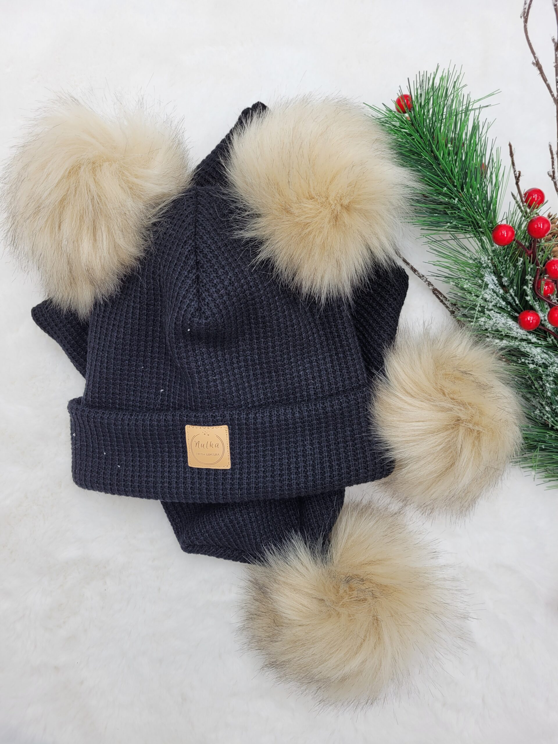 Odkryj nasz uroczy komplet zimowy, stworzony z miękkiej i przyjemnej w dotyku dzianiny sweterkowej w eleganckim czarnym odcieniu. Ten wyjątkowy zestaw doskonale sprawdzi się zarówno dla chłopców, jak i dziewczynek. Czapka w stylu beanie dostępna jest w wersji prostej lub z wywinięciem, a jej ozdobą są ręcznie robione pompony w wybranym przez Ciebie kolorze.