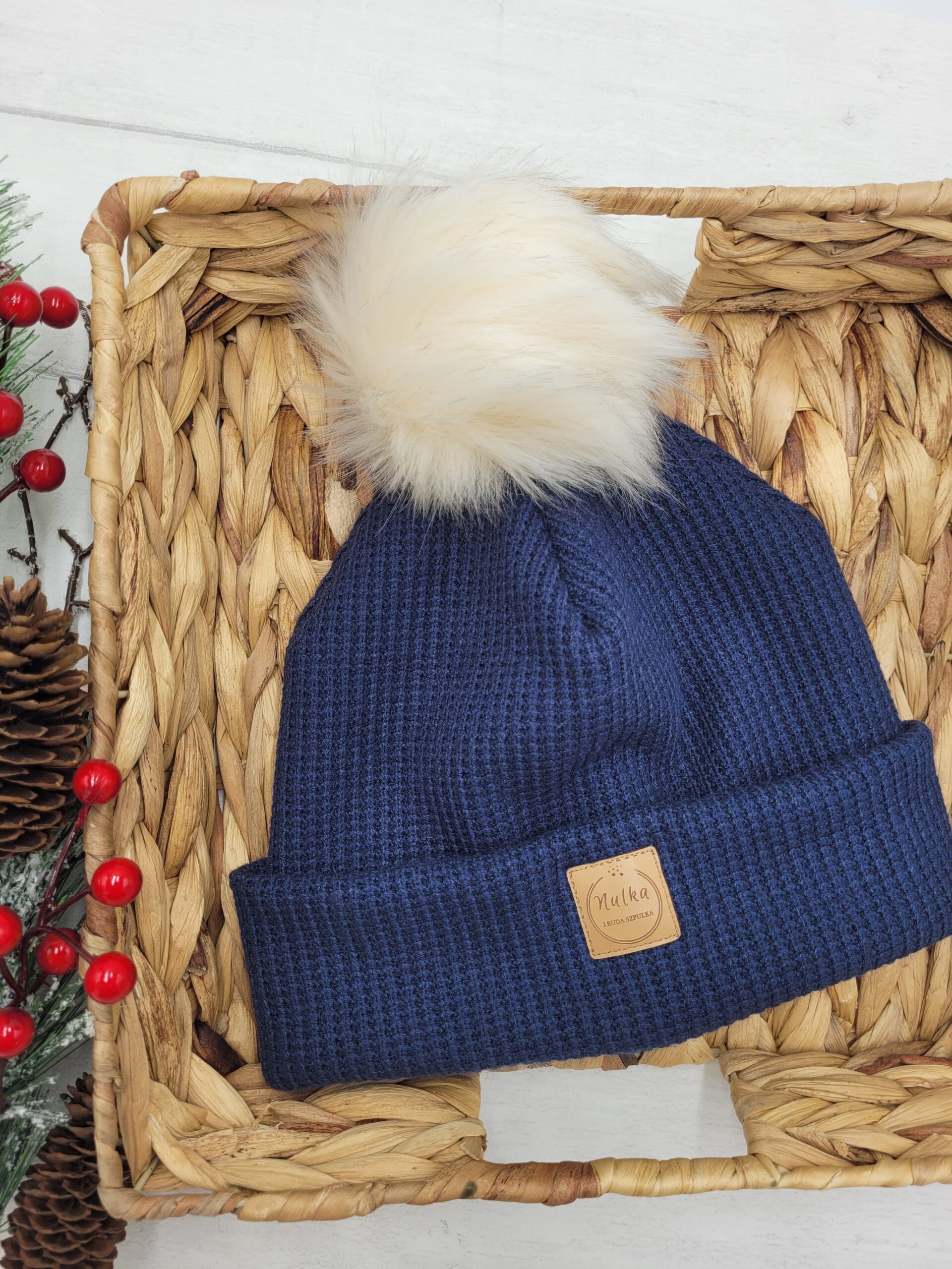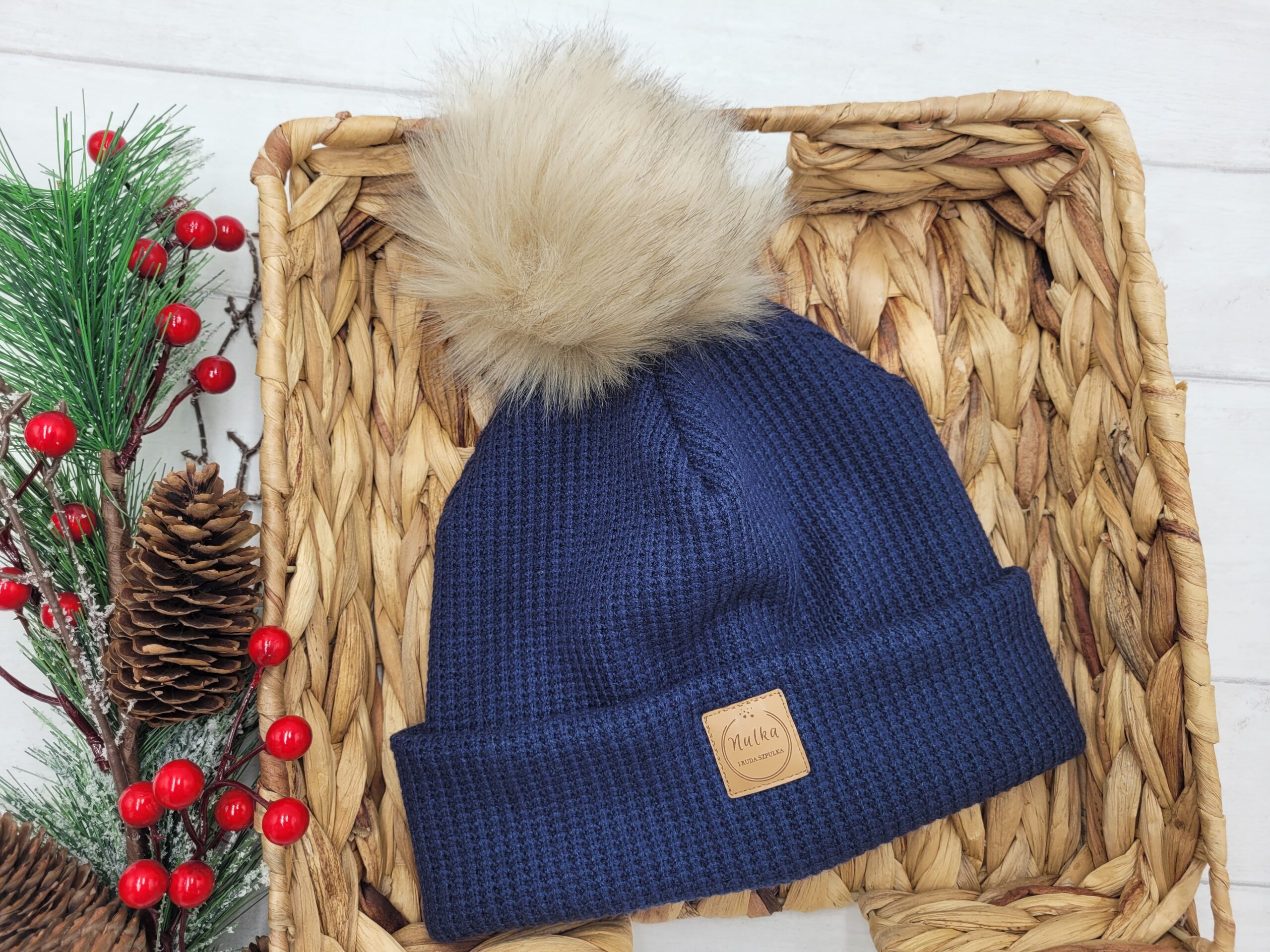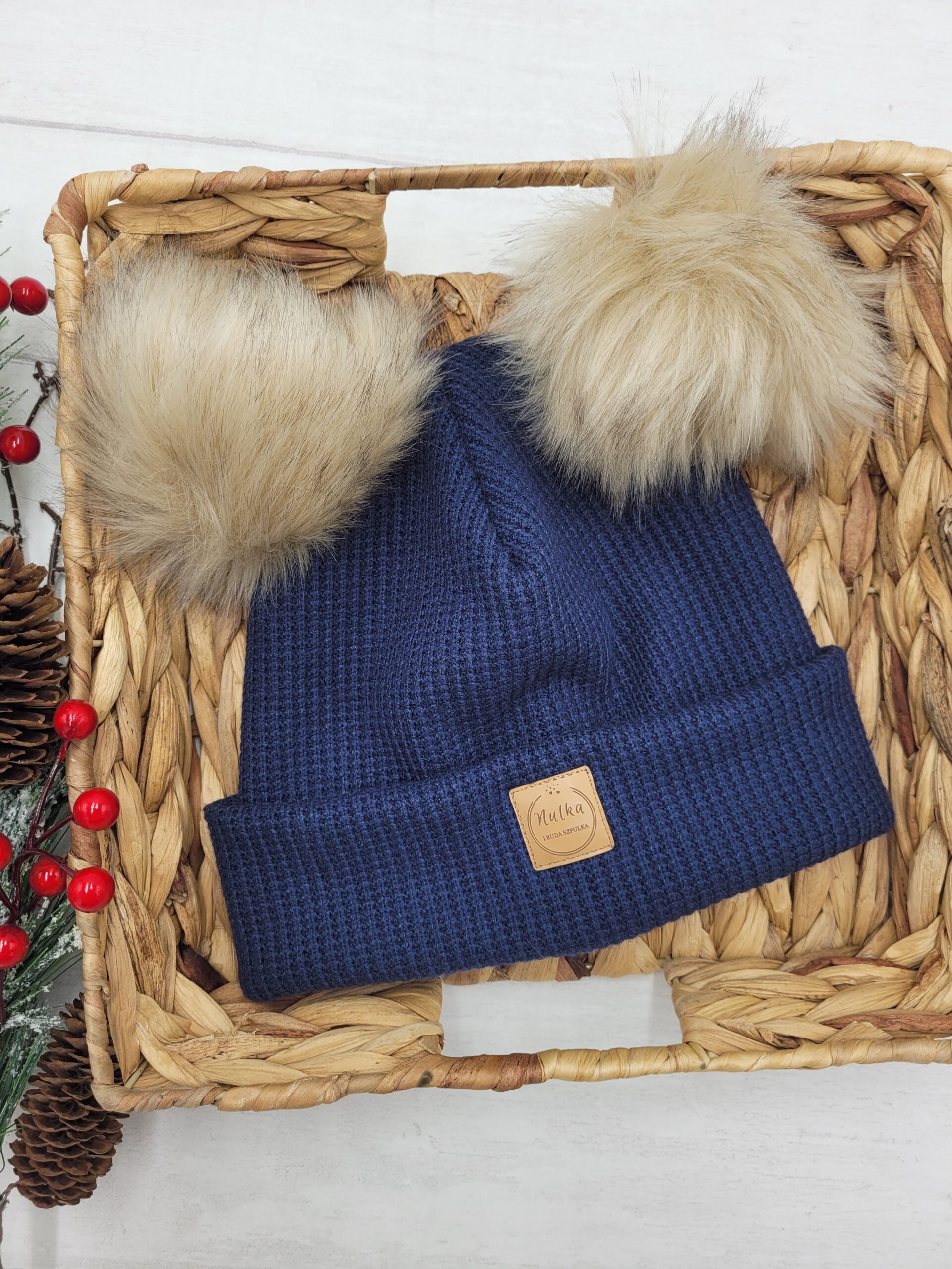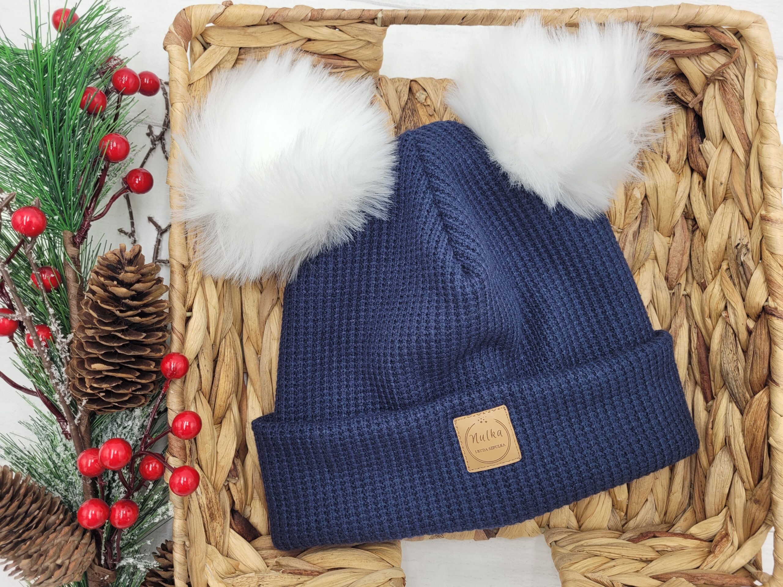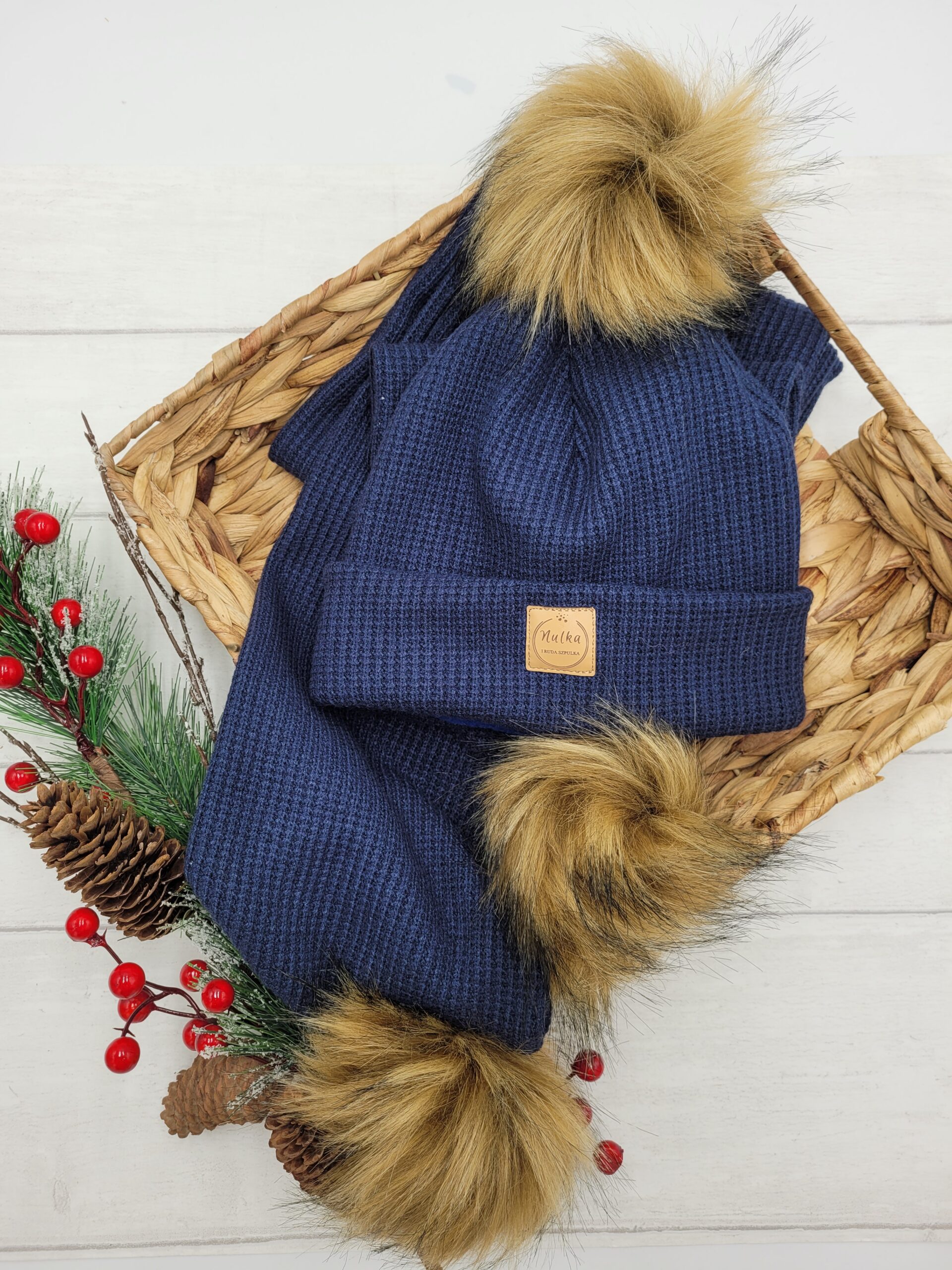Odkryj nasz uroczy komplet zimowy, stworzony z miękkiej i przyjemnej w dotyku dzianiny sweterkowej w eleganckim granatowym odcieniu. Ten wyjątkowy zestaw doskonale sprawdzi się zarówno dla chłopców, jak i dziewczynek. Czapka w stylu beanie dostępna jest w wersji prostej lub z wywinięciem, a jej ozdobą są ręcznie robione pompony w wybranym przez Ciebie kolorze.
