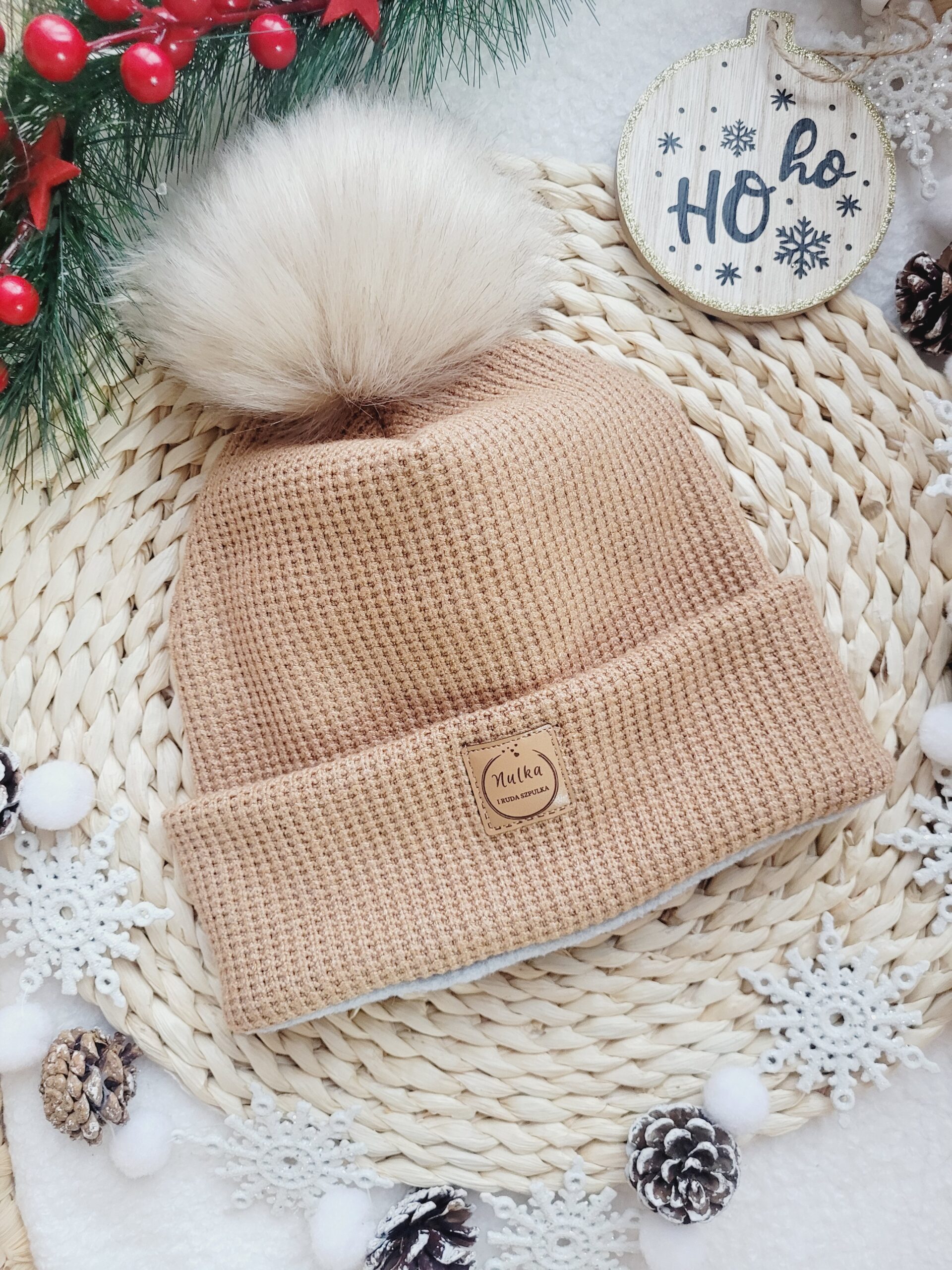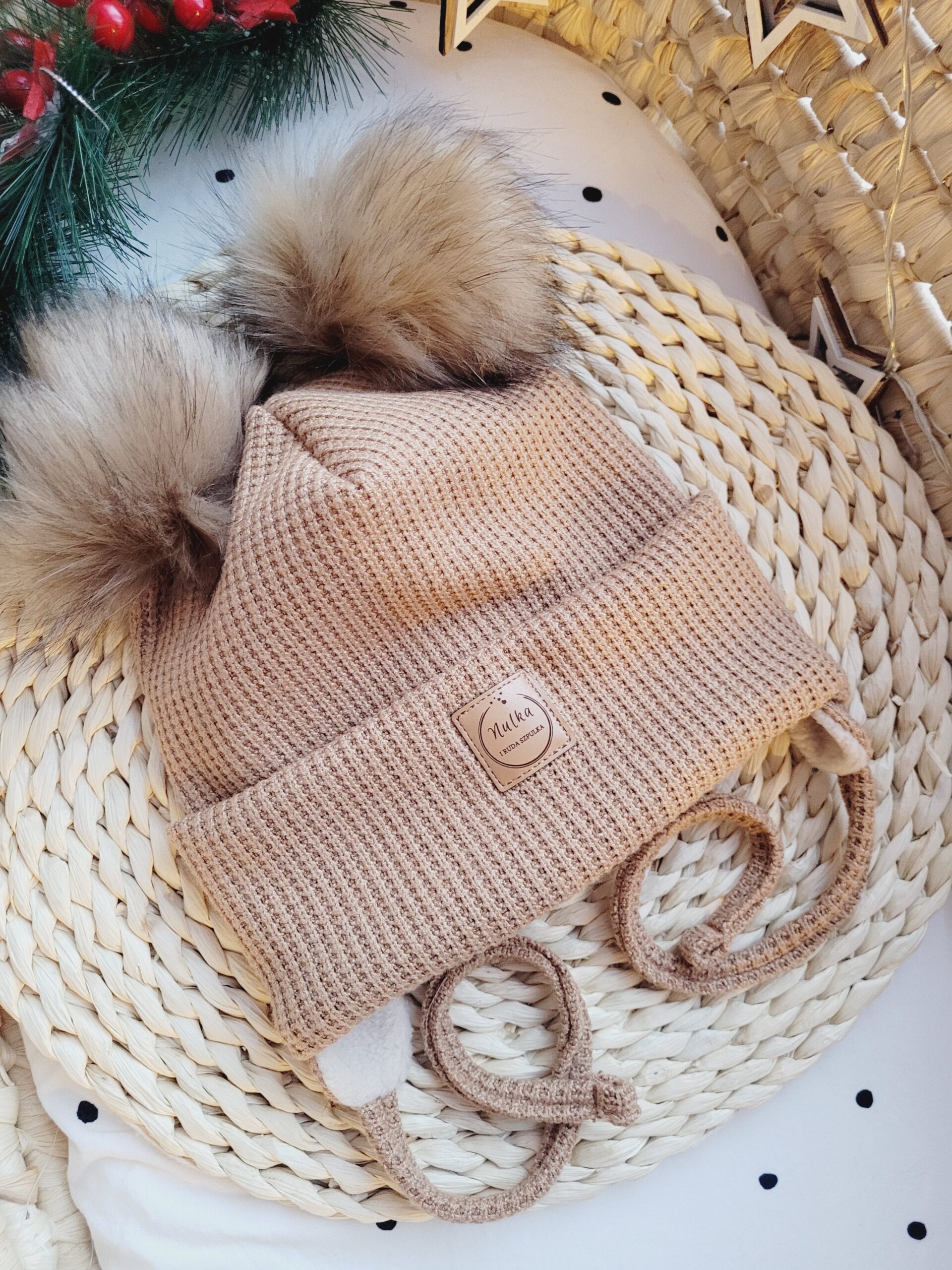 Odkryj nasz uroczy komplet zimowy, stworzony z miękkiej i przyjemnej w dotyku dzianiny sweterkowej w eleganckim karmelowym odcieniu. Ten wyjątkowy zestaw doskonale sprawdzi się zarówno dla chłopców, jak i dziewczynek. Czapka w stylu beanie dostępna jest w wersji prostej lub z wywinięciem, a jej ozdobą są ręcznie robione pompony w wybranym przez Ciebie kolorze.