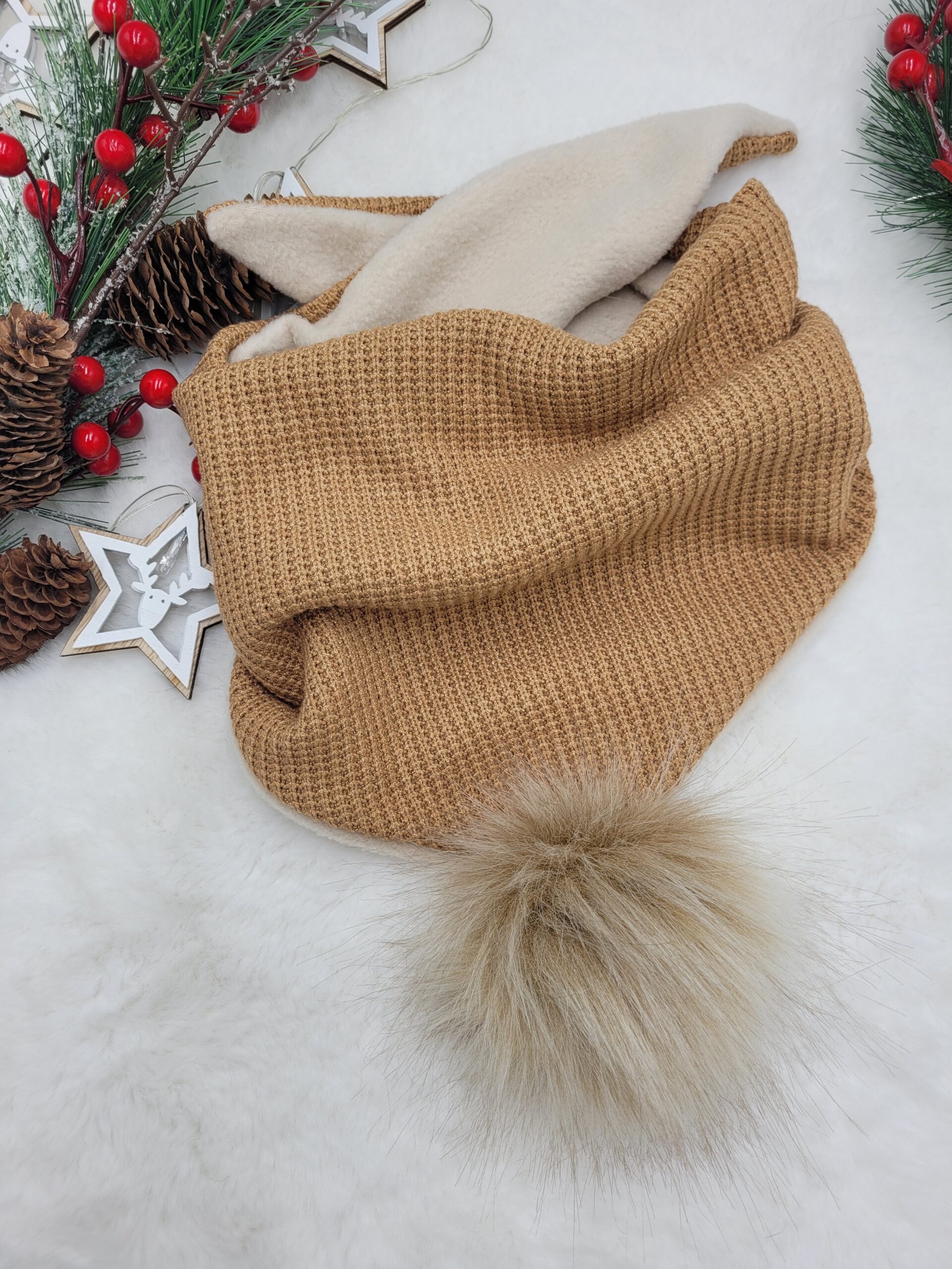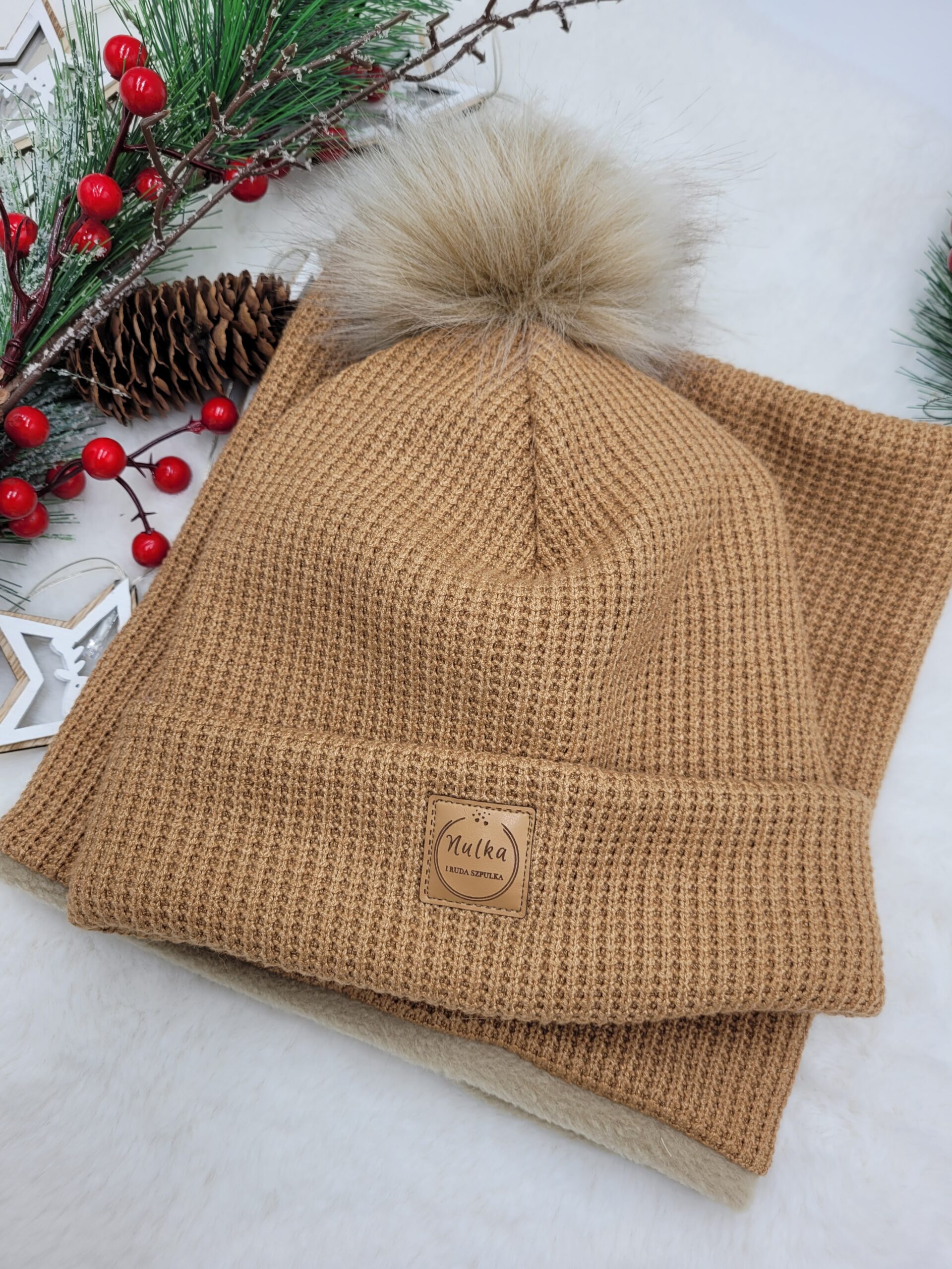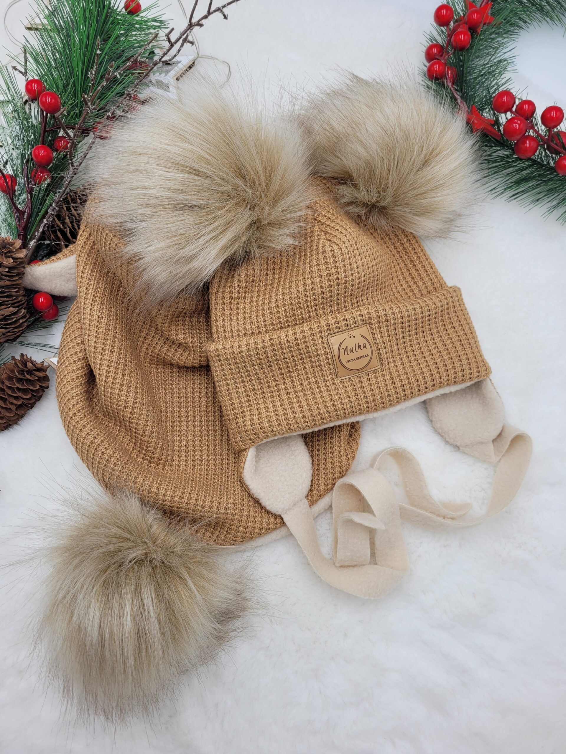 Czapka z ręcznie robionymi pomponami w komplecie z szalikiem, kominem lub chustą wiązaną w rozmiarach 36-56, kolor karmel.