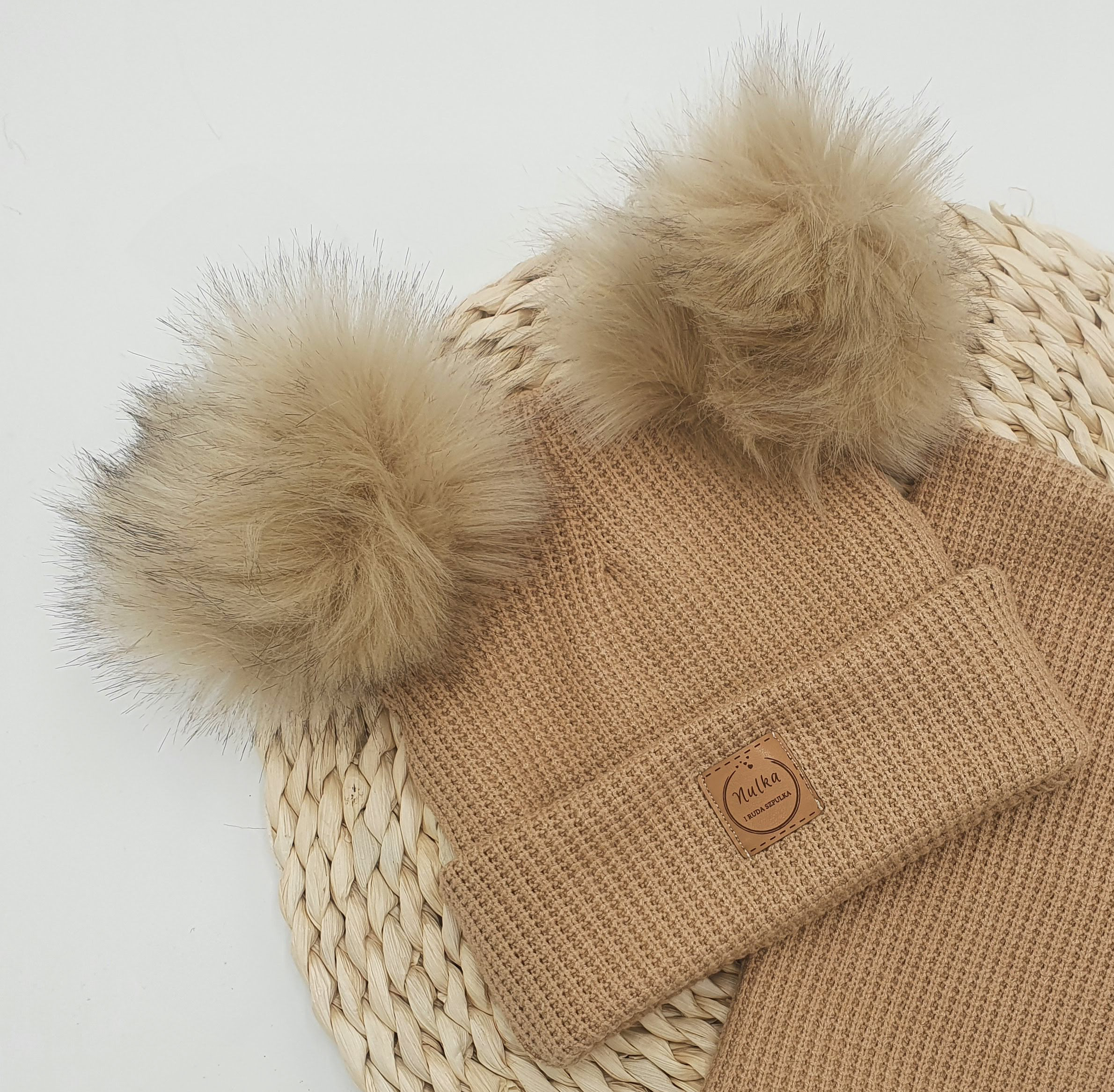 Odkryj nasz uroczy komplet zimowy, stworzony z miękkiej i przyjemnej w dotyku dzianiny sweterkowej w eleganckim karmelowym odcieniu. Ten wyjątkowy zestaw doskonale sprawdzi się zarówno dla chłopców, jak i dziewczynek. Czapka w stylu beanie dostępna jest w wersji prostej lub z wywinięciem, a jej ozdobą są ręcznie robione pompony w wybranym przez Ciebie kolorze.