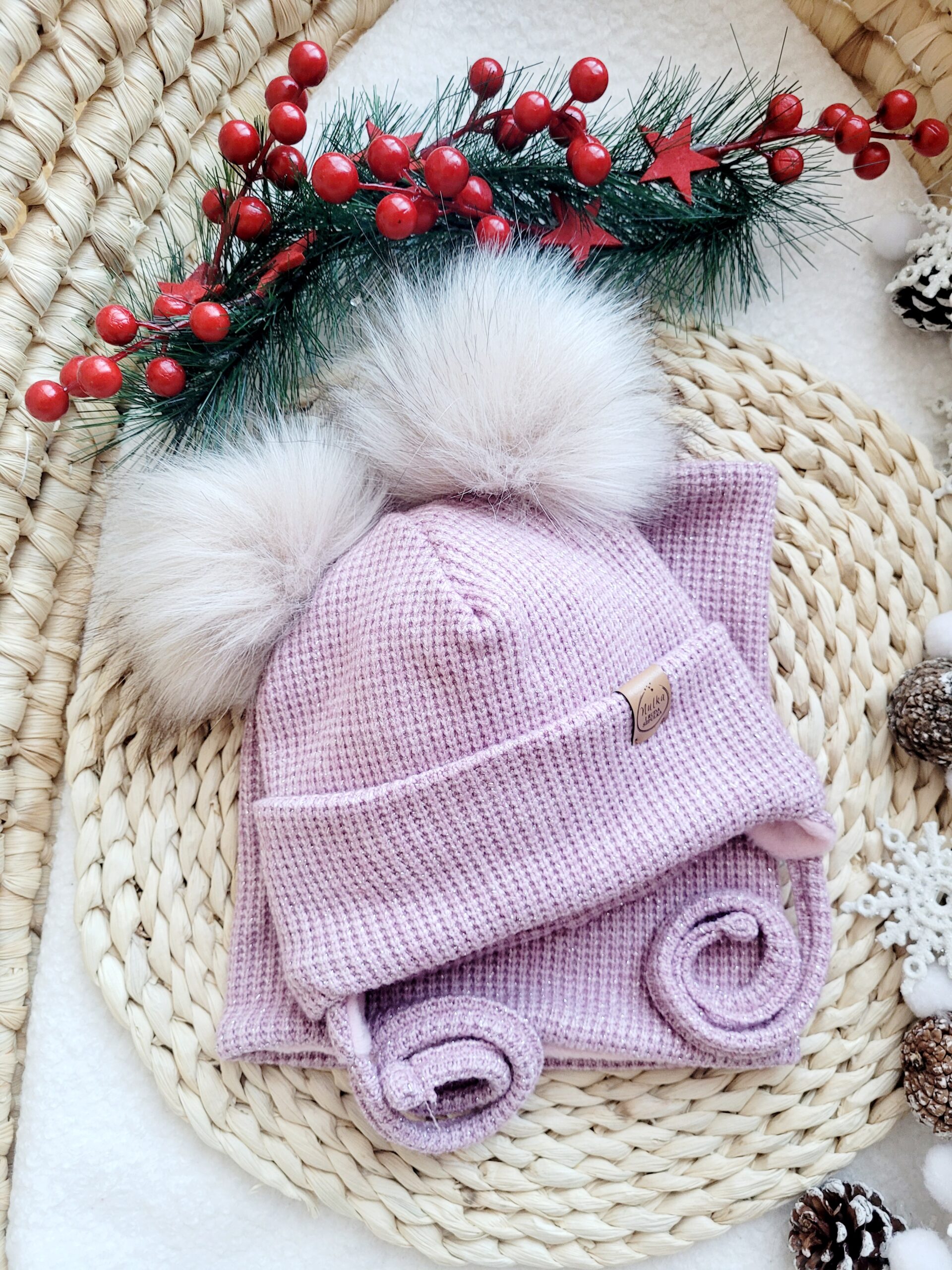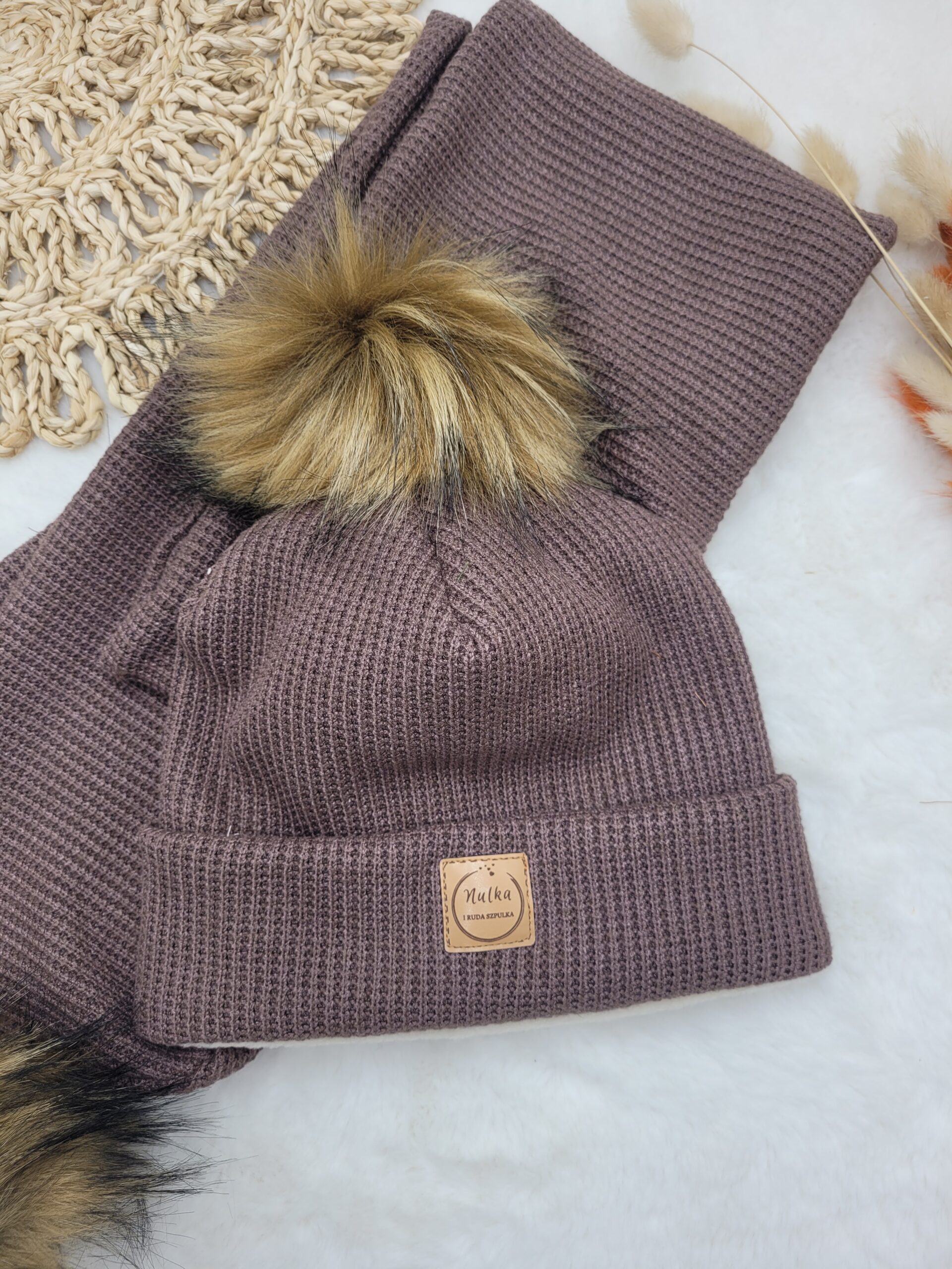 Odkryj nasz uroczy komplet zimowy, stworzony z miękkiej i przyjemnej w dotyku dzianiny sweterkowej w wybranym odcieniu. Ten wyjątkowy zestaw doskonale sprawdzi się zarówno dla chłopców, jak i dziewczynek. Czapka w stylu beanie dostępna jest w wersji prostej lub z wywinięciem, a jej ozdobą są ręcznie robione pompony w wybranym przez Ciebie kolorze.