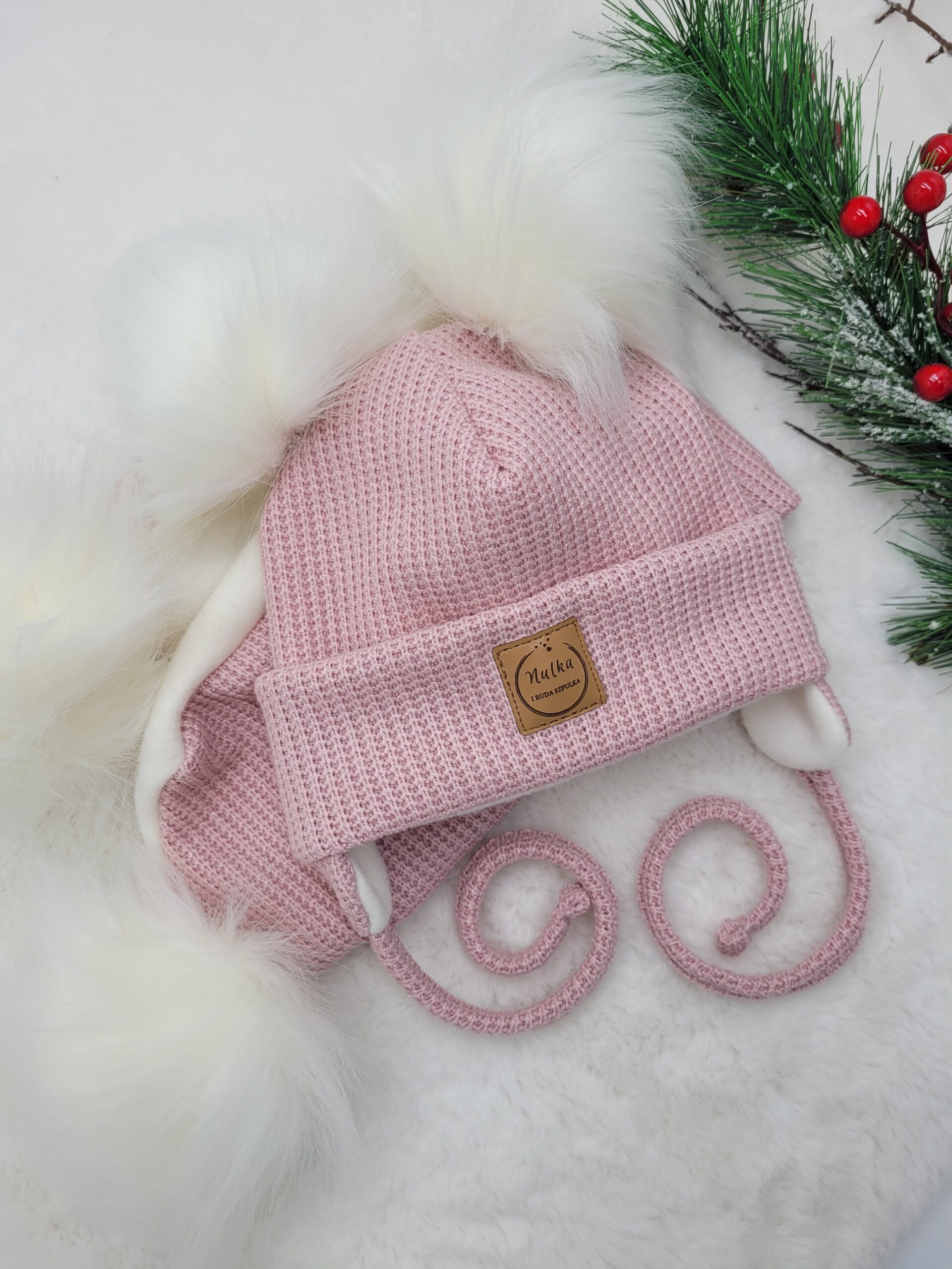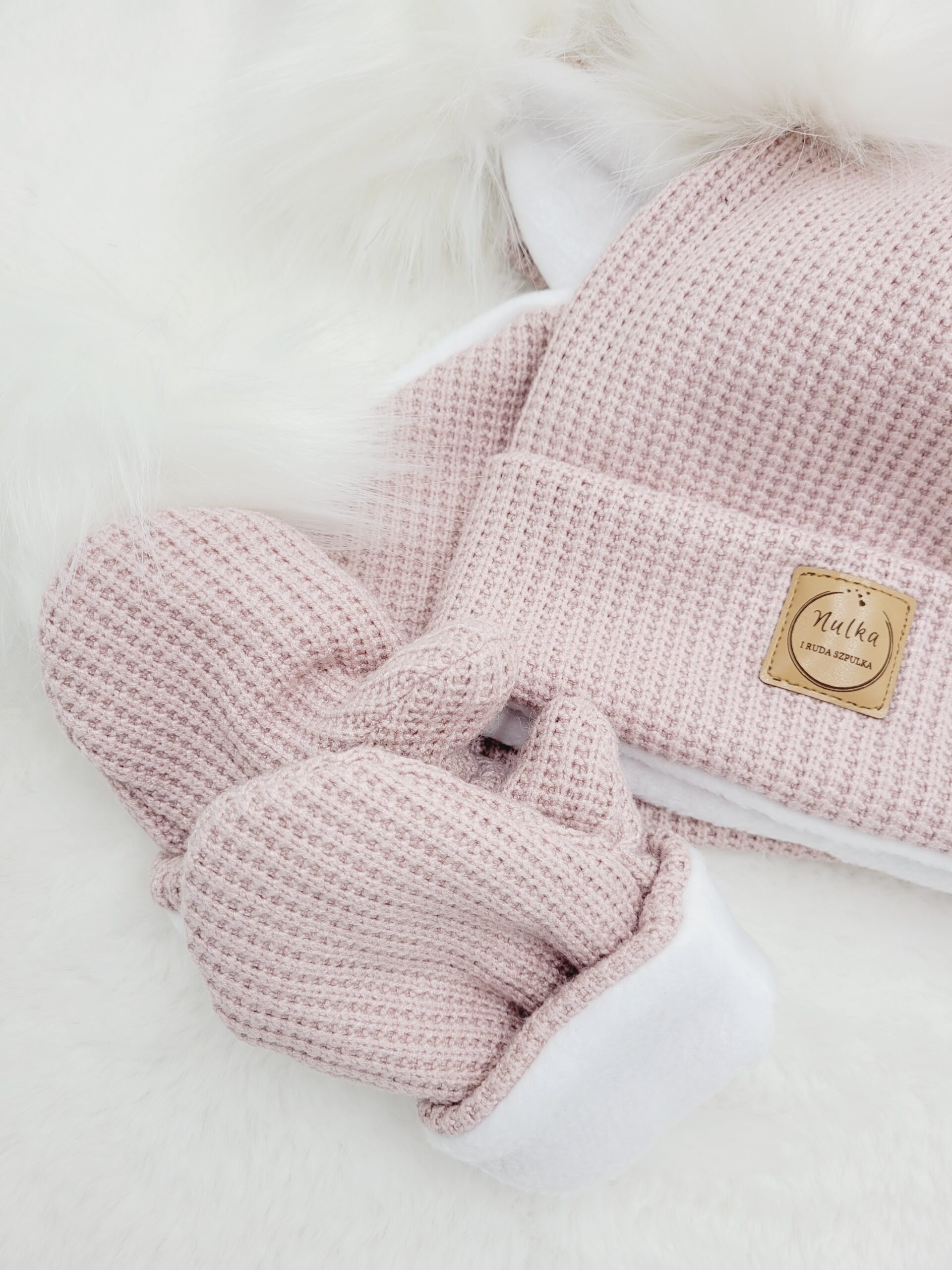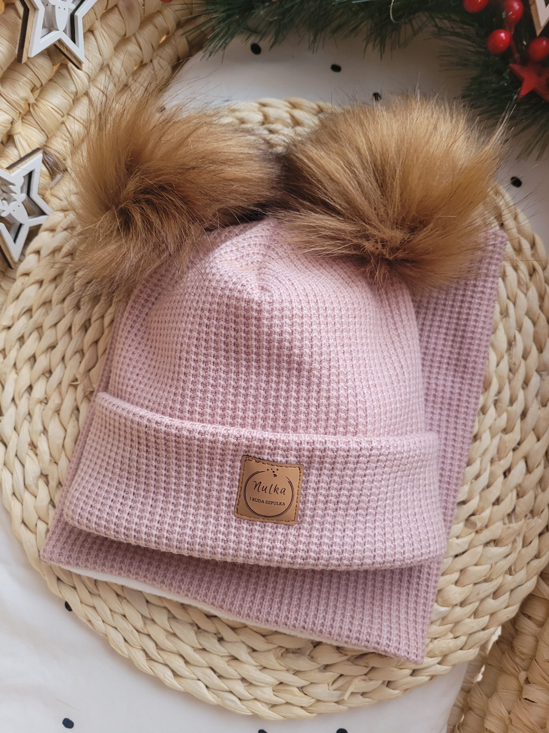Odkryj nasz uroczy komplet zimowy, stworzony z miękkiej i przyjemnej w dotyku dzianiny sweterkowej w kolorze pastelowy róż. Ten wyjątkowy zestaw doskonale sprawdzi się zarówno dla dziewczynek. Czapka w stylu beanie dostępna jest w wersji prostej lub z wywinięciem, a jej ozdobą są ręcznie robione pompony w wybranym przez Ciebie kolorze.