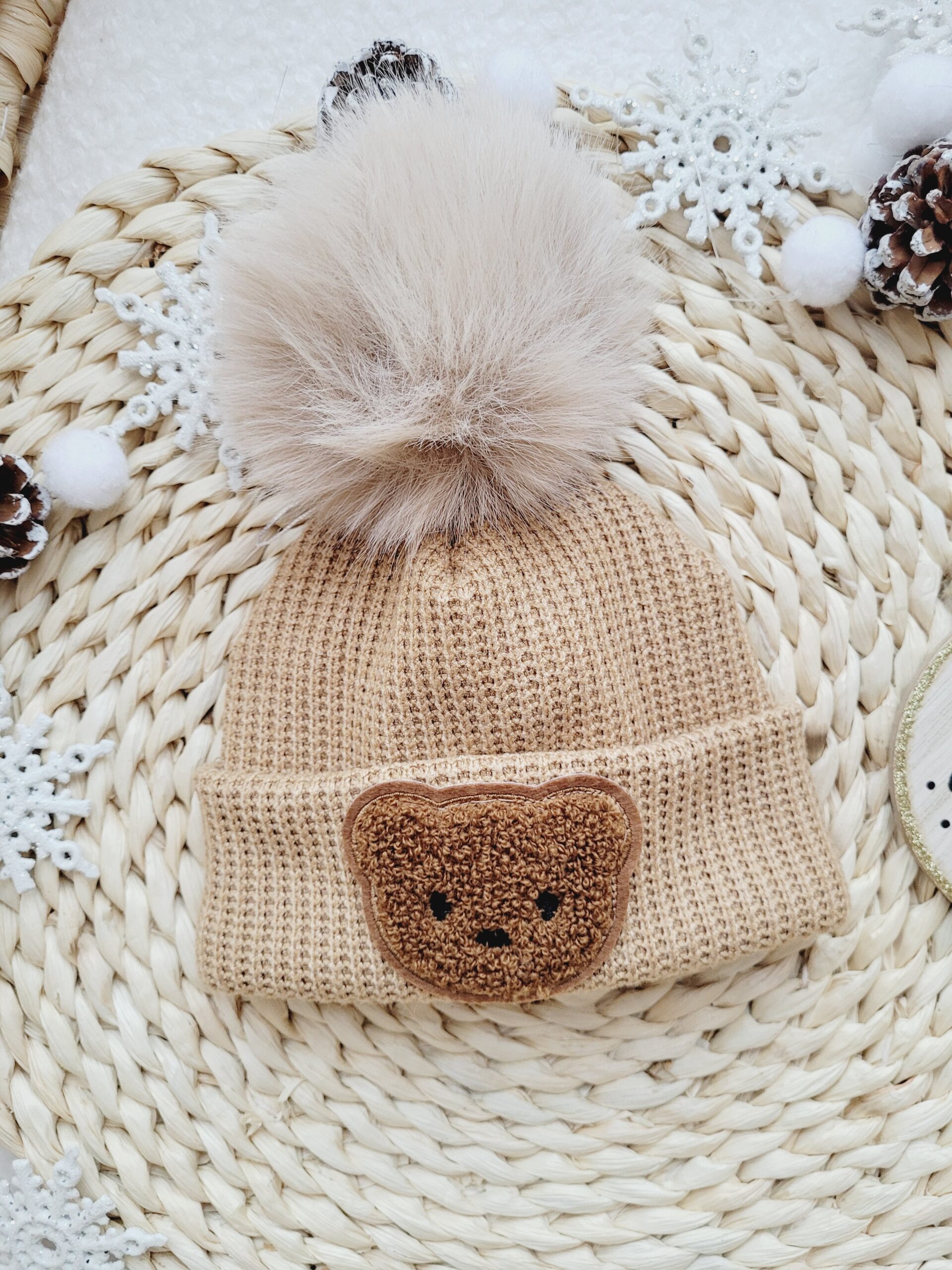 Komplet zimowy z naszywką misia i pomponami – ciepło i urok w jednym!